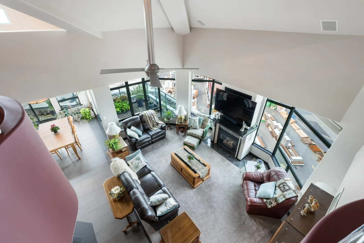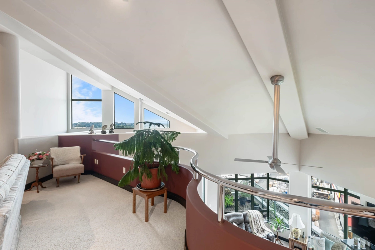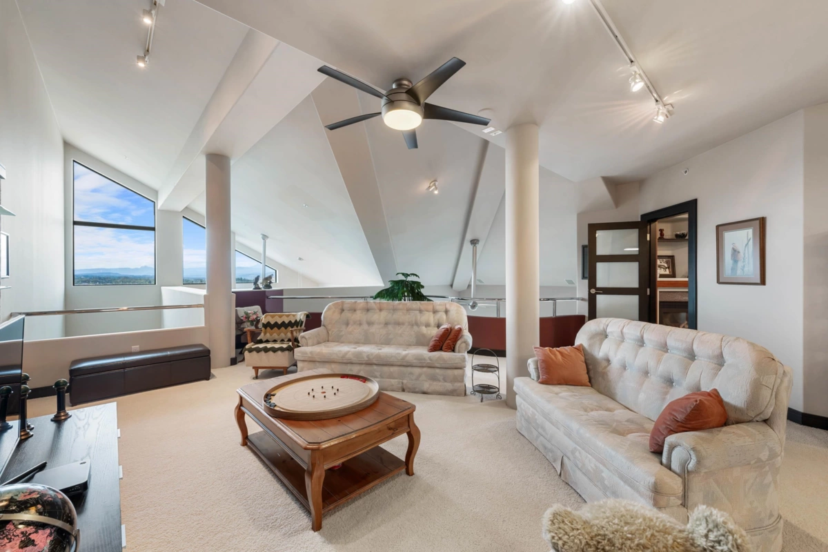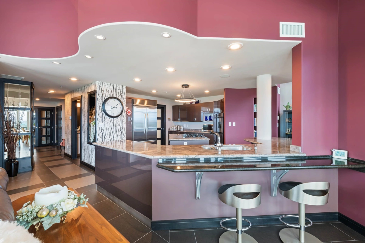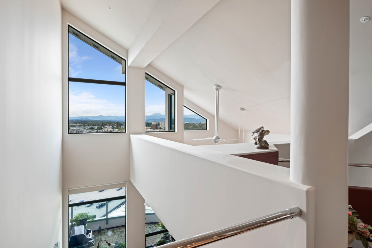 Gorgeous Executive Penthouse. Incredible sweeping views of downtown and endless mountains from this 2 level, 2,957 s/f, 3 bed plus den, 3 full bath. Luxurious high rise suite. Beautiful bright spacious home with impressive 25 ft vaulted ceilings. 4 balconies, 2 gas fireplaces, electric blinds in the livingroom. Spiral staircase. Kitchen is a chef's dream with large center island with gas cooktop. Huge built in fridge, built in double ovens & quartz counter-tops. Highest quality finish thru out. Totally updated. Central a/c. 2 underground side by side parking spaces near elevator lobby. Large private storage room. Resort like amenities. Indoor pool, hot tub, gym, library, games room, workshop and guest suite. Very well maintained complex. Truly impressive. Bring your fussiest buyers.