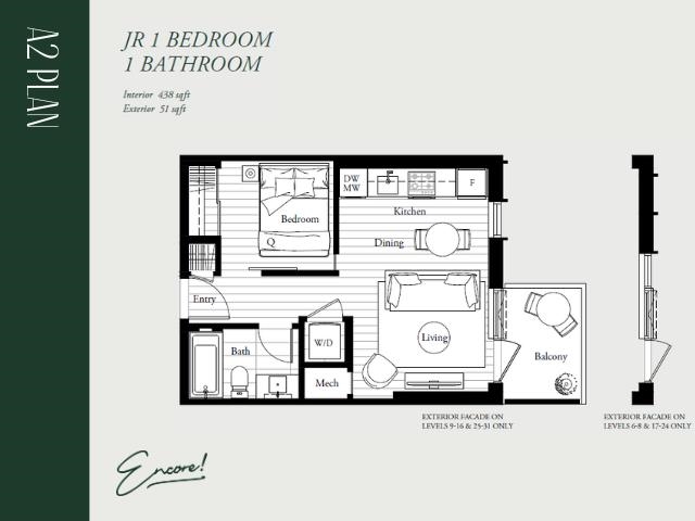 This spacious junior 1 bedroom home at Fraser Mills offers 438 sf of interior living space and a 51 sf balcony. Enjoy the morning sun and mountain views with East exposure on level 17. The home features 8’8” ceilings, durable laminate flooring, and efficient heating and cooling systems for year-round comfort. The kitchen is equipped with high performance Fisher & Paykel appliances, quartz countertops, and a porcelain tile backsplash. Enjoy resident-only amenities at Encore, including a fitness centre, entertainment lounge with a catering kitchen, karaoke room, outdoor podium with greenspace, BBQ, fireside lounge, and more.