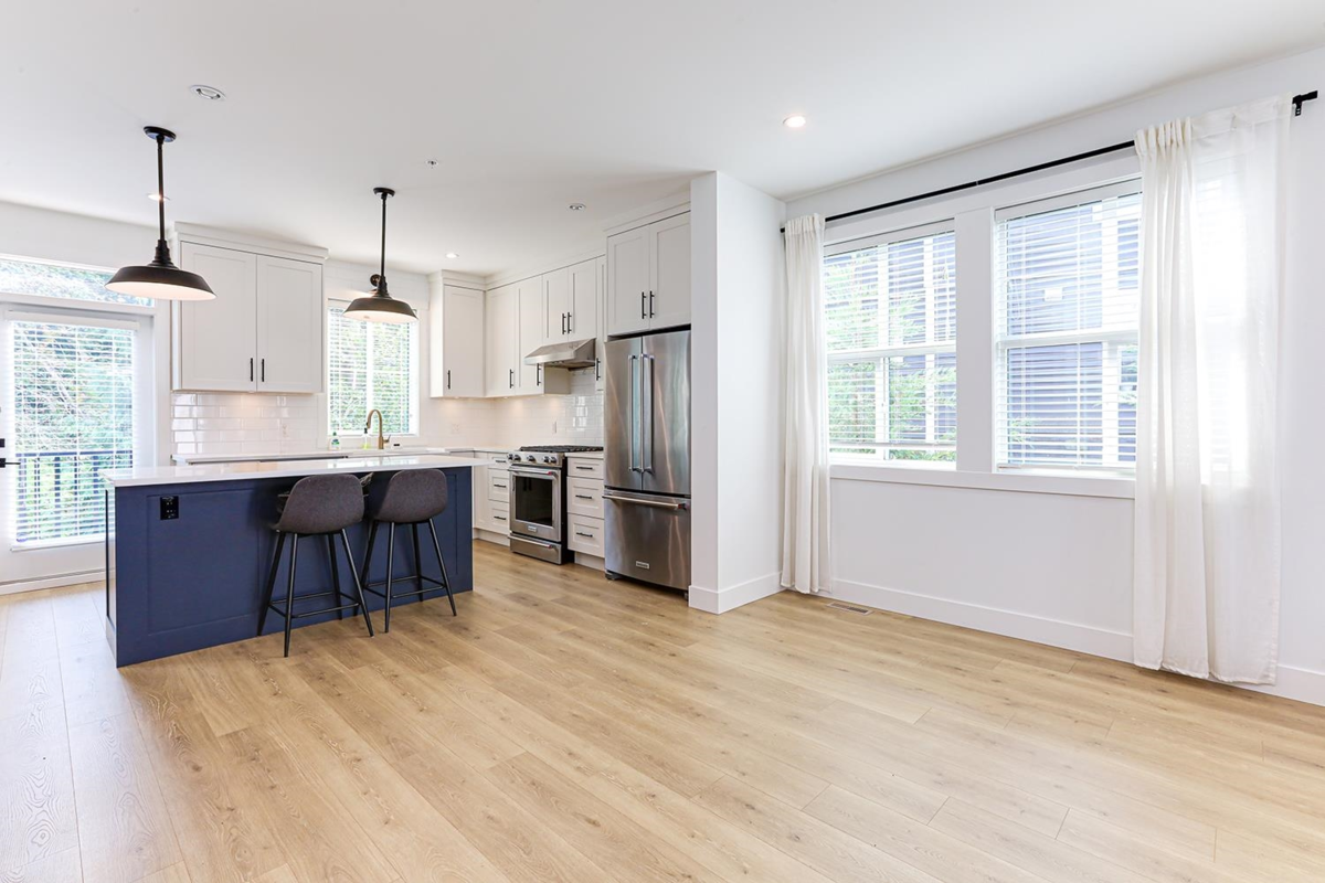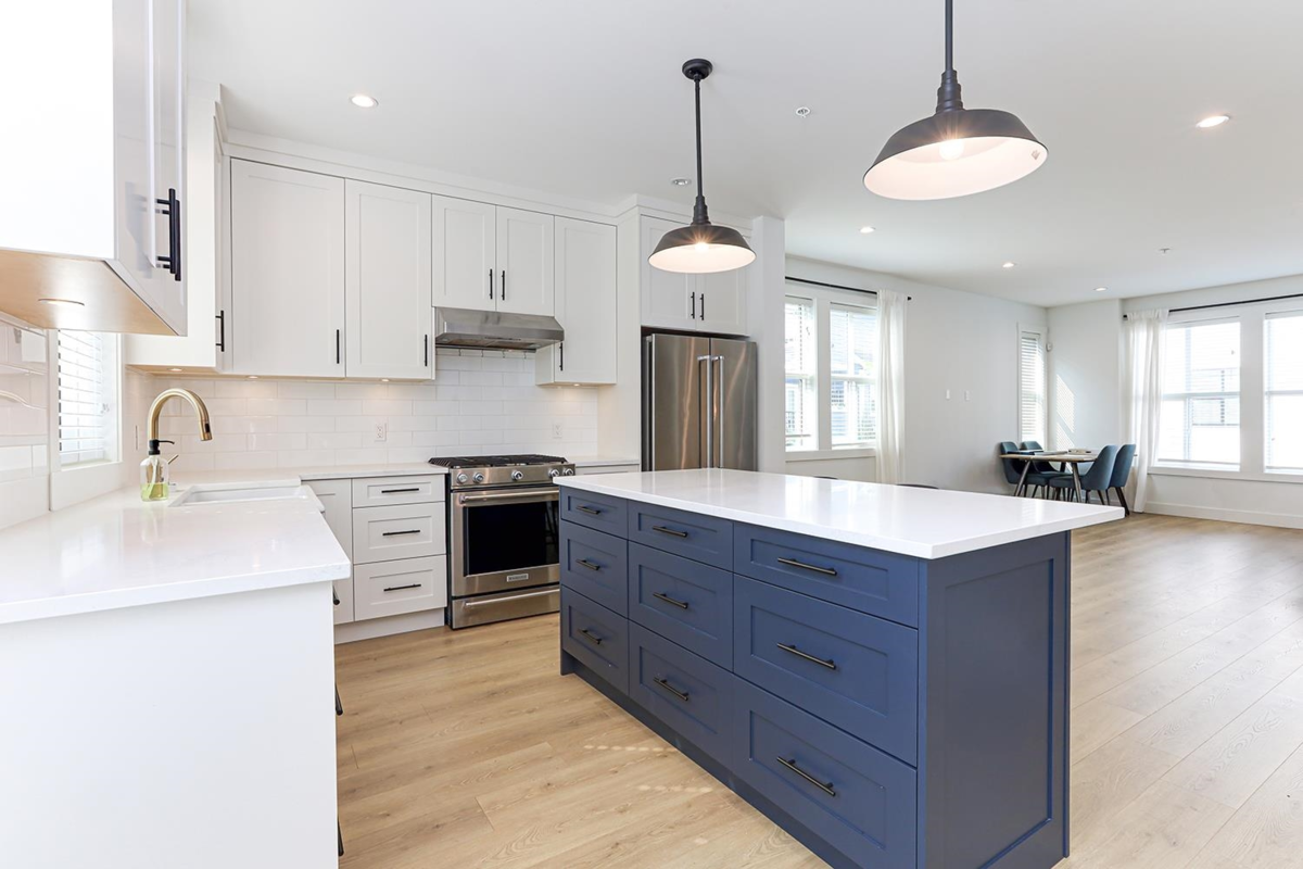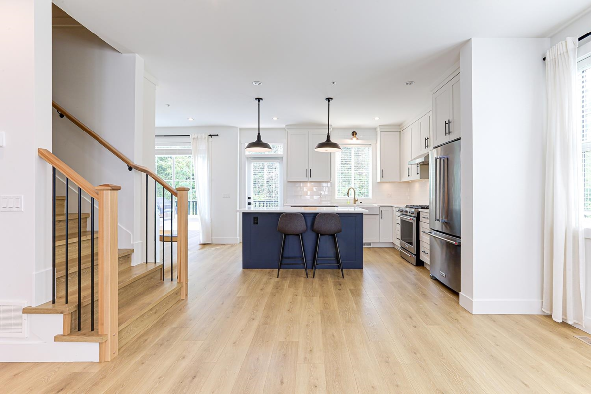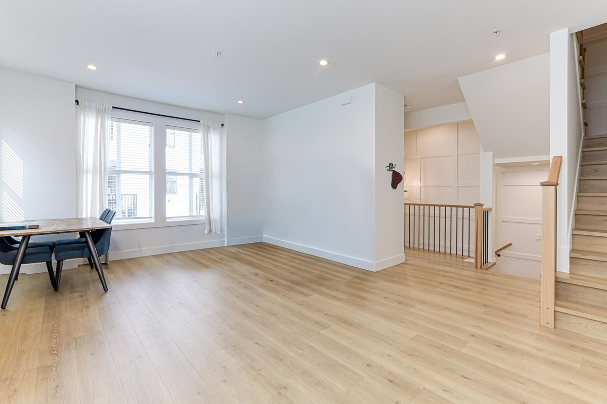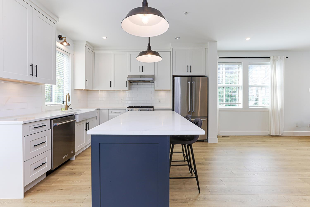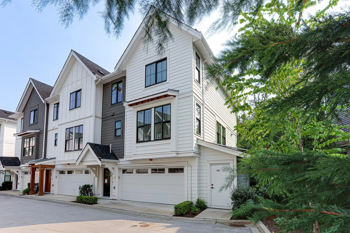 Welcome to HOMESTEAD—this 2021-built 3-storey townhome offers 1,792 SF of elegant living with 4 beds/4 baths, and a side-by-side double car garage. Corner unit! Enjoy luxury finishings including intricately designed feature walls with crown-style detailing, vaulted ceilings in the primary bedroom, and spa-inspired bathrooms. The open-concept main floor features KitchenAid S/S appliances and A/C for year-round comfort. Step out to a spacious, fully fenced backyard backing onto a tranquil greenbelt—perfect for privacy and entertaining. Bedroom with full bath on below level is ideal for guests or office. A rare blend of style, space, and serenity! Walking dist. to parks, trails, schools, transit, & mins to Hwy 1. Low strata fees and pet-friendly. Openhouse Sat Nov. 22, 2-4 pm