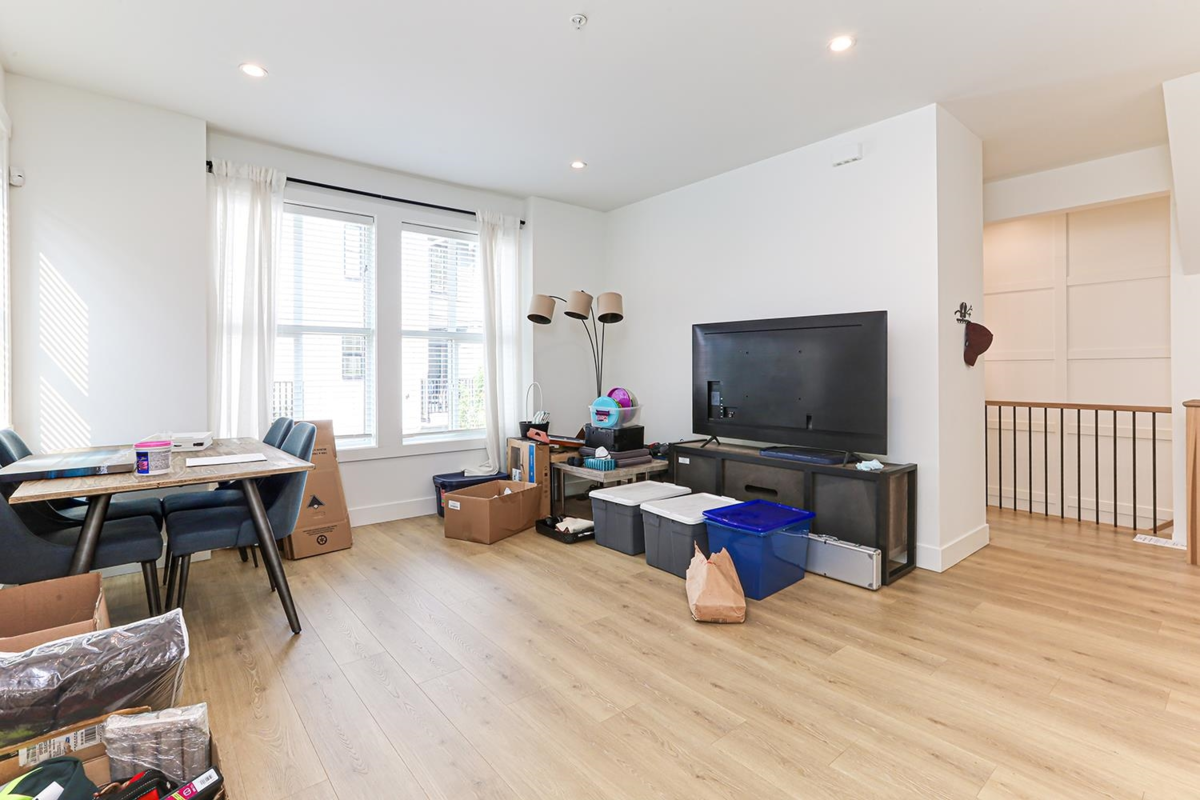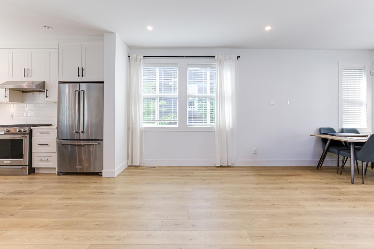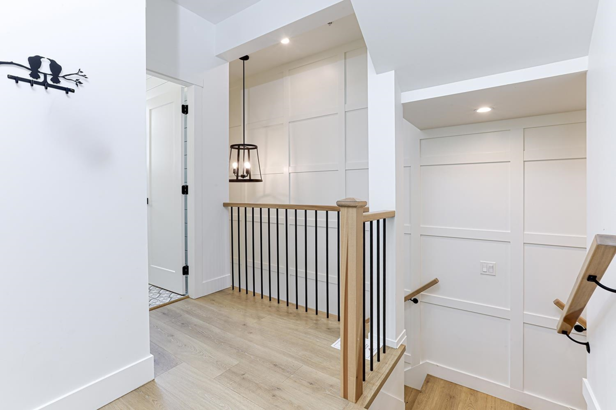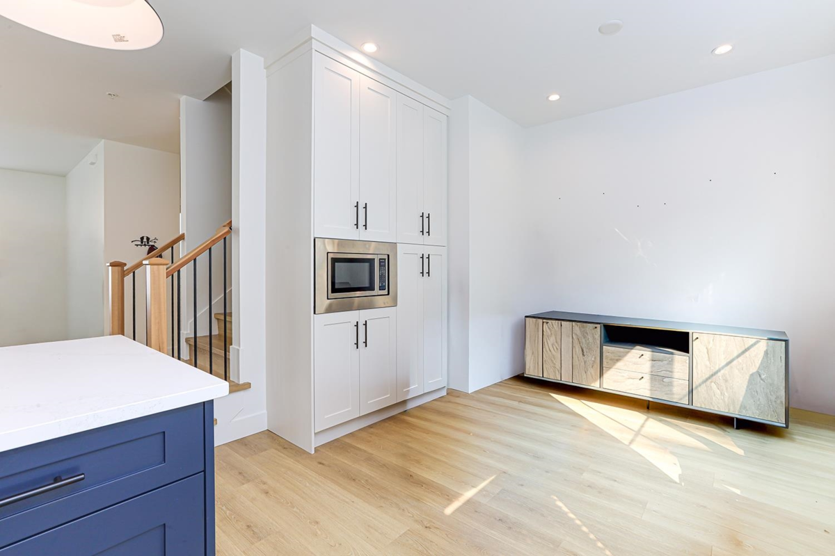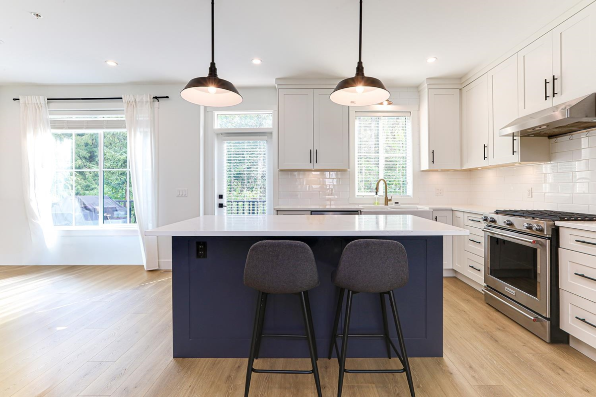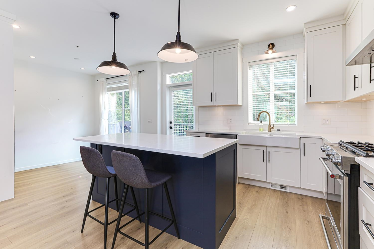 Welcome to HOMESTEAD—this 2021-built 3-storey townhome offers 1,792 SF of elegant living with 4 beds/4 baths, and a side-by-side double car garage. Corner unit! Enjoy luxury finishings including intricately designed feature walls with crown-style detailing, vaulted ceilings in the primary bedroom, and spa-inspired bathrooms. The open-concept main floor features KitchenAid S/S appliances and A/C for year-round comfort. Step out to a spacious, fully fenced backyard backing onto a tranquil greenbelt—perfect for privacy and entertaining. Bedroom with full bath on below level is ideal for guests or office. A rare blend of style, space, and serenity! Walking dist. to parks, trails, schools, transit, & mins to Hwy 1. Low strata fees and pet-friendly. Openhouse Sat Nov. 22, 2-4 pm