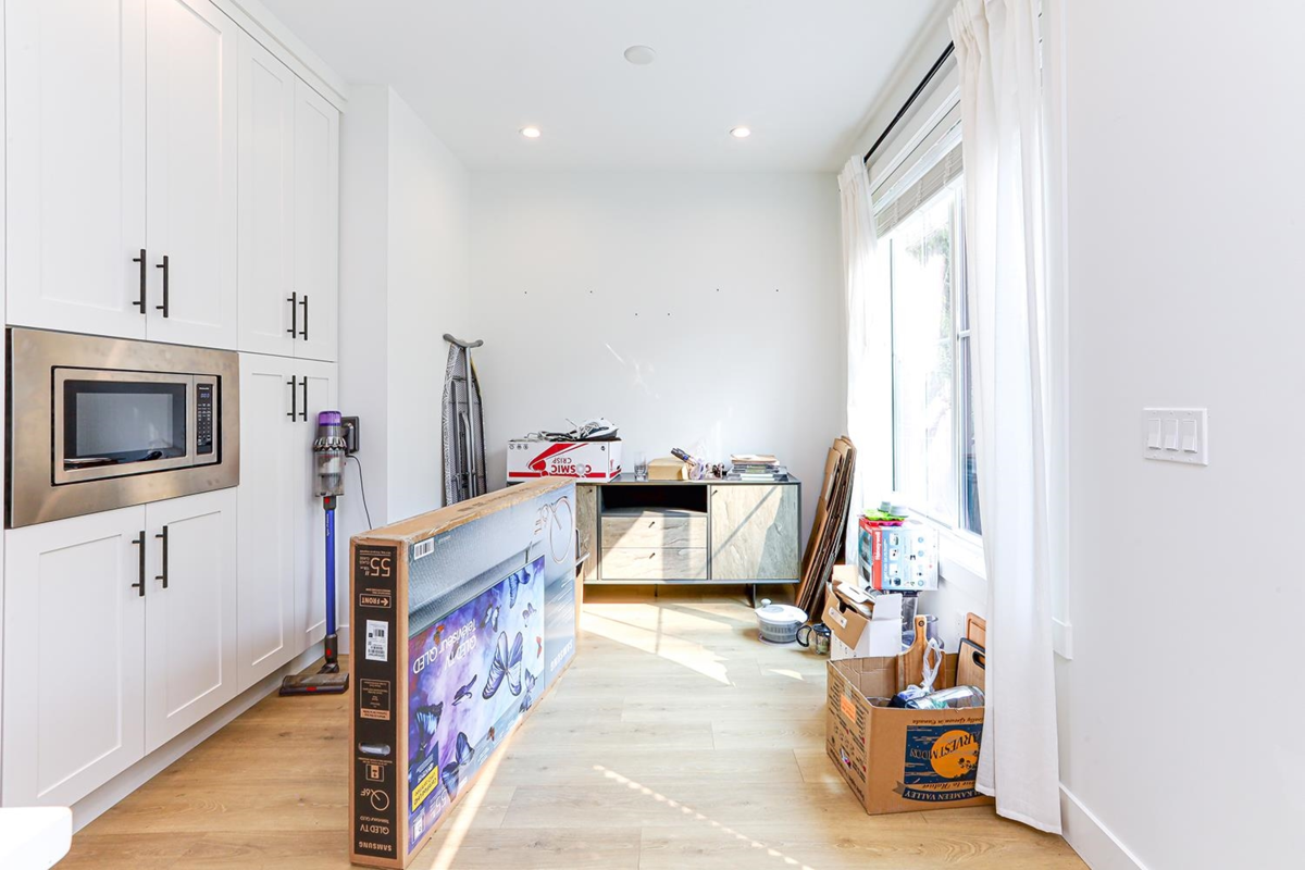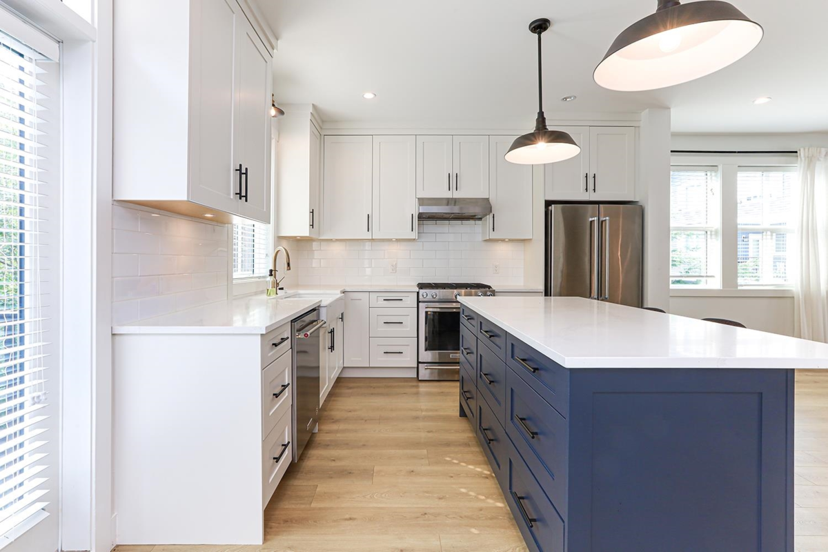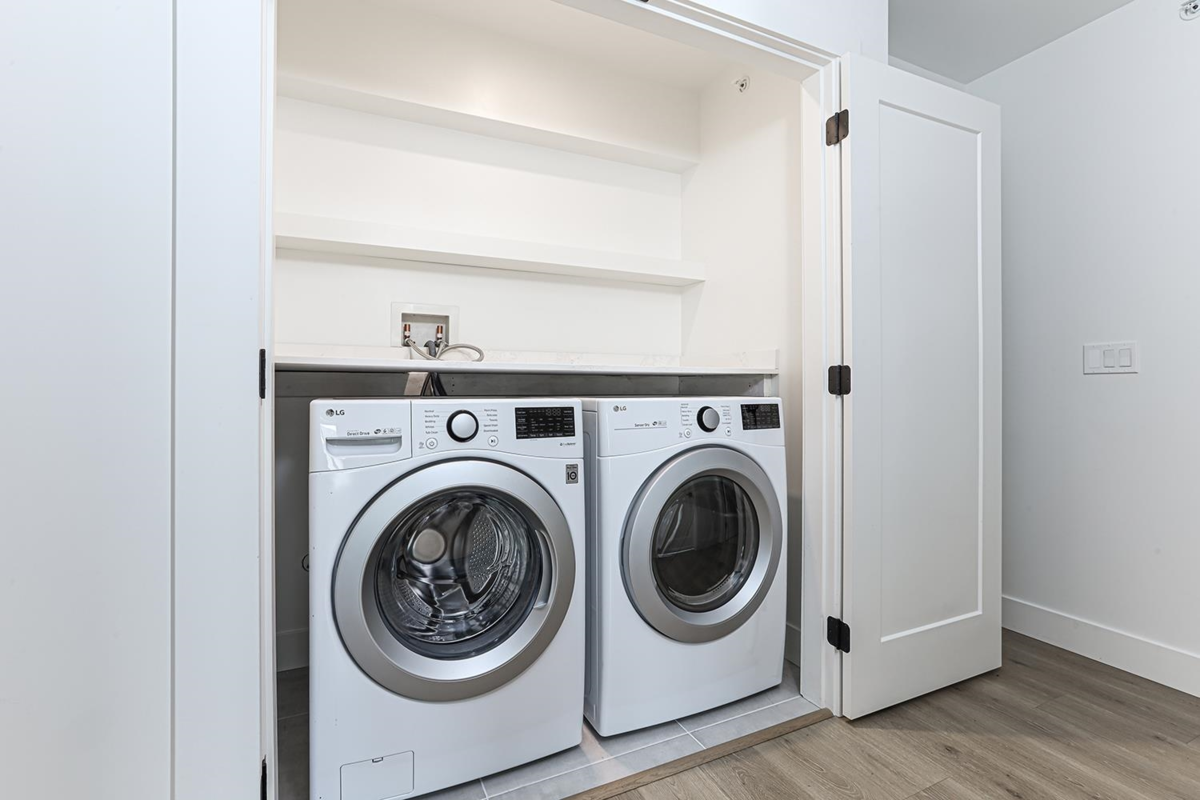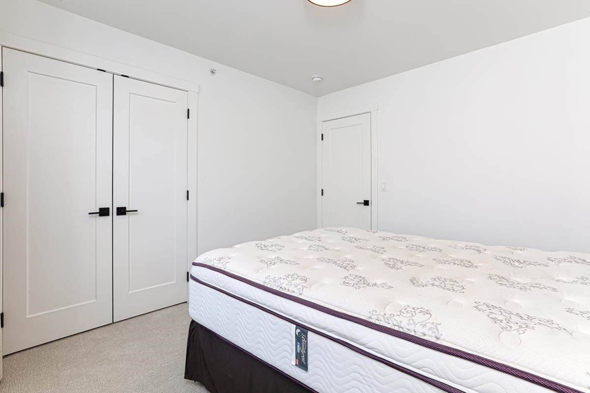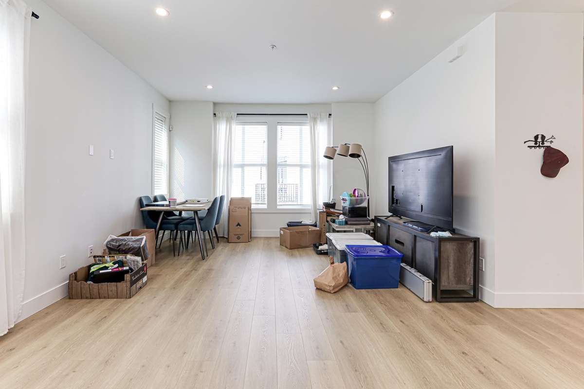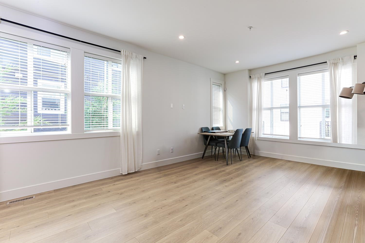 Welcome to HOMESTEAD—this 2021-built 3-storey townhome offers 1,792 SF of elegant living with 4 beds/4 baths, and a side-by-side double car garage. Corner unit! Enjoy luxury finishings including intricately designed feature walls with crown-style detailing, vaulted ceilings in the primary bedroom, and spa-inspired bathrooms. The open-concept main floor features KitchenAid S/S appliances and A/C for year-round comfort. Step out to a spacious, fully fenced backyard backing onto a tranquil greenbelt—perfect for privacy and entertaining. Bedroom with full bath on below level is ideal for guests or office. A rare blend of style, space, and serenity! Walking dist. to parks, trails, schools, transit, & mins to Hwy 1. Low strata fees and pet-friendly. Openhouse Sat Nov. 22, 2-4 pm