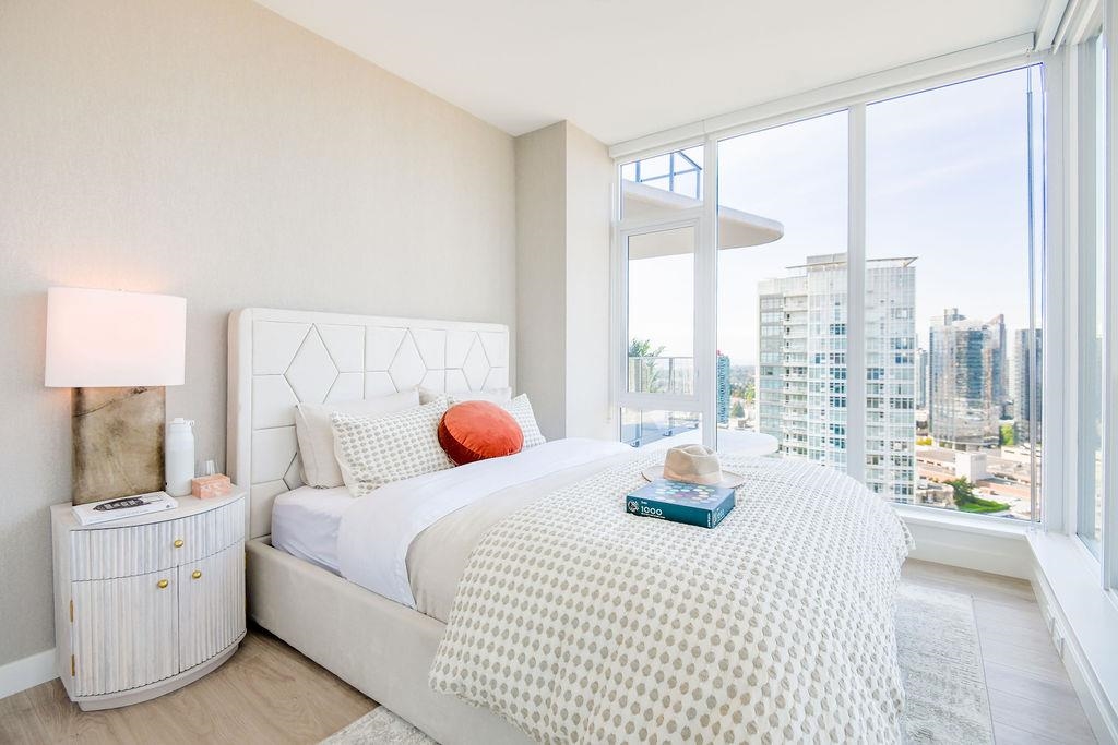 Welcome to Riviera on the Park by Ledingham McAllister. Bathed in warm afternoon light, this bright southwest-facing 2-bedroom home at Riviera captures stunning sunset views through expansive windows in both bedrooms and living areas. The warm and bright interiors features rich two-tone cabinetry in the kitchen and baths. Designed for comfort and style, the open-concept living area flows seamlessly onto a private balcony, and the adaptable layout provides a larger main bathroom. With shops, entertainment, restaurants, and services just steps away-and the heart of Metrotown one block from your door-this home truly embodies urban convenience with elevated design. Move in today!
