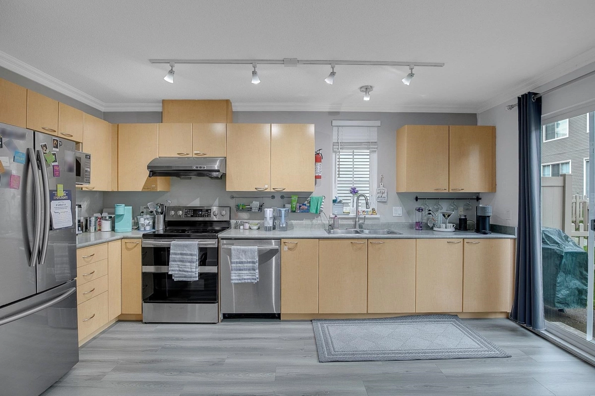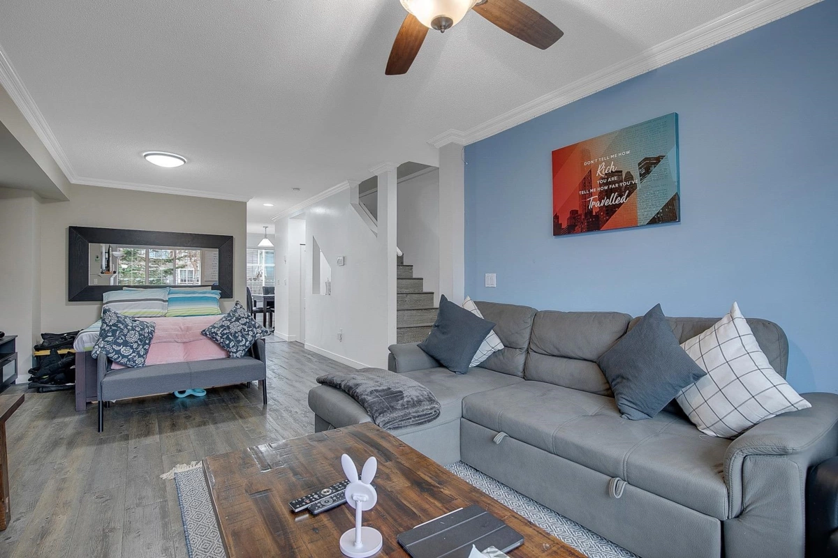 CORNER UNIT – 3 bedroom, 2 bathroom town home features a modern open floor plan. 3 bedrooms upstairs with in-suite laundry gives you comfort for the entire family. NEW FLOORING, Roof Done in 2024 & Hot Water Tank in 2021. Spacious kitchen with large formal dining area and living room with gas fireplace. THE BEST LAYOUT WITH WALKOUT PATIO FROM THE KITCHEN FOR A FUNCTIONAL USEFUL BACKYARD SPACE & Private fenced yard perfect for entertaining and barbecues with family and friends. Ample green space, access to parks, recreation and transit, playground. As a bonus, this home also features a double tandem garage and storage area! Call today to view.
