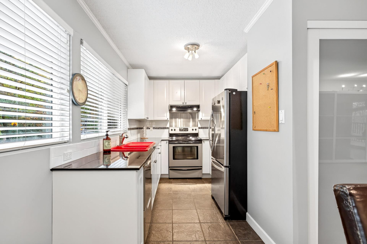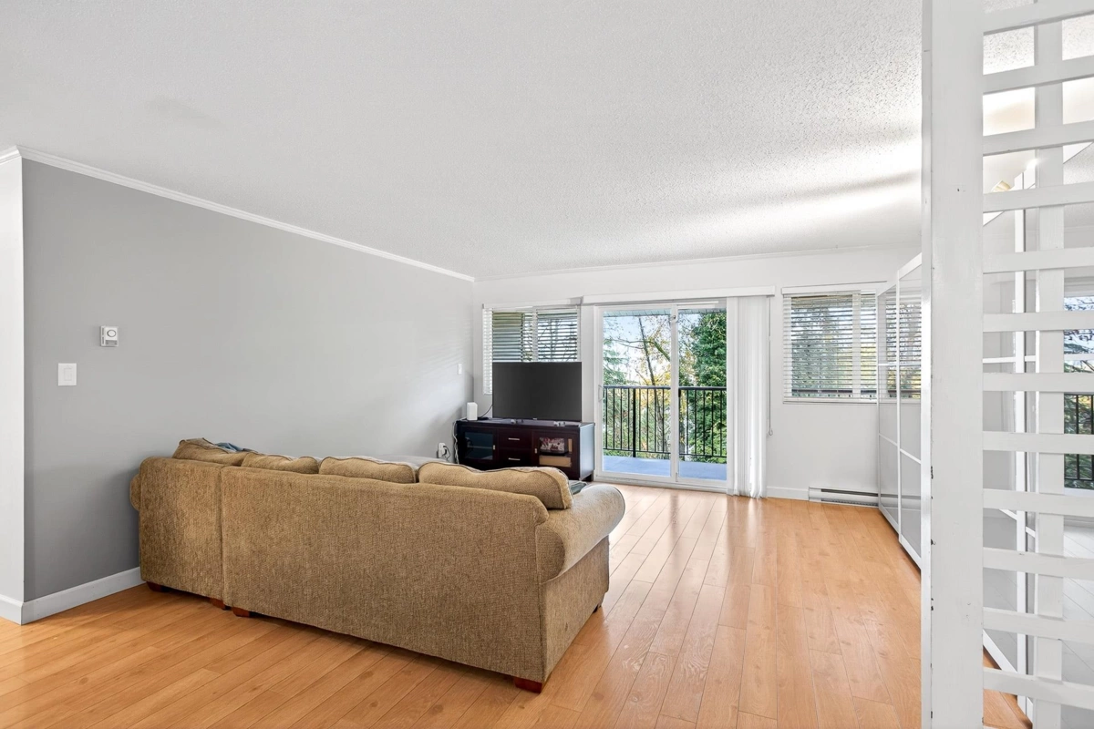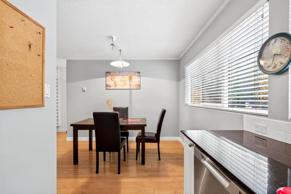 Lovely updated 2-bed, 1.5-bath one-level townhome in desirable College Park. Bright open floor plan with a spacious living room and large windows leading to a private balcony overlooking a peaceful greenbelt. The updated kitchen (2010) features granite countertops, modern cabinets, backsplash, newer stainless steel appliances, and flooring. Primary bedroom offers a walk-in closet and rare 2-piece ensuite. Newer laminate flooring, blinds, and windows throughout. Bonus large storage area—perfect for an office. Well-maintained complex with new roof (2009) and balconies (2011). Great location near Burnaby, SFU, schools, shopping, Barnet Hwy, and future Evergreen Line. Shows beautifully!