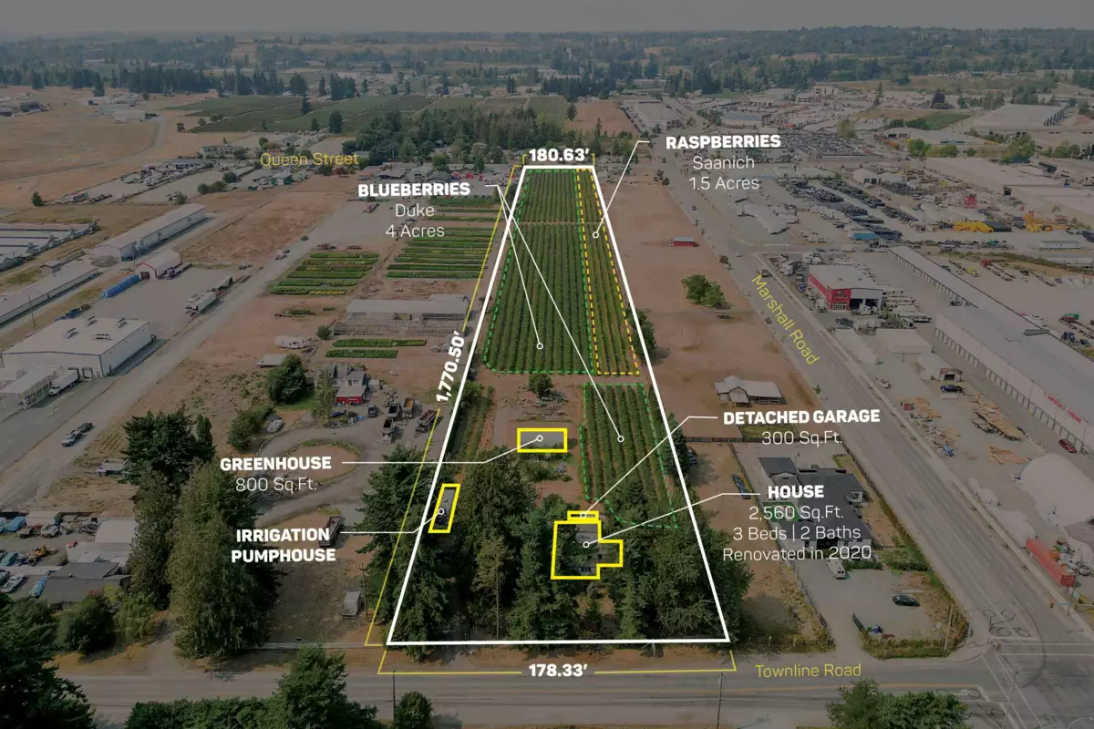 HOLDING OPPORTUNITY FOR INVESTORS: 7.44 ACRES IN SPECIAL STUDY AREA B - Abbotsford OCP has designated this land for Future Industrial due to its immediate proximity to the Airport and Highway 1. Must comply with existing agricultural zoning until the City of Abbotsford and Agricultural Land Commission (ALC) are in agreement for the property to be taken out of the Agricultural Land Reserve (ALR). Features a 2,560 SQFT Home (3 beds/2 baths), 300 SQFT Detached Garage, 800 SQFT Greenhouse, 4 Acres of Duke Blueberry, and 1.5 Acres of Saanich Raspberry. Frontage on both Townline Road and Queen Street, and is one parcel away from the Marshall Road Intersection. Fully serviced with City Water and Natural Gas. Call for more information.