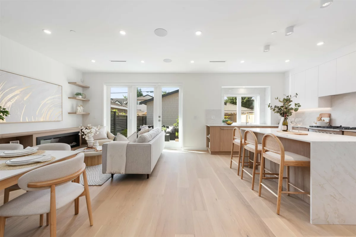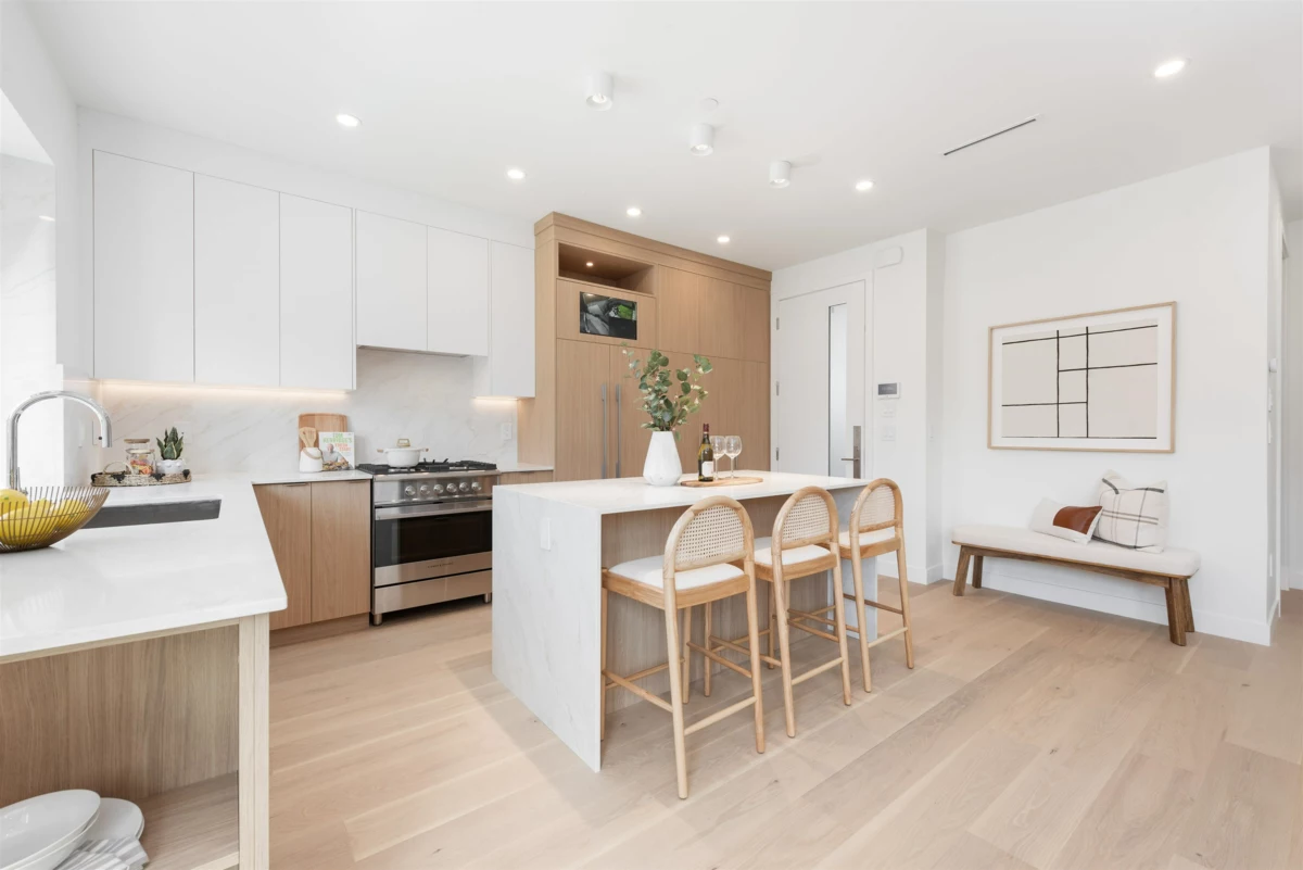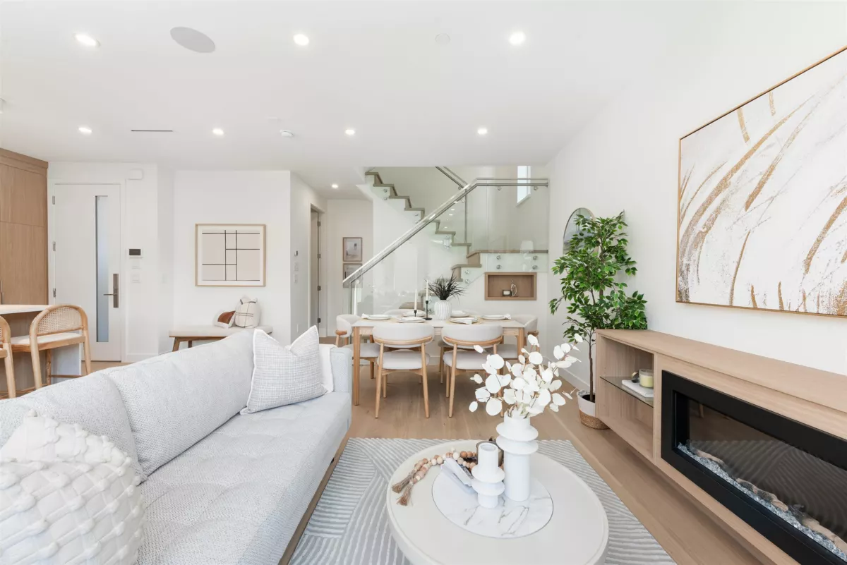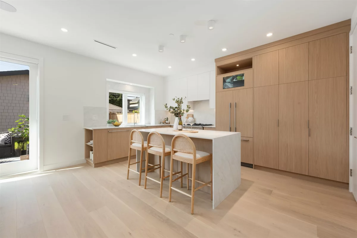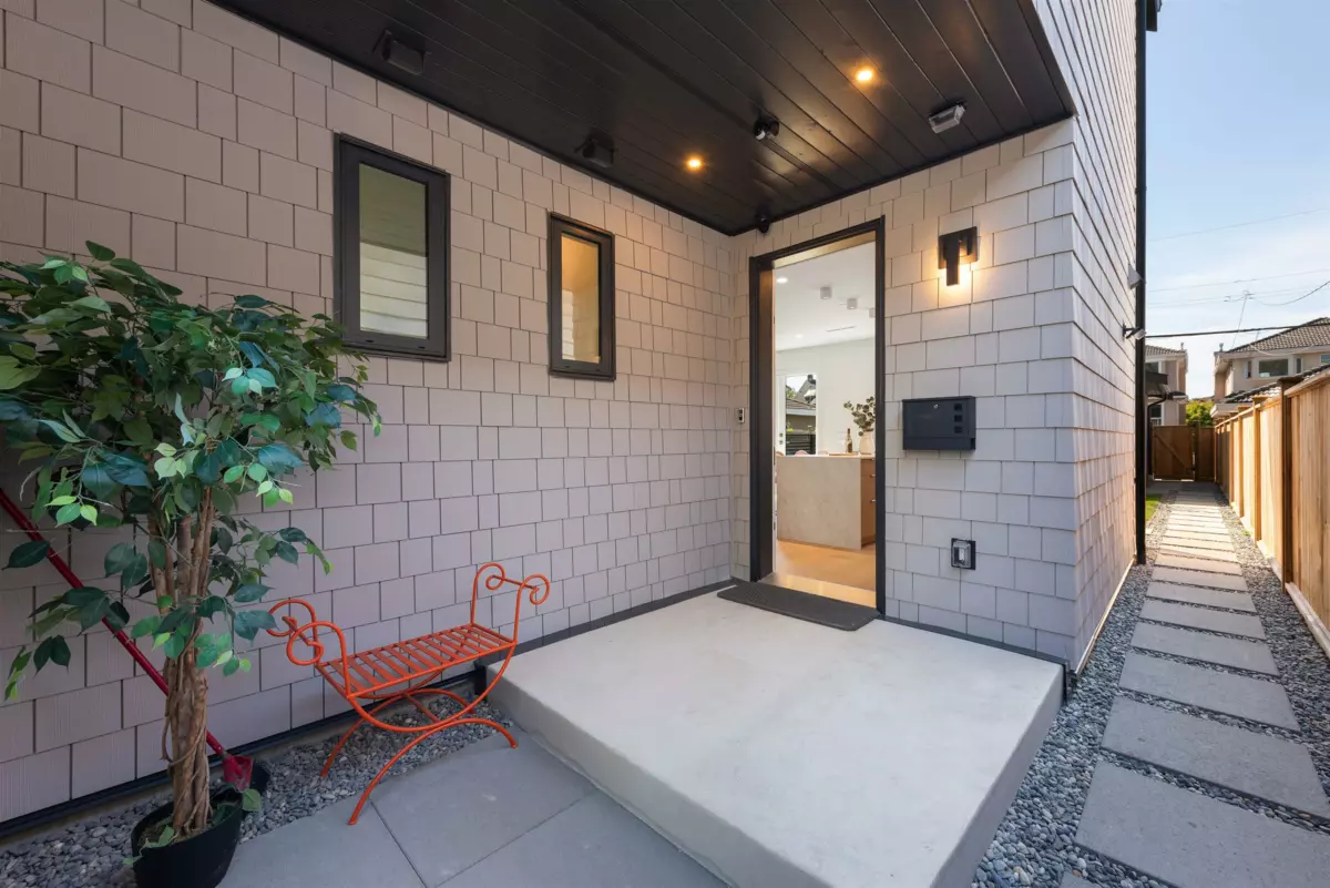 Nestled on a tranquil, tree-lined street in Arbutus-one of Vancouver's most prestigious neighborhoods. This newly built 1695sf duplex offers the perfect blend of luxury&convenience. Just moments from top public&private schools, UBC, cafés, restaurants, parks, shops&beaches. Open concept layout w/9-foot ceilings, wide-plank light oak flooring&oversized windows that flood the space w/natural light. The gourmet kitchen is a chef's dream, featuring a waterfall island, quartz countertops, extensive cabinetry&premium stainless-steel appliances. Upstairs, three spacious bedrooms, each w/its own ensuite, plus a den. Features include in-floor radiant heating with programable “Nest” thermostats, AC/heat pump, security system and a large private back yard and crawlspace.