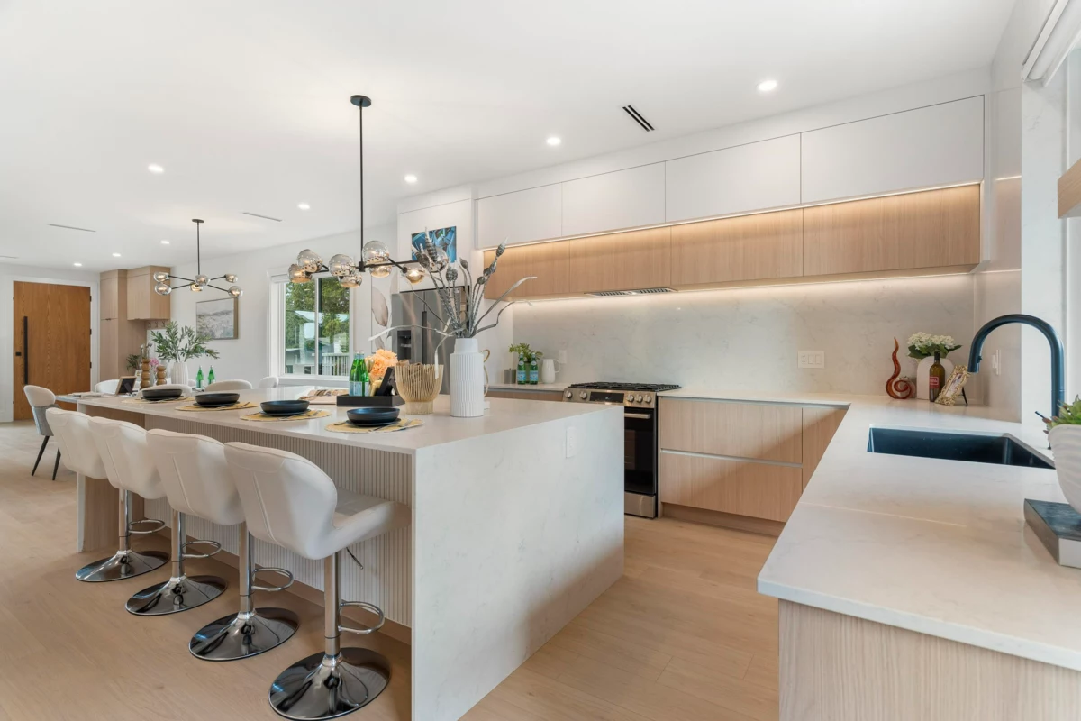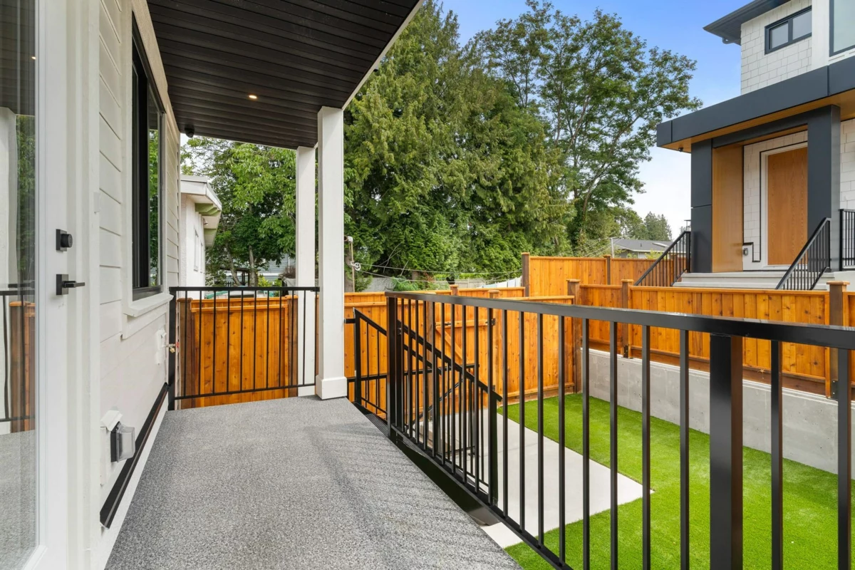 Welcome to this stunning brand-new half unit in the front side-by-side building in Burnaby Lake, ideally located on an oversized 50x207 ft lot. This beautifully designed home offers 3 spacious levels, featuring 5 bedrooms, 4 full bathrooms, and a large games room in the basement. The main floor boasts an open-concept layout with a modern kitchen, dining area, and powder room. Upstairs offers 3 bedrooms, 2 baths, and a private balcony off the primary bedroom. Below includes 2 bedrooms, a games room, full bath, rec room with bar sink, and private entry to the fenced backyard. Includes A/C, radiant heat, security cameras, private front/back yards, and TOTAL 2 CAR PARKING with a 1-car GARAGE. Close to transit, shopping & highway access!