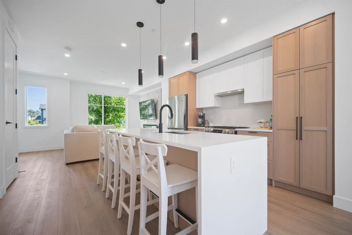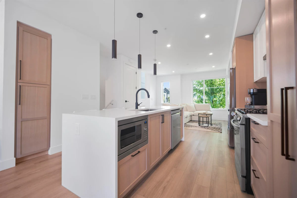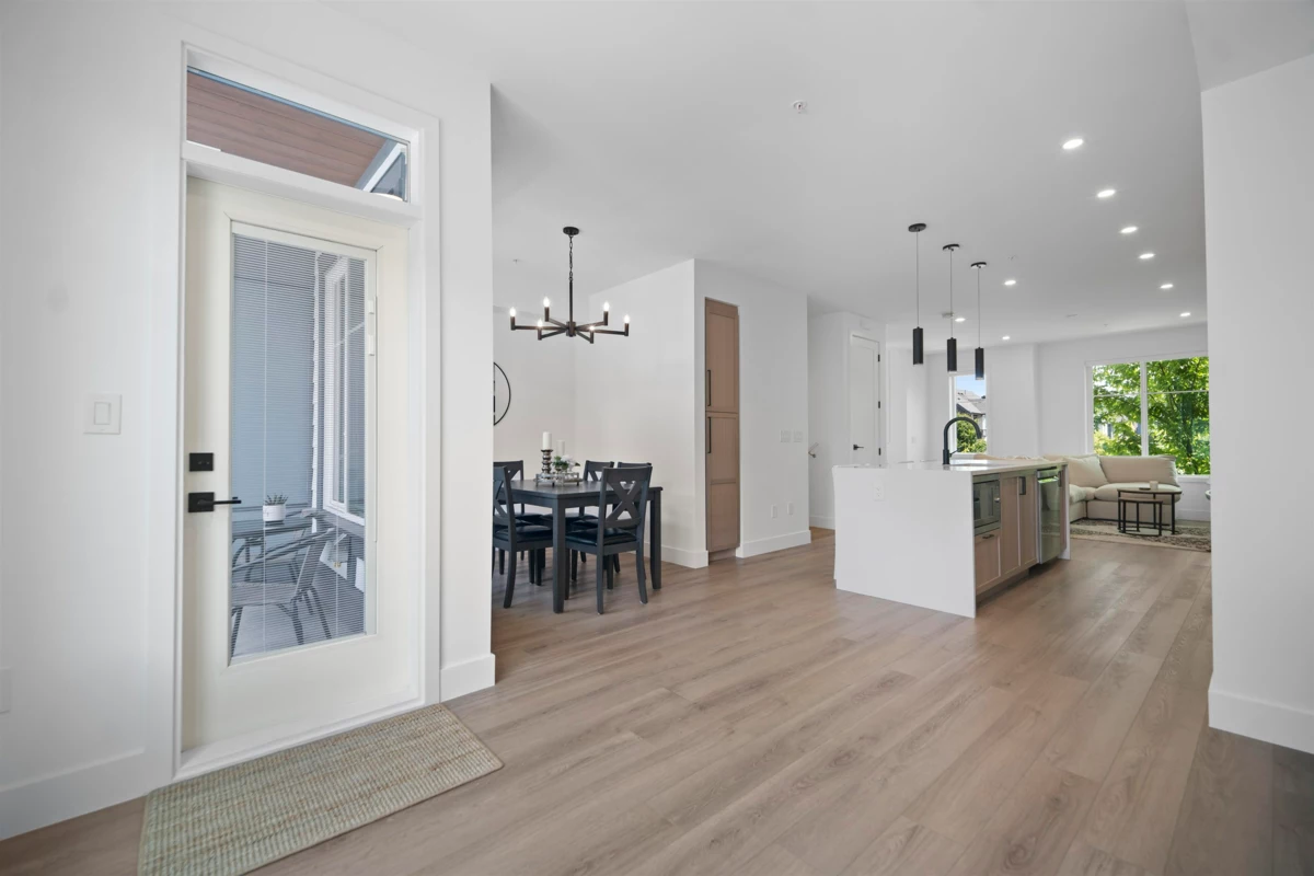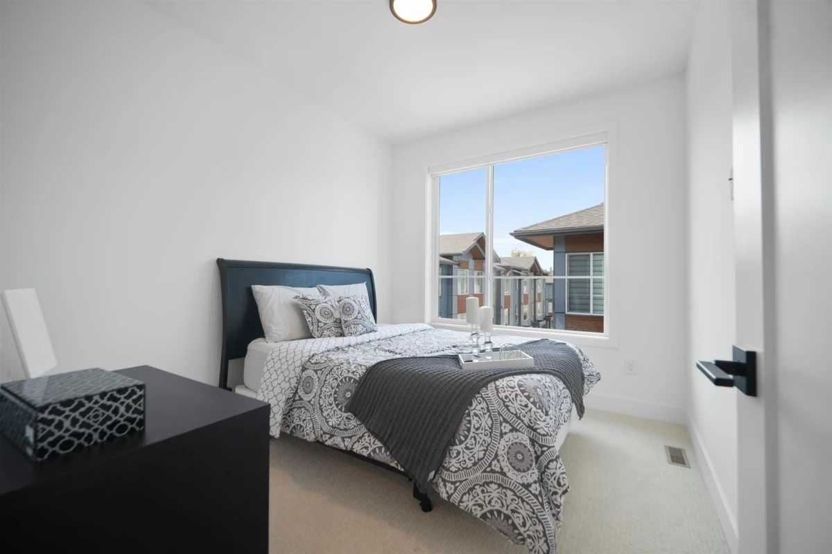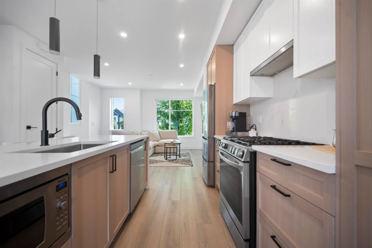 Crofton by Atrium Developments! Bright and modern nearly new 1,650 sq. ft. unit featuring 2-5-10 year warranty and AC. LG Kitchen appliances, 5 burner gas range, two toned maple/white kitchen, quartz counter tops. Living room, stone feature wall, gas fireplace. Covered patio with natural gas hook up off dining area. Upper level primary bedroom, walk in closet, ensuite with oversized glass shower & double sinks, 2 secondary bedrooms, main bath with tub/shower. Lower level bonus 4th bedroom! Double garage with ample room for storage. Prime location walking distance to shops, schools, parks and transit. Donna Gabriel Robins Elementary, Peter Ewart Middle & R.E. Mountain Secondary Schools. OPEN HOUSE, SAT. NOV. 22nd @ 12-2PM