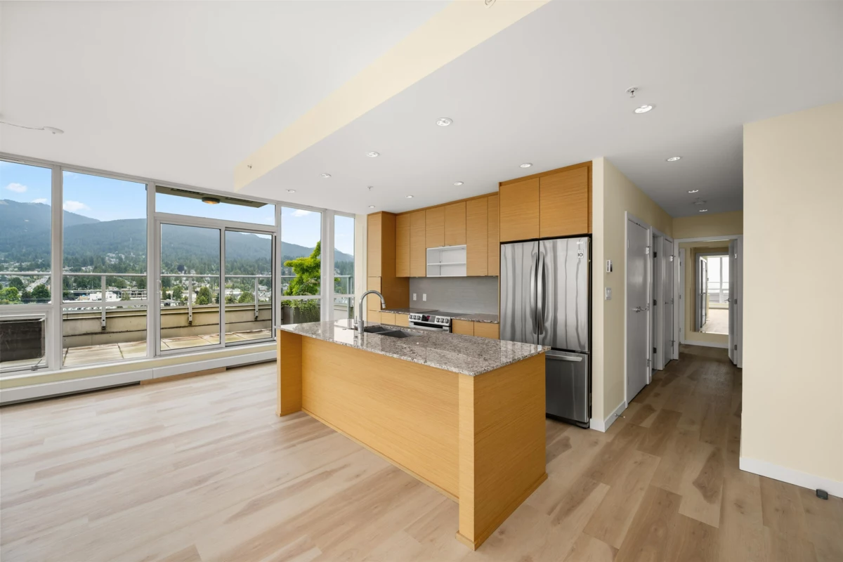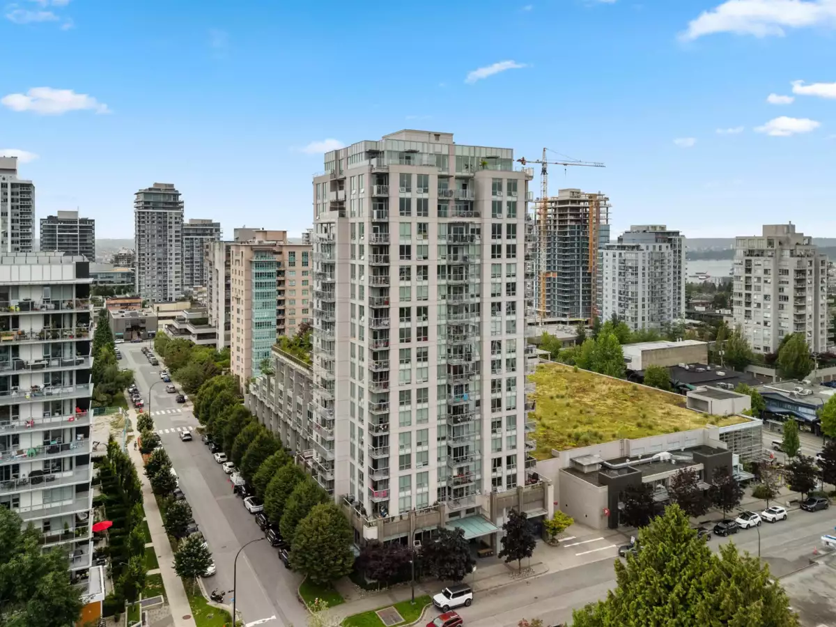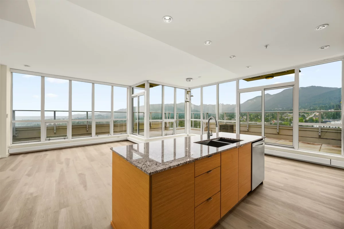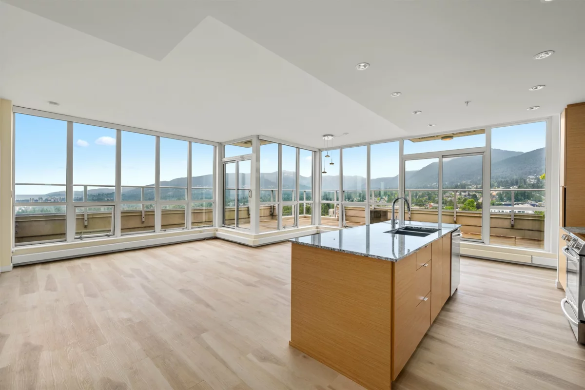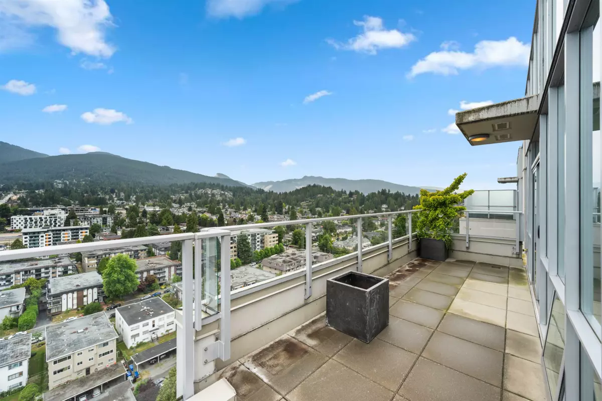 NW CORNER PENTHOUSE - Spectacular unit on the best corner in the building! Amazing Ocean, North shore mountains & city skyline views throughout. Welcome to this rare 1,284 sqft 3 bed and 2.5 bath w/290 sqft wrap around balcony. This bright & airy residence offers floor-to-ceiling windows and thoughtfully laid-out bedrooms to provide privacy between rooms (two w/ensuites). Open concept layout features a modern kitchen w/large granite island, ideal for cooking & entertaining. Meticulously maintained & in pristine condition. 2 side-by-side parking stalls & 1 locker. Amenities: Rooftop skygarden, lounge, well-equipped gym, guest suite, workshop, visitor parking & dog wash. Direct access to City Market from parkade. Desirable Central Lonsdale location- restaurants, cafes, groceries + transit.