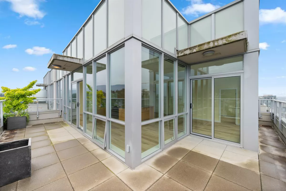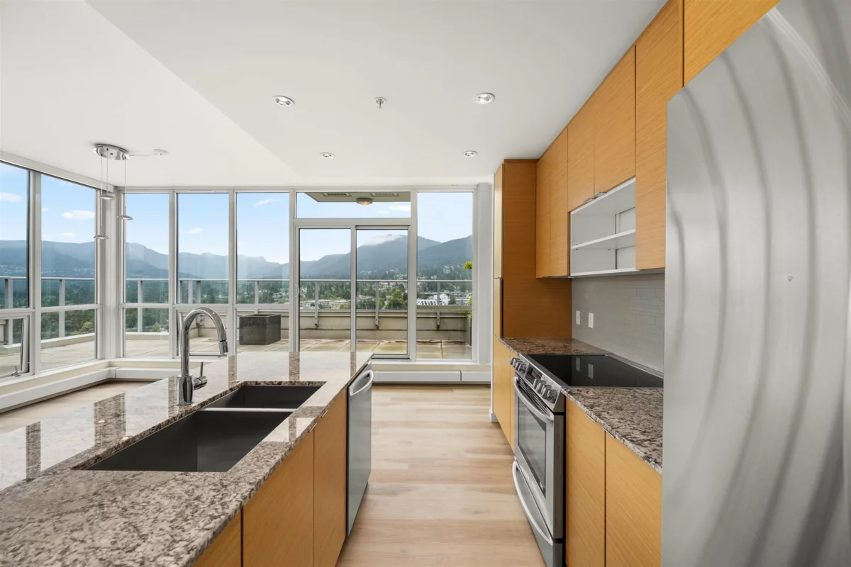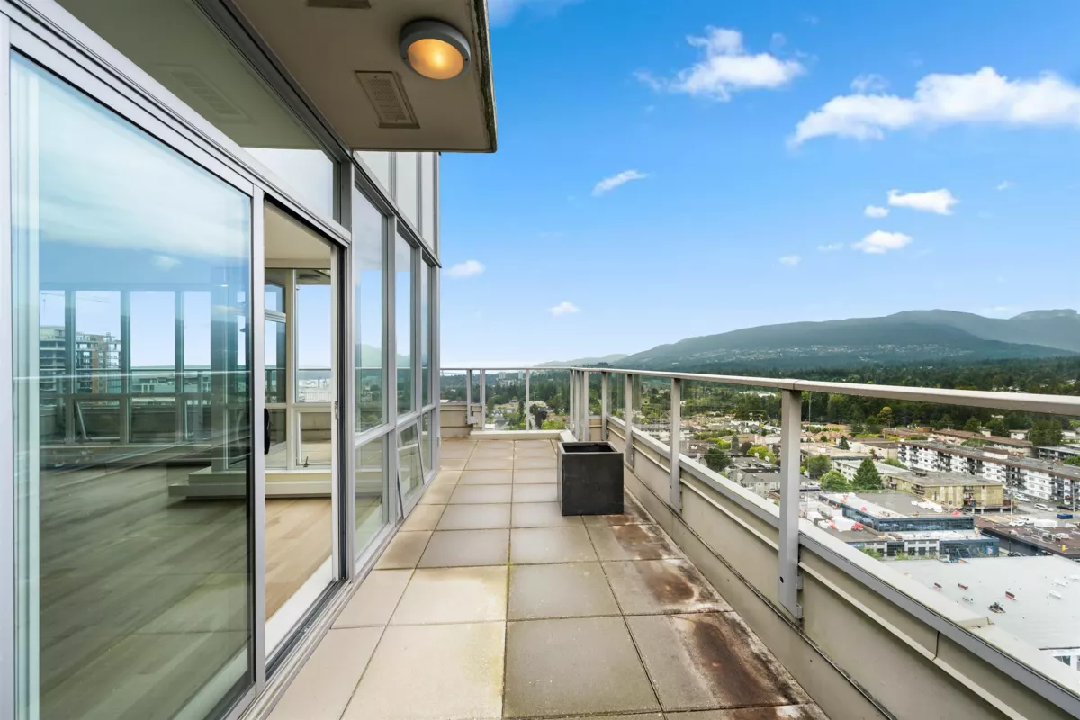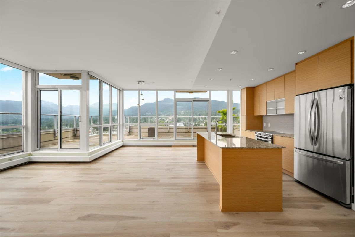NW CORNER PENTHOUSE - Spectacular unit on the best corner in the building! Amazing Ocean, North shore mountains & city skyline views throughout. Welcome to this rare 1,284 sqft 3 bed and 2.5 bath w/290 sqft wrap around balcony. This bright & airy residence offers floor-to-ceiling windows and thoughtfully laid-out bedrooms to provide privacy between rooms (two w/ensuites). Open concept layout features a modern kitchen w/large granite island, ideal for cooking & entertaining. Meticulously maintained & in pristine condition. 2 side-by-side parking stalls & 1 locker. Amenities: Rooftop skygarden, lounge, well-equipped gym, guest suite, workshop, visitor parking & dog wash. Direct access to City Market from parkade. Desirable Central Lonsdale location- restaurants, cafes, groceries + transit.