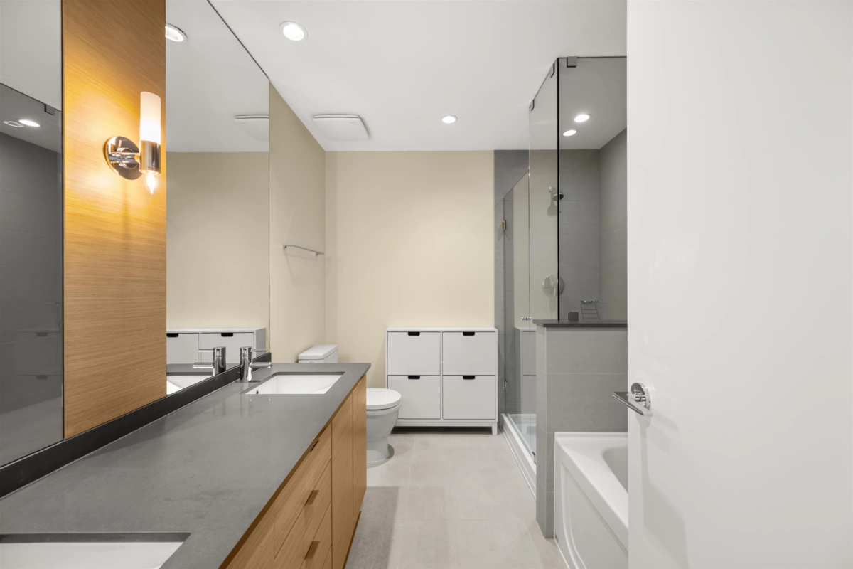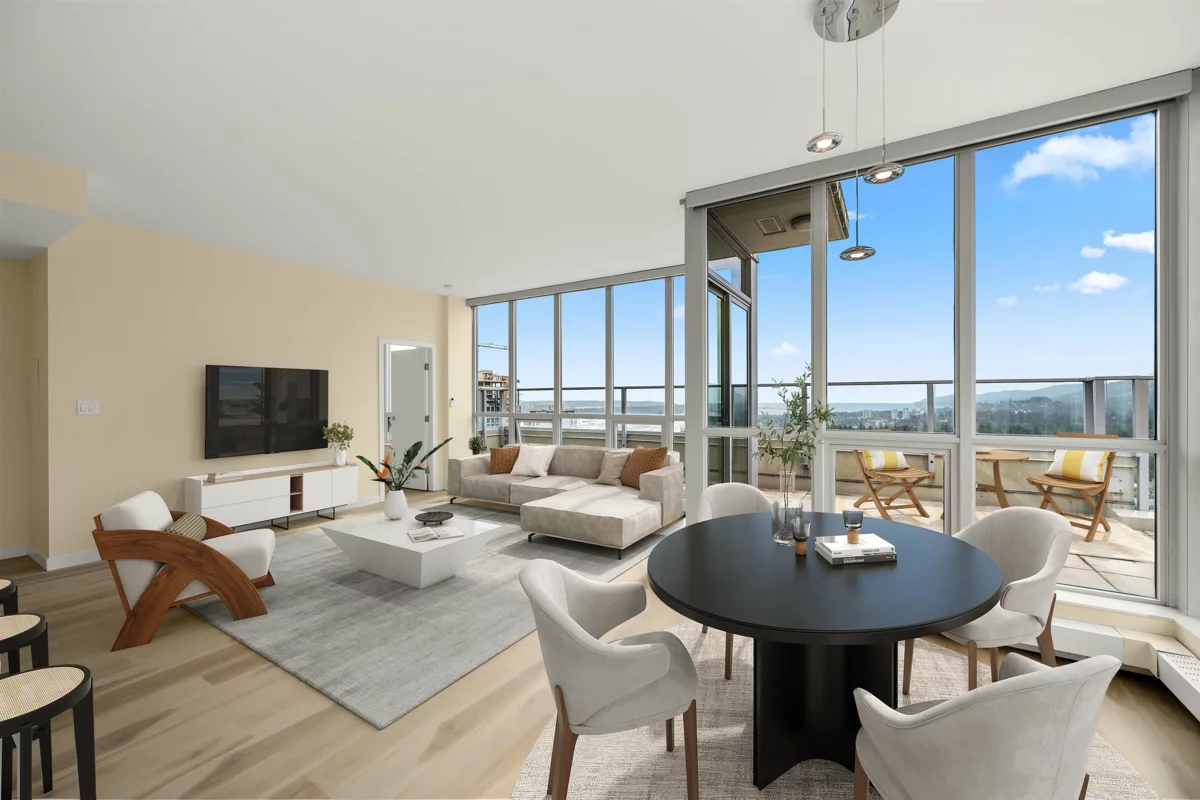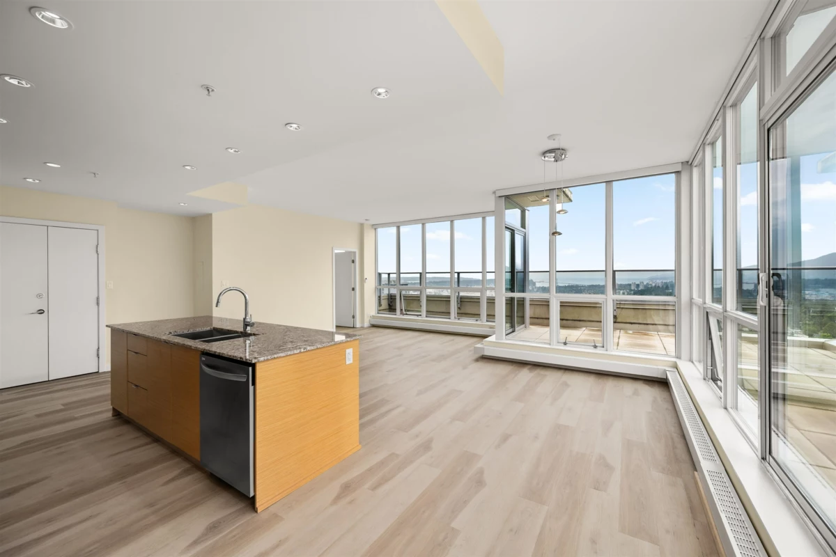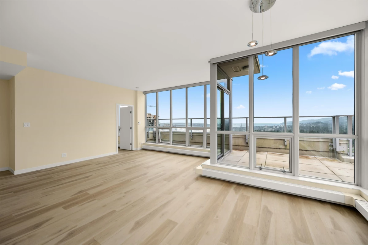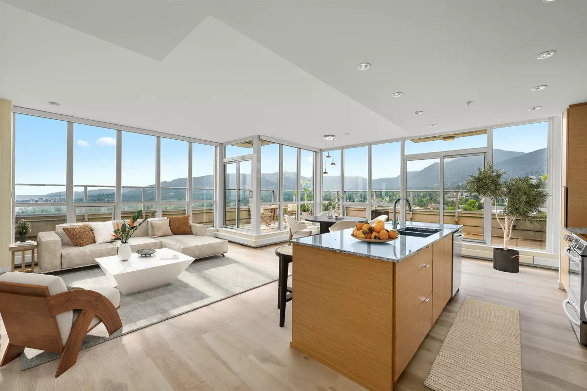 NW CORNER PENTHOUSE - Spectacular unit on the best corner in the building! Amazing Ocean, North shore mountains & city skyline views throughout. Welcome to this rare 1,284 sqft 3 bed and 2.5 bath w/290 sqft wrap around balcony. This bright & airy residence offers floor-to-ceiling windows and thoughtfully laid-out bedrooms to provide privacy between rooms (two w/ensuites). Open concept layout features a modern kitchen w/large granite island, ideal for cooking & entertaining. Meticulously maintained & in pristine condition. 2 side-by-side parking stalls & 1 locker. Amenities: Rooftop skygarden, lounge, well-equipped gym, guest suite, workshop, visitor parking & dog wash. Direct access to City Market from parkade. Desirable Central Lonsdale location- restaurants, cafes, groceries + transit.