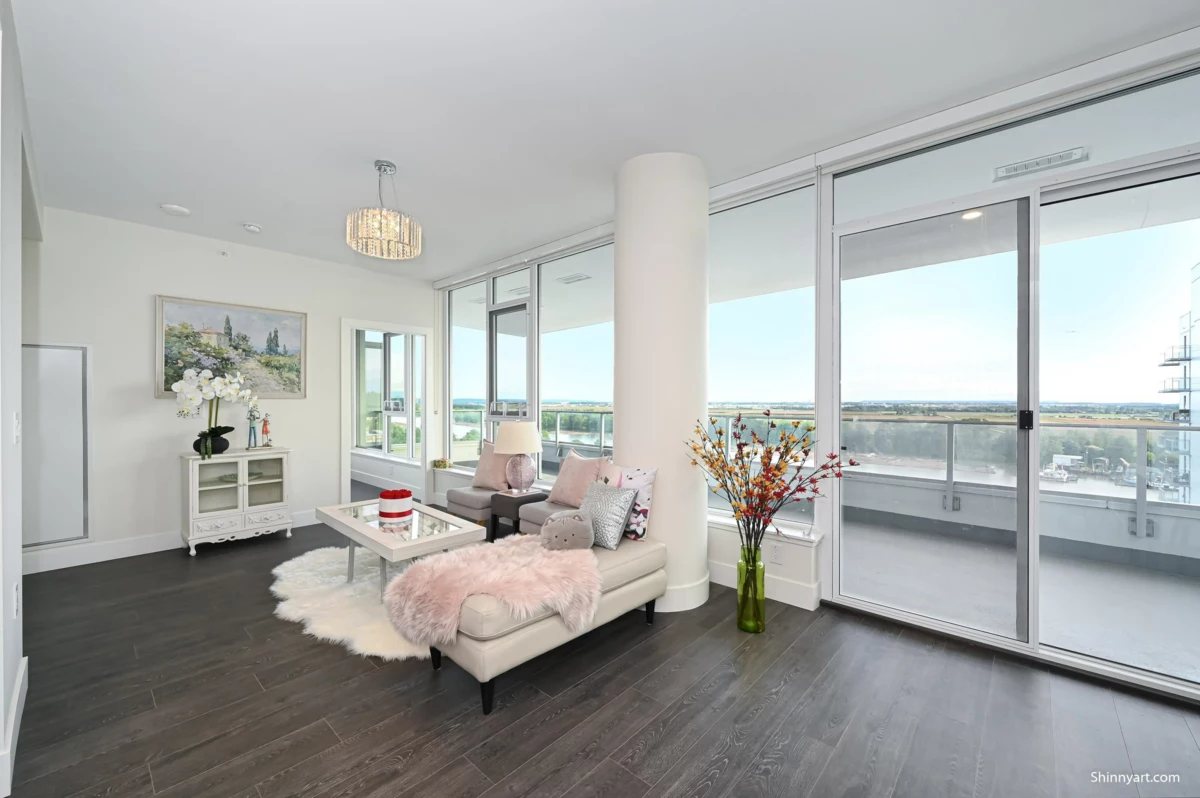 MODE-Vancouver's last waterfront and tallest concrete highrise building in serene River District. This extra-large unit features SE corner 3 bed + 1 den, 2 bath with 1,100 sq.ft of living space, a 332 sq.ft south-facing balcony overlooking the Fraser River and Mt Baker. The functional layout with open-concept kitchen, dining and living areas allows natural light to flow through every corner, 3 bedroom separation for good privacy.Features 10-foot ceilings, hardwood flooring throughout,kitchen with high-end appliances,high efficiency heating and cooling system. Convenient location, steps from Save-on Foods, Shoppers Drug Mart, Liquor store, banks, bus, with green space along with gym, hot tub,media room, and business center. 2 parkings and 1 with EV, 1 Storage, 1 Bicycle Storage