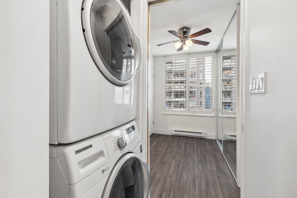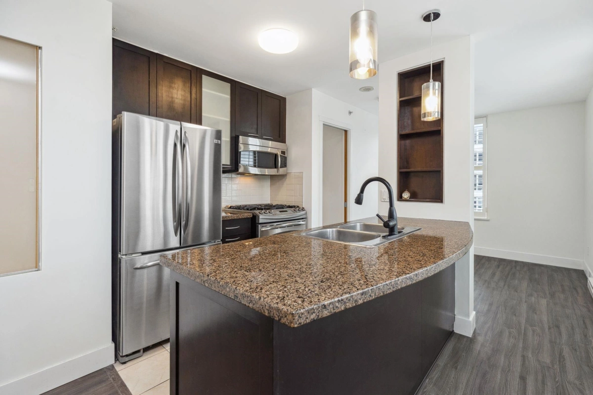 Welcome to this spacious and bright upper floor 1 bedroom + den corner home in the Mondrian 1 by Bosa, perfectly located at the edge of Yaletown. With a unique floor plan offering flexibility and plenty of space, this home is flooded with natural light and features stylish wood shutters, stainless steel appliances, granite countertops, and laminate and tile throughout. Enjoy cozy evenings by the gas fireplace or unwind on your balcony with stunning city views. The building offers resort-style amenities including an exercise centre, hot tub, sauna, guest suite, and visitor parking. Plus, you’ll have 1 parking spot and a locker for added convenience. Steps away from Yaletown's trendy restaurants, retail, and transit, this home offers the perfect blend of comfort, style, and location.