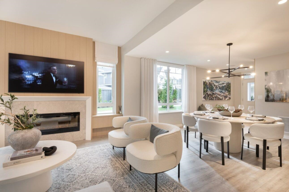This 4 bed 4.5 bath corner townhome at Polygon's Partington Creek belongs to a new collection of townhomes nestled in Coquitlam's Burke Mountain neighbourhood. This bright 2,641 sq. ft. home boasts overheight main floor ceilings, large windows, and a deck off the kitchen. The kitchen features sleek appliances, stone countertops and an expansive island. Upstairs, find luxury with a spa-inspired ensuite and a separate laundry room with sink, and downstairs enjoy the addition of a recreation room plus flex space. Enjoy a side-by-side double-car garage equipped with level 2 EV charging, AC and access to the Creekside Club! Visit our sales office and three display homes at 3674 Victoria Drive to learn more.