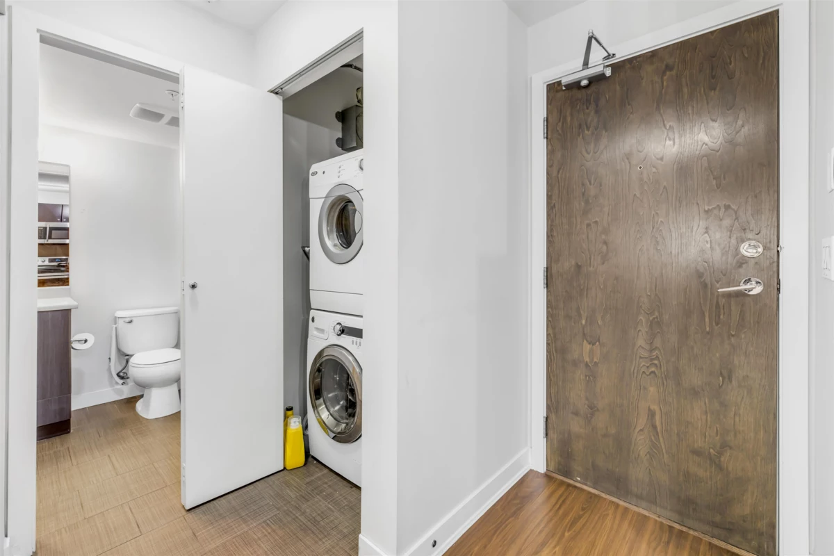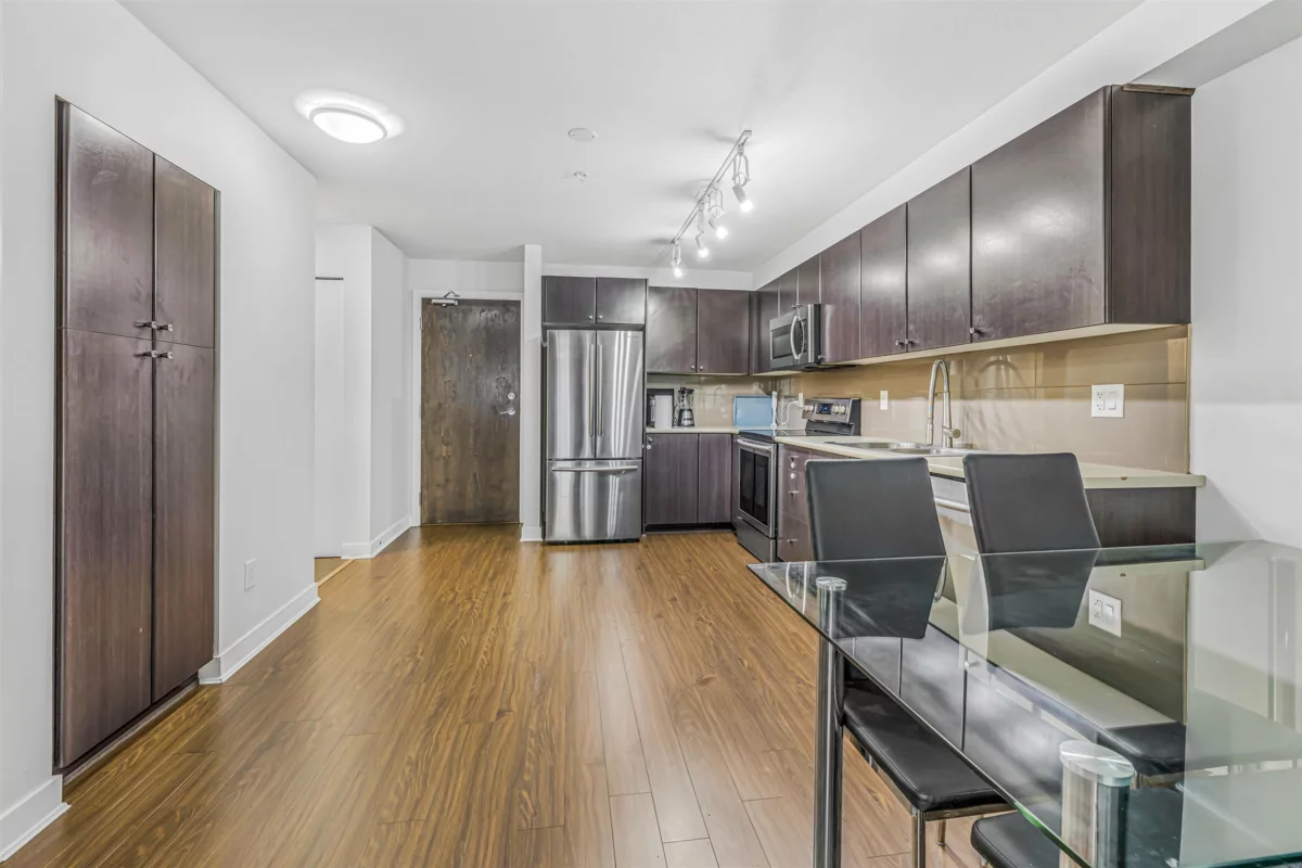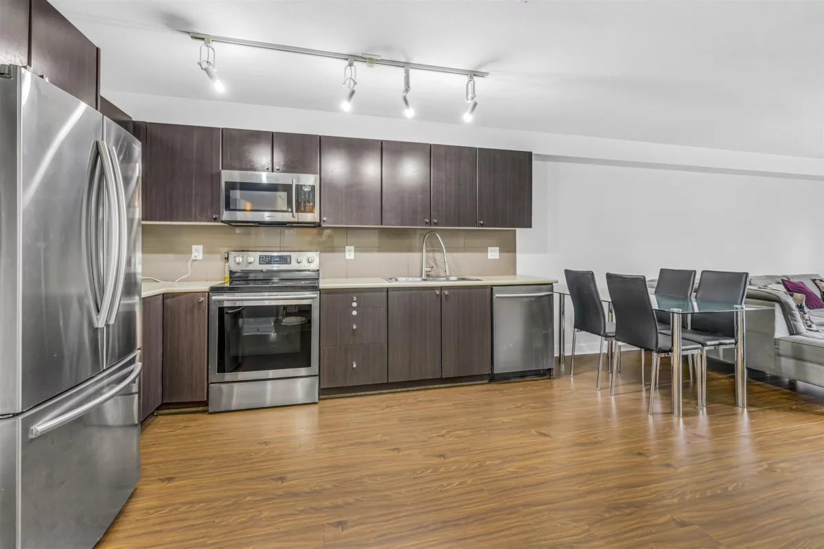 Welcome to this stunning second-floor condo in MIRA complex, featuring two bedrooms and one bathroom. With a clean, open concept design and spacious rooms, this residence offers both comfort and style. Ideally located, it provides easy access to shopping, restaurants, grocery stores, recreational facilities, schools, and public transit. The unit is highlighted by designer finishes, elegant wood laminate floors, and plush carpeting, along with a private balcony or patio overlooking the beautifully landscaped central courtyard. Additional amenities include in-suite laundry, storage locker, secure underground parking, and access to an exercise room and recreational area, making it perfect for those who value convenience and lifestyle. Walking distance to both level schools.