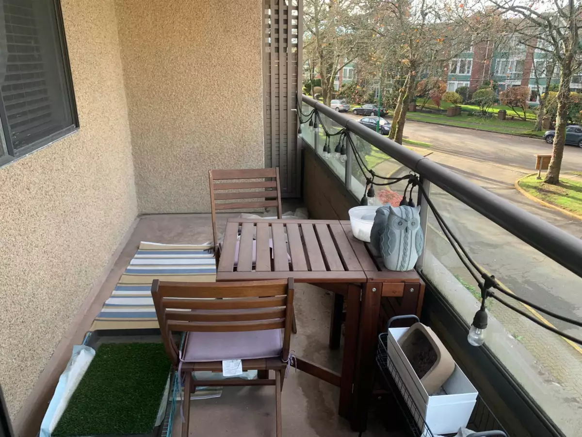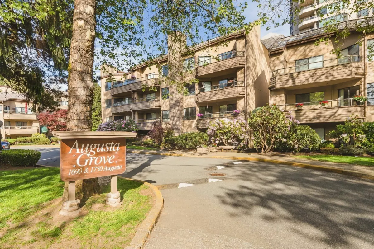 AUGUSTA GROVE - Spacious 1 bed/den/1 bath with open concept living & dining room. Updates include kitchen boasting granite counters, cabinets, backsplash, sink and s/s appliances. Other updates include bathroom fixtures, vanity and surround and upgraded flooring thru-out. 2 balconies. Spacious primary bedroom. Secured underground parking and storage, pets & rentals allowed. Very peaceful outlook mature trees. Excellent location, close to golf course, SFU, Parks, trails & transit & shopping.