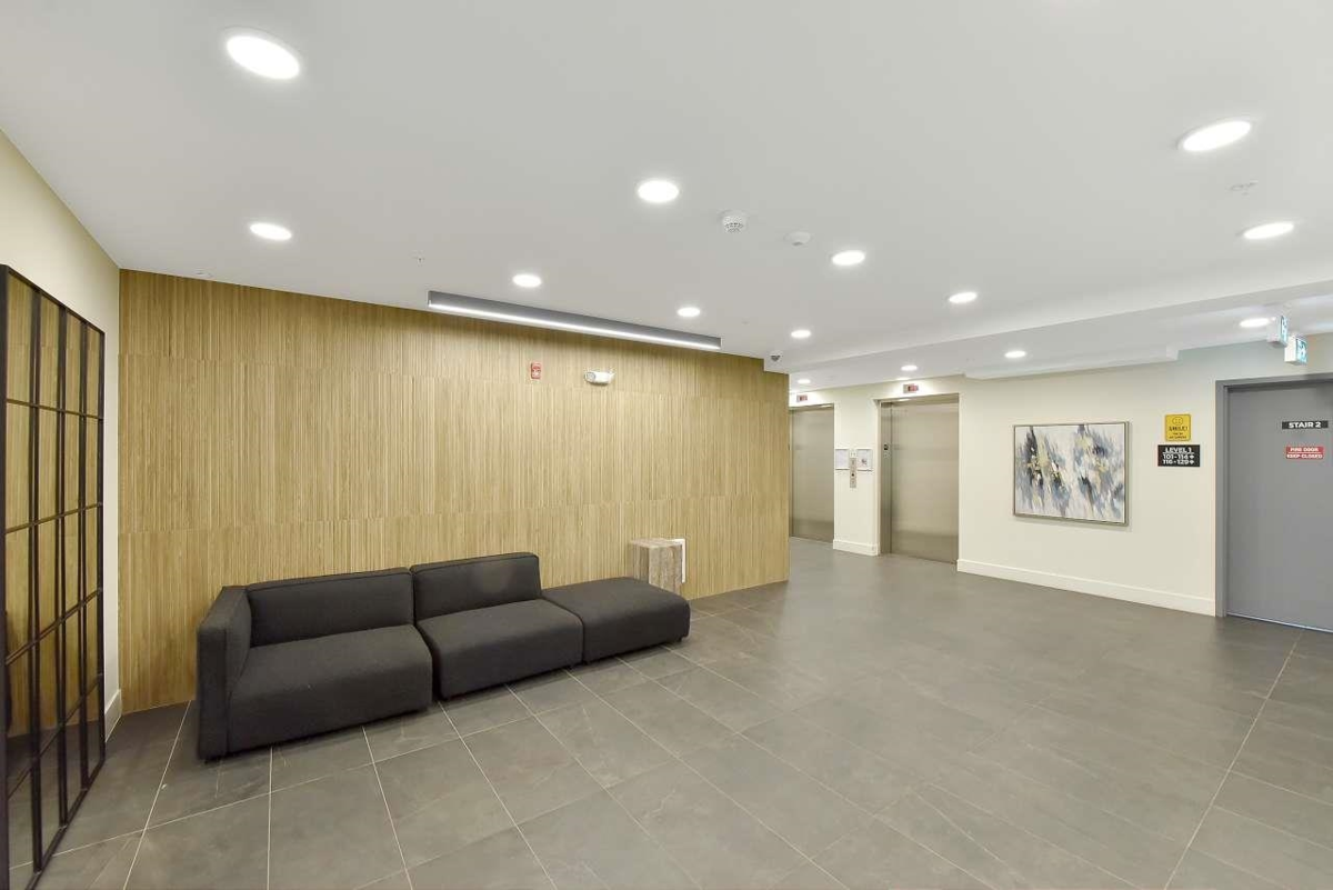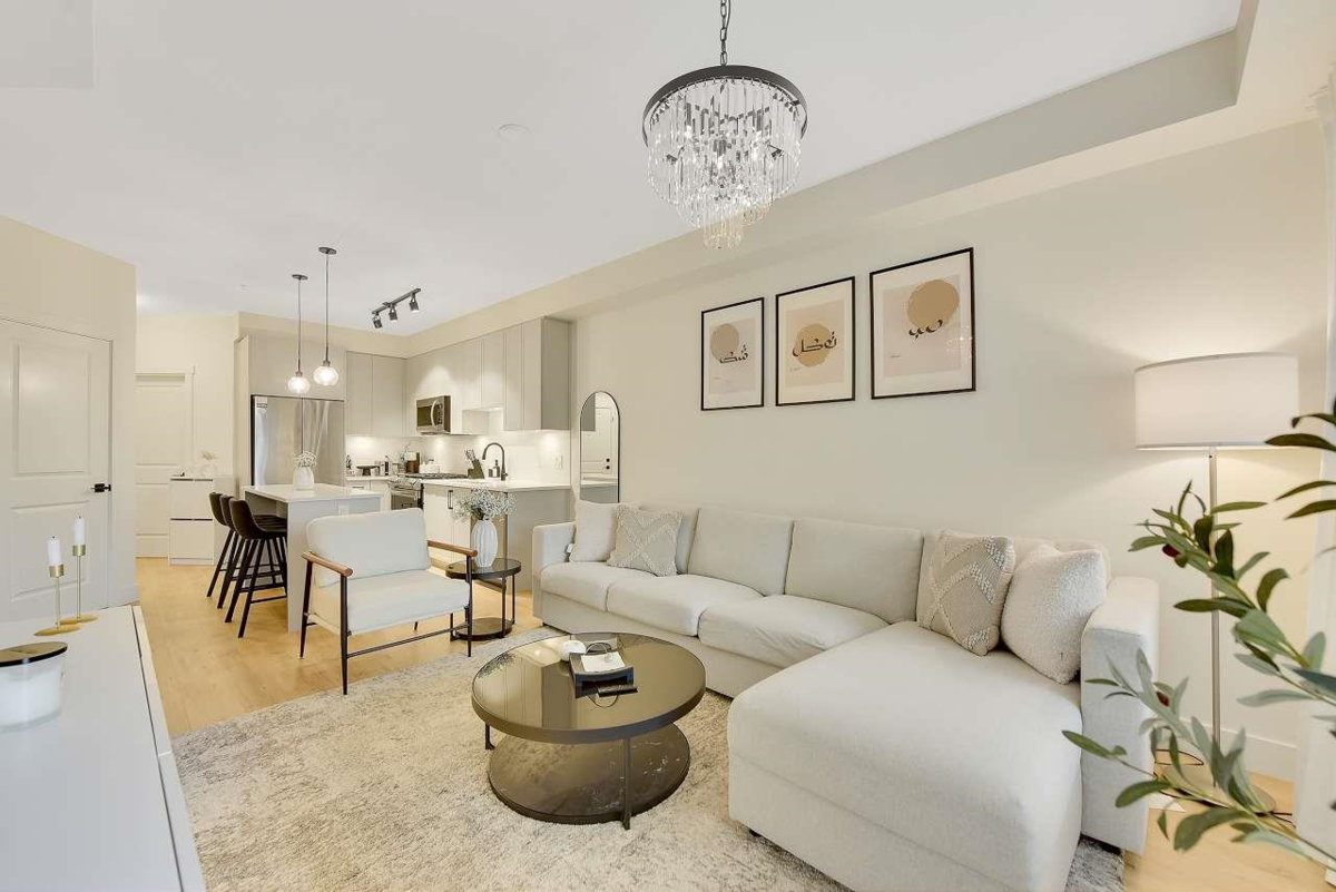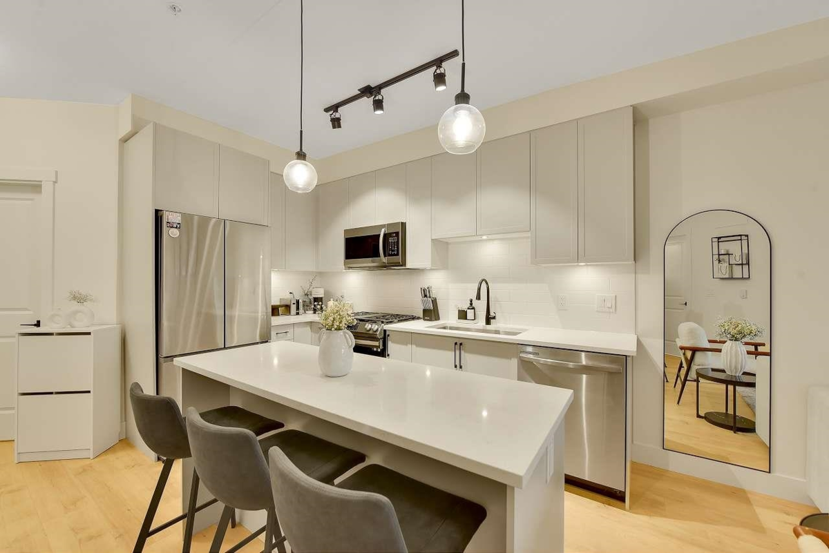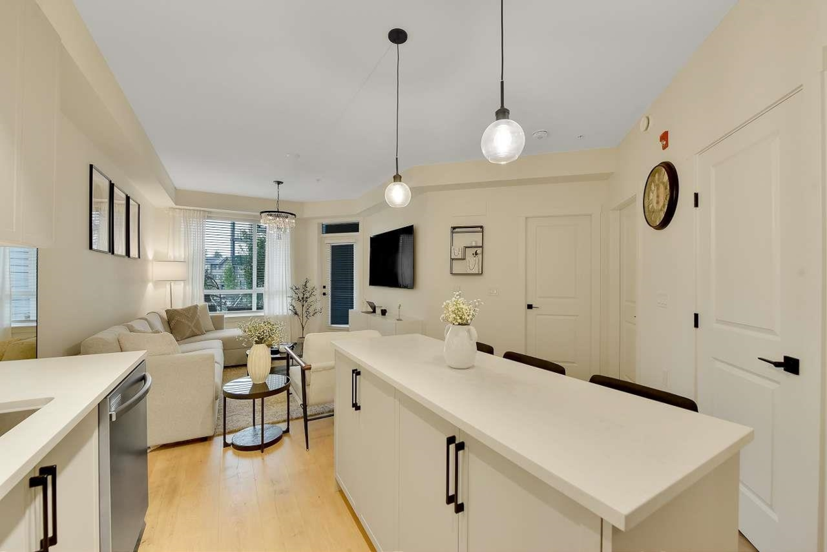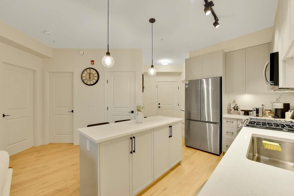 Camden by Award-Winning Zenterra! Step into this bright and modern 1 1-bedroom+den condo located in the heart of Langley’s thriving Willoughby neighborhood. This meticulously designed home offers 677 sq ft of smart, functional living space—perfect for first-time buyers, professionals, or investors. The open-concept layout features a sleek, designer kitchen with quartz countertops, stainless steel Samsung appliances, and soft-close cabinetry, flowing into a spacious living area with large windows that fill the home with natural light. Den is perfect for a home office, nursery, or extra storage, W. facing balcony. The spacious bedroom fits a king-sized bed, and the modern 4-piece bathroom is styled with premium fixtures. 1 parking & Storage, Pets ok, built-in piping for AC.