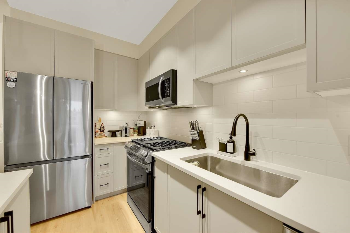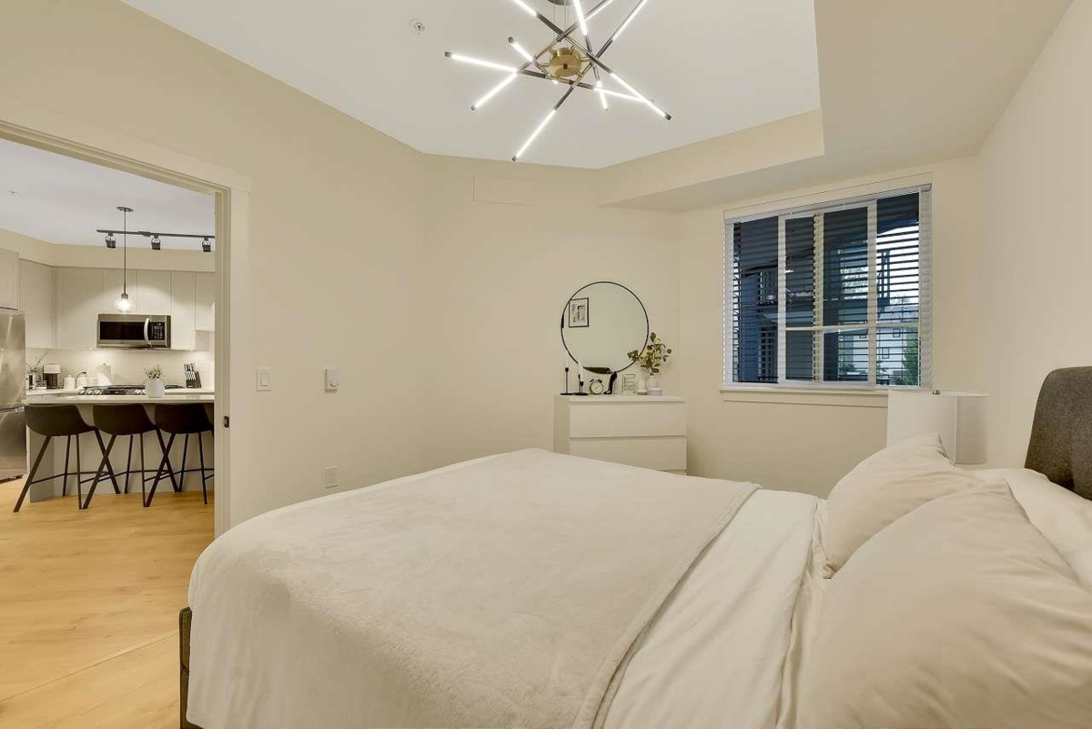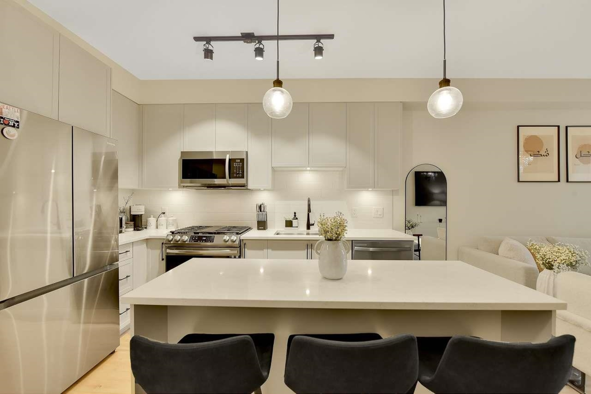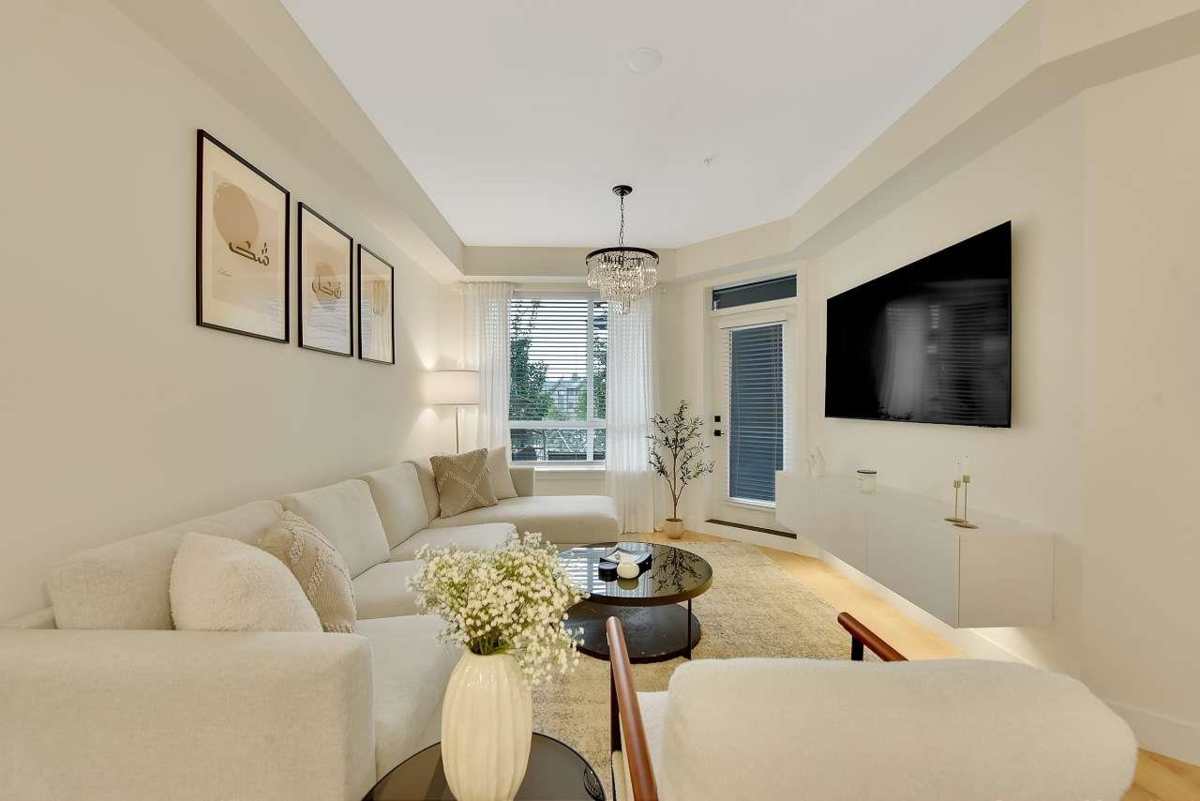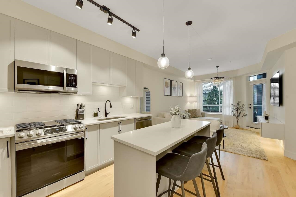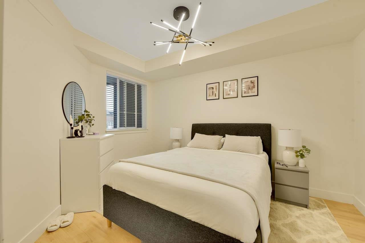 Camden by Award-Winning Zenterra! Step into this bright and modern 1 1-bedroom+den condo located in the heart of Langley’s thriving Willoughby neighborhood. This meticulously designed home offers 677 sq ft of smart, functional living space—perfect for first-time buyers, professionals, or investors. The open-concept layout features a sleek, designer kitchen with quartz countertops, stainless steel Samsung appliances, and soft-close cabinetry, flowing into a spacious living area with large windows that fill the home with natural light. Den is perfect for a home office, nursery, or extra storage, W. facing balcony. The spacious bedroom fits a king-sized bed, and the modern 4-piece bathroom is styled with premium fixtures. 1 parking & Storage, Pets ok, built-in piping for AC.