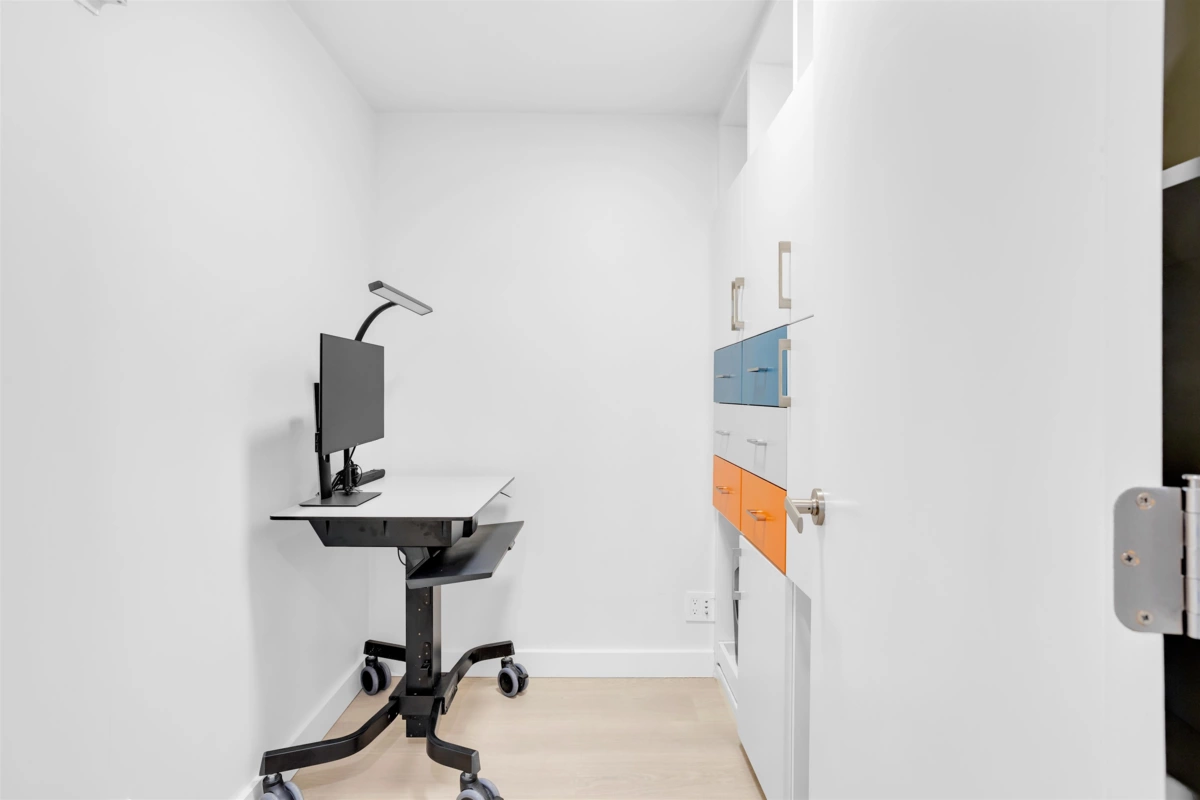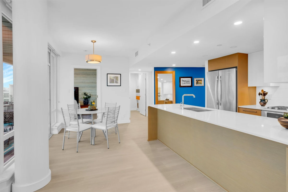 Rarely available 1 Bed + Den at Central! This 703 sq.ft. SE corner Skybridge home captures beautiful natural light and panoramic views from sunrise to afternoon. The open design features a gourmet kitchen with full-size s/s Jenn-Air appliances, custom cabinetry with display lighting, and a welcoming dining area. Upgrades include wide-plank flooring, brand new LED ceiling lights, plus updated bedroom and dining fixtures. The spa-inspired bath offers an enlarged shower with supportive safety bars. The versatile den makes an ideal home office, in-suite storage, pantry extension, or walk-in closet. Relax on the covered patio for morning coffee or alfresco dining. Central offers world-class amenities: concierge, gym, saunas, rooftop patio, lounge & theatre!