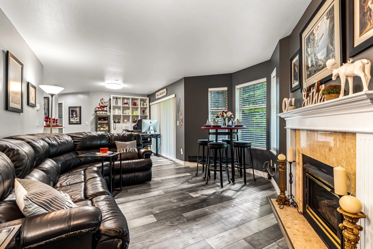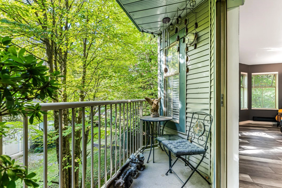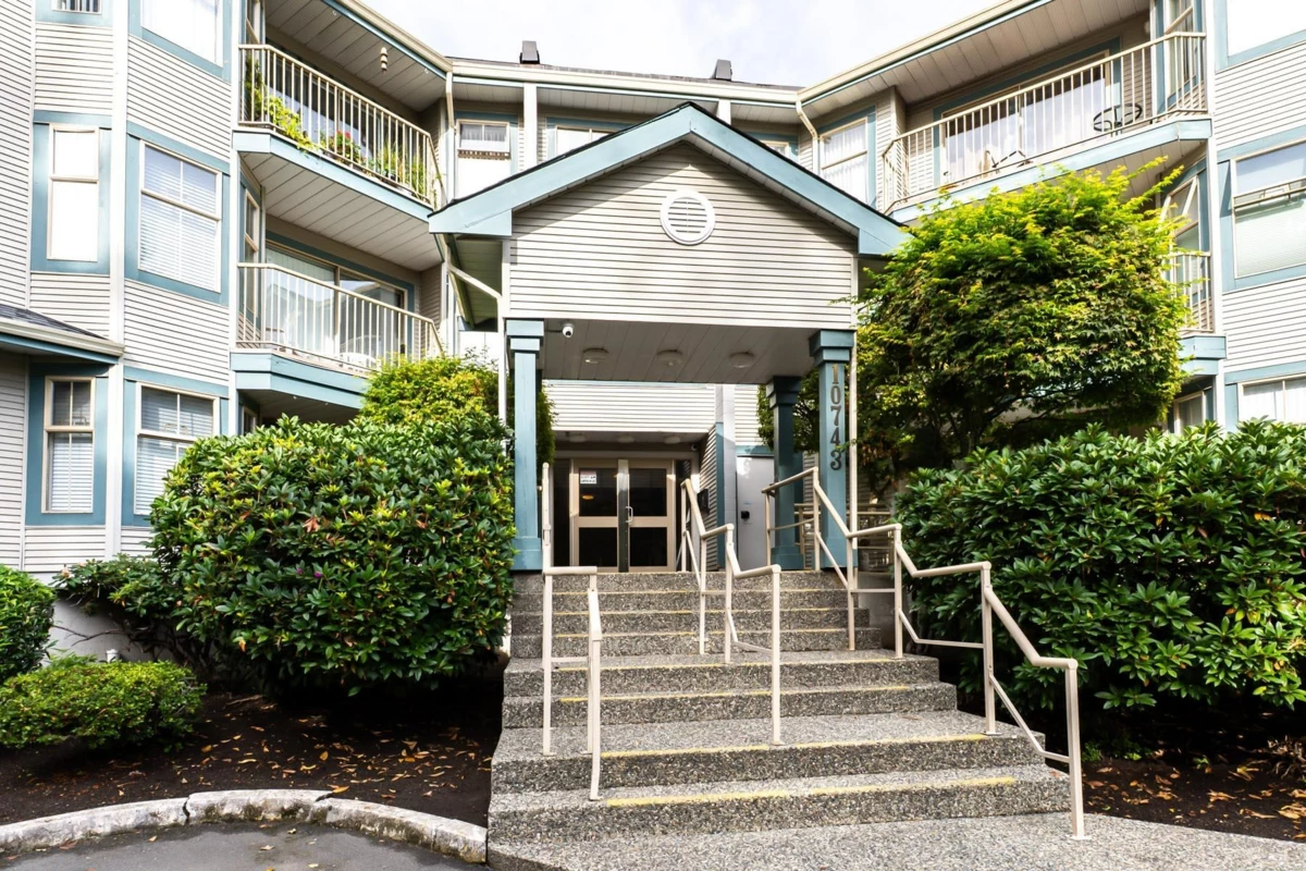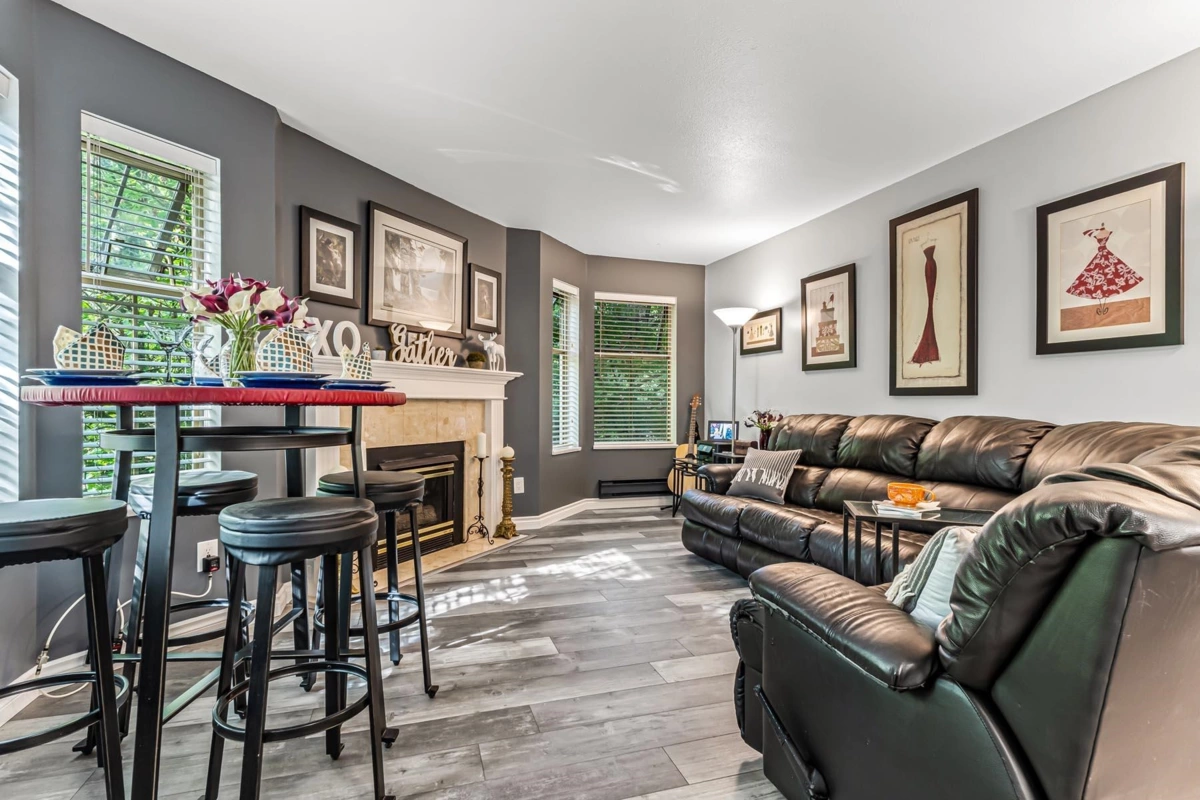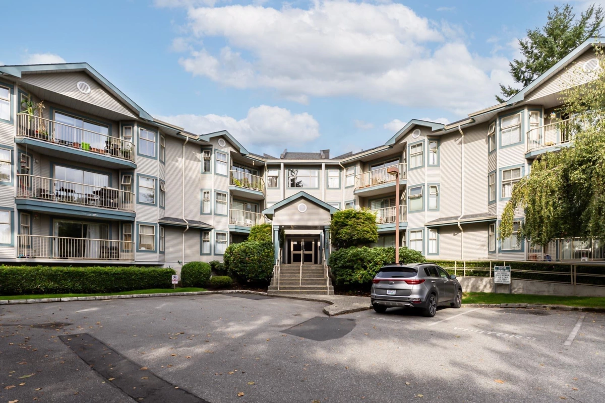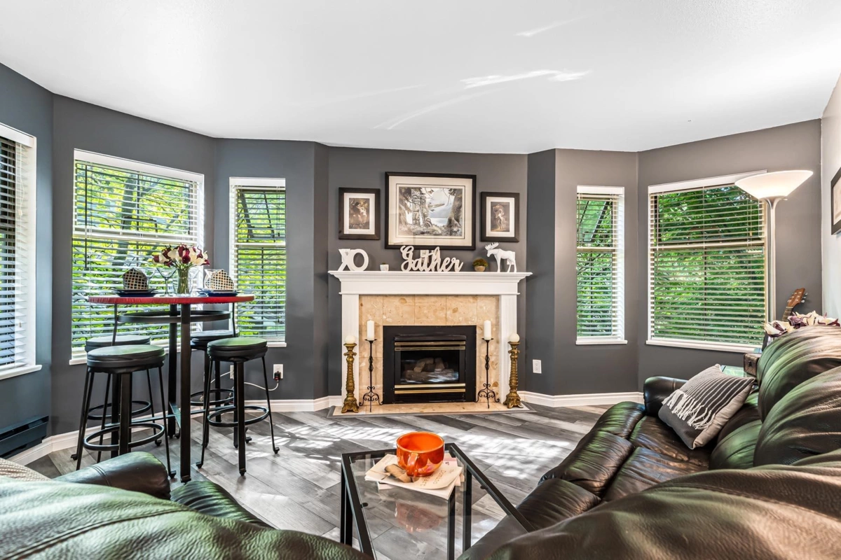 Nicely renovated 2 bed, 2 bath, 1120 sq ft corner unit. A desirable unit in the building surrounded by trees - tranquil private setting. Spacious rooms & updated vinyl floors throughout. Primary bedroom includes walk-in closet & full ensuite bathroom. Updated kitchen w/ breakfast bar and open to the dining & living rooms. Not all units in the building have a gas fireplace but this one does! Gas is included in the strata fee. Separate laundry room is great for storage. Hot water tank replaced in Feb 2023. 1 parking stall & visitor parking. Storage locker is conveniently located on the same floor as the unit. 1 small dog or cat allowed. Proactive strata, well maintained buildings, healthy CRF. Across from Forsyth Rd Elementary, close to Forsyth Park/dog park, skytrain, Central City & more!