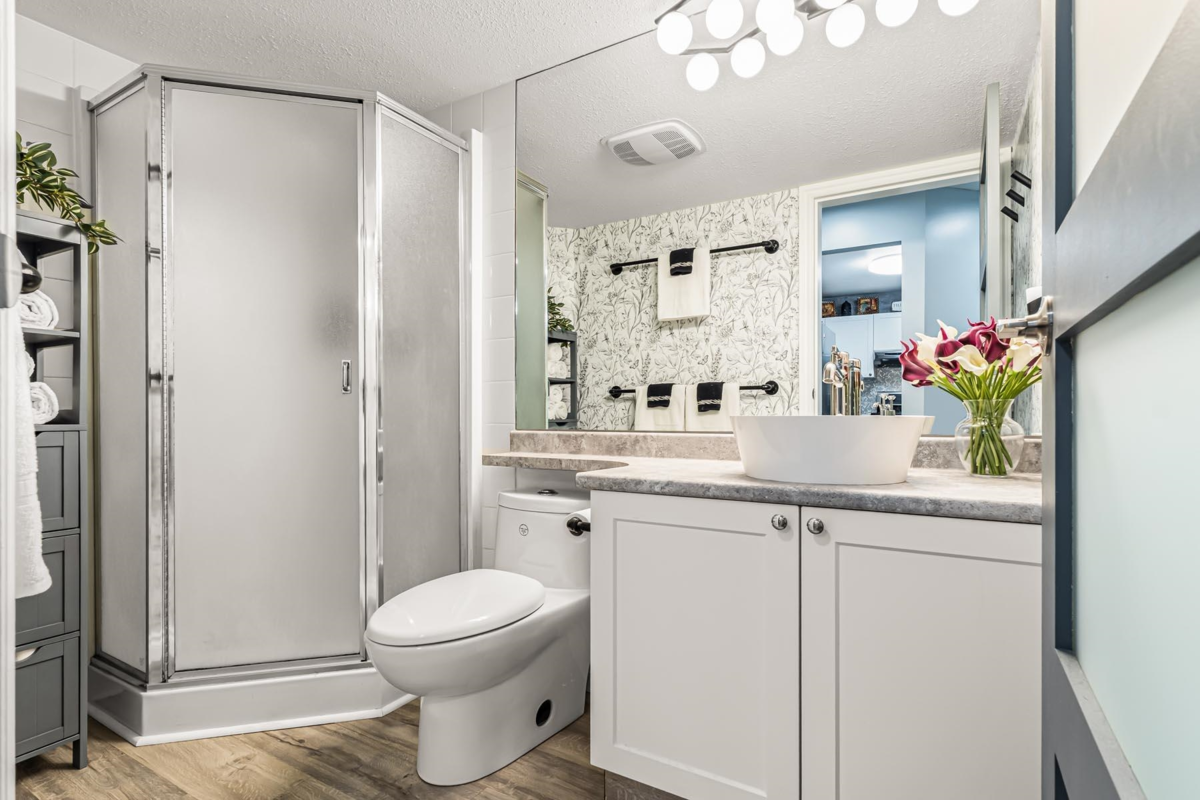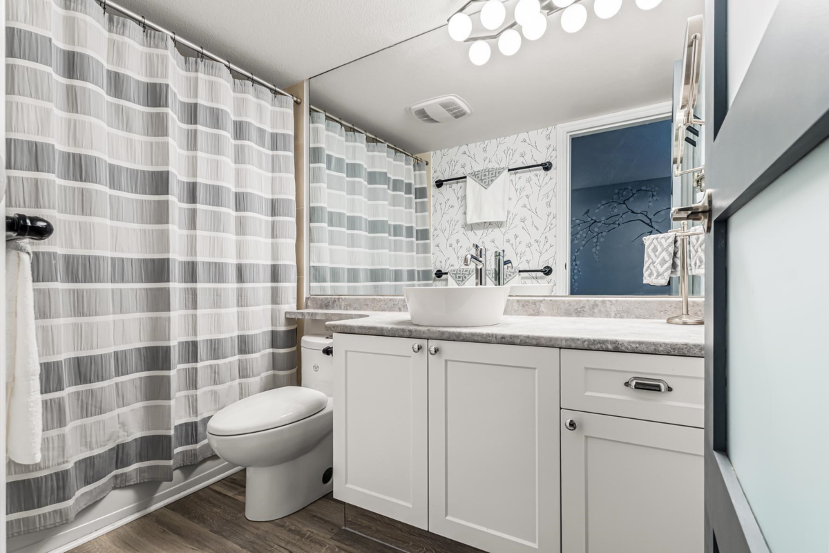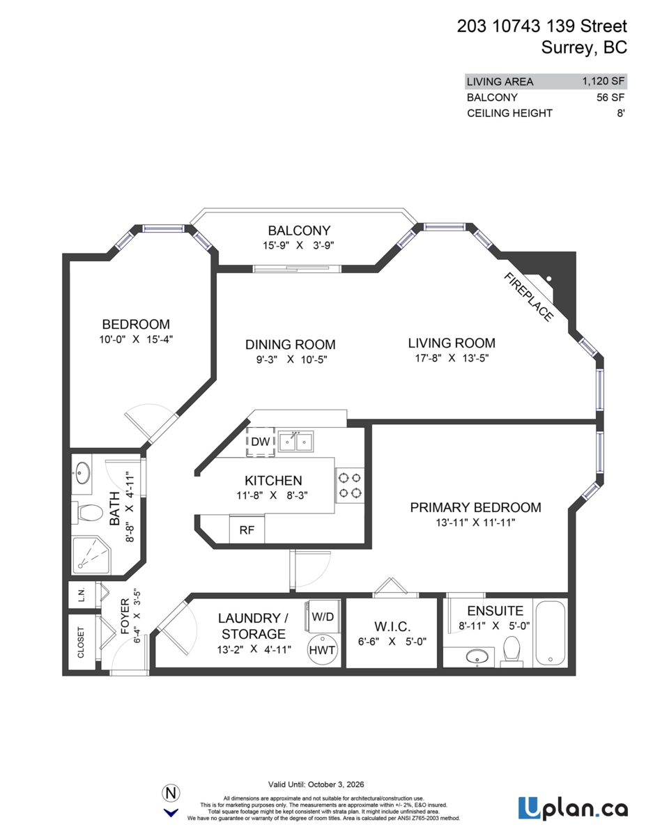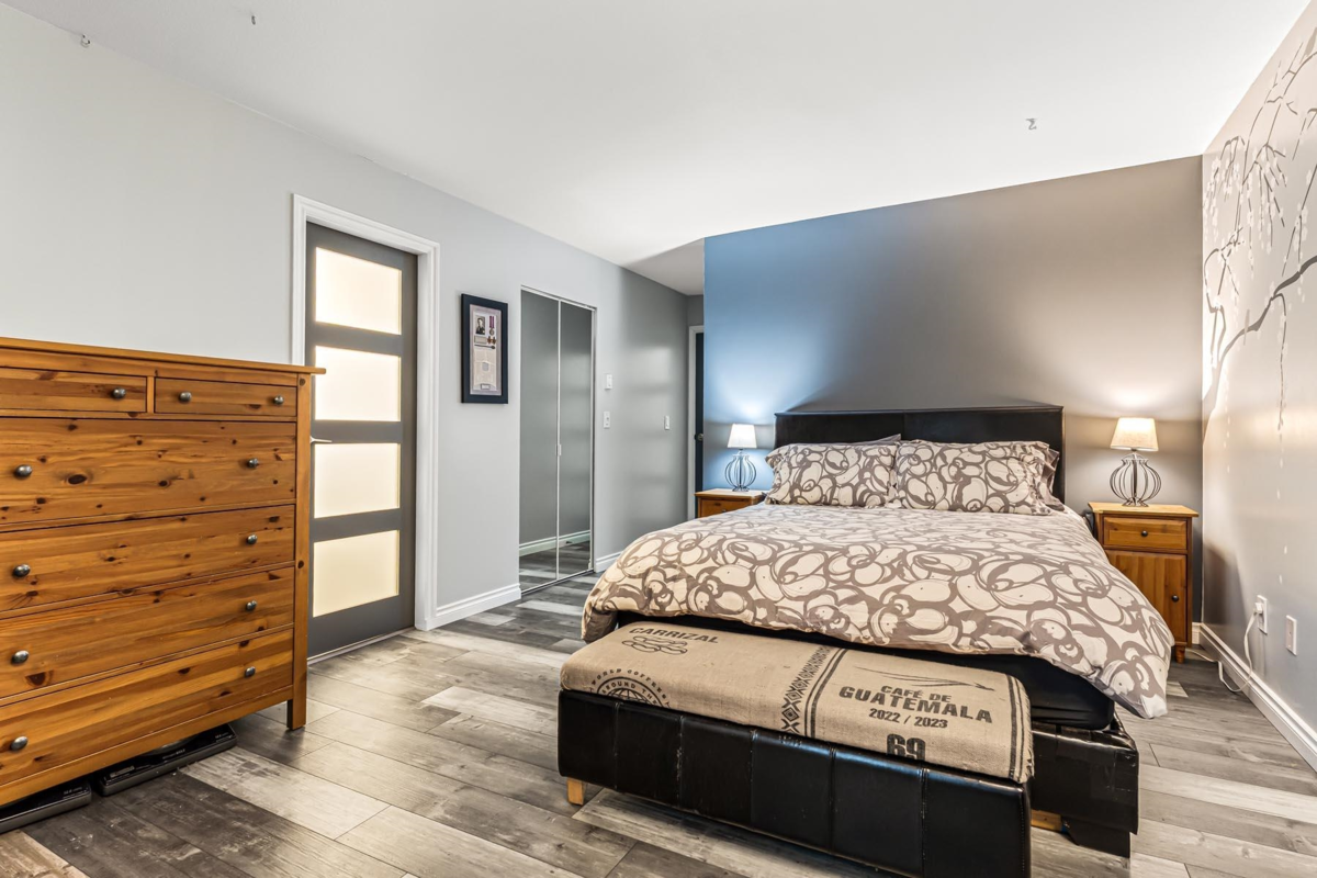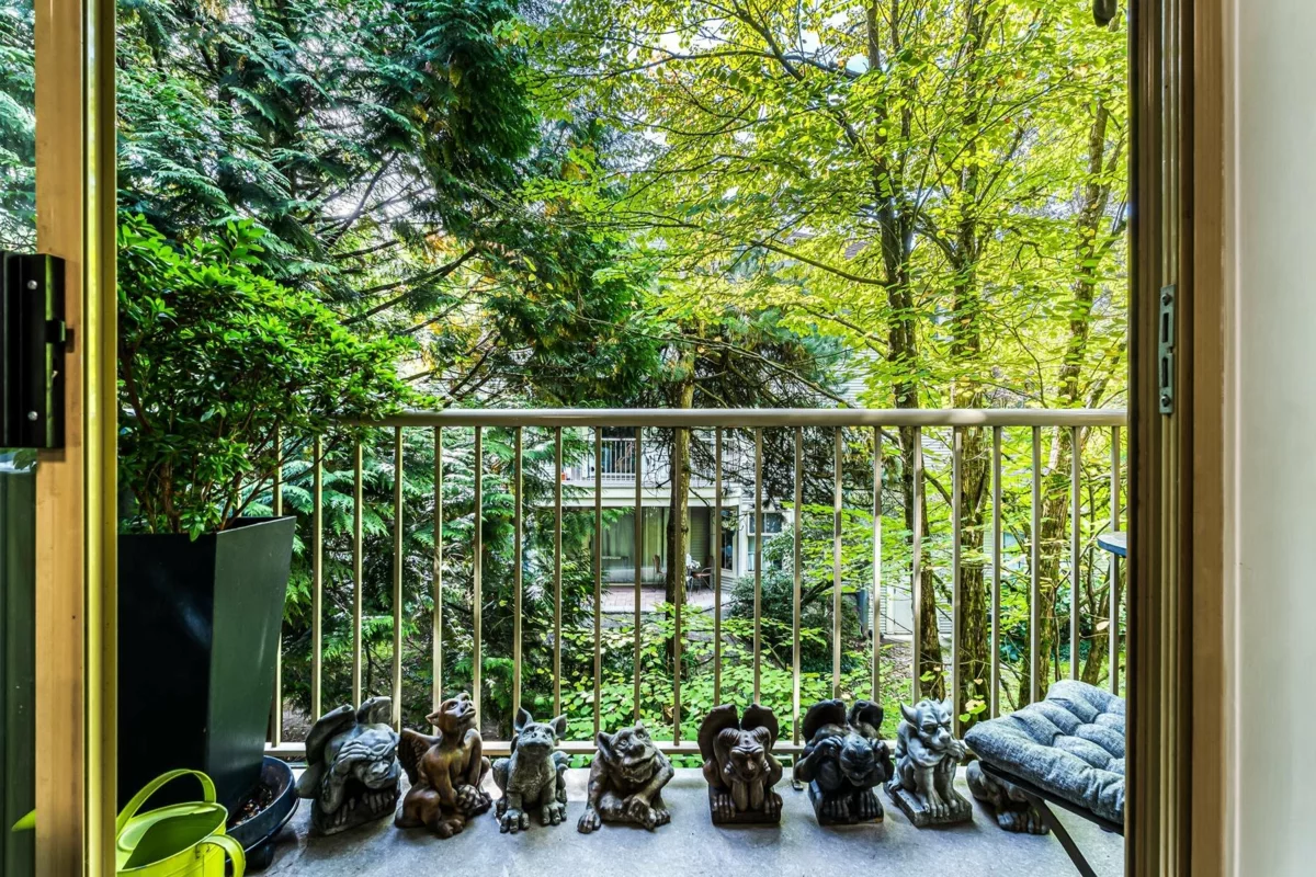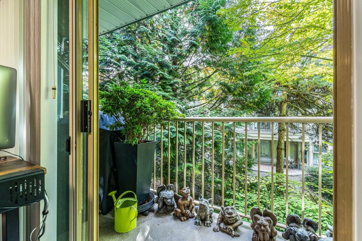Nicely renovated 2 bed, 2 bath, 1120 sq ft corner unit. A desirable unit in the building surrounded by trees - tranquil private setting. Spacious rooms & updated vinyl floors throughout. Primary bedroom includes walk-in closet & full ensuite bathroom. Updated kitchen w/ breakfast bar and open to the dining & living rooms. Not all units in the building have a gas fireplace but this one does! Gas is included in the strata fee. Separate laundry room is great for storage. Hot water tank replaced in Feb 2023. 1 parking stall & visitor parking. Storage locker is conveniently located on the same floor as the unit. 1 small dog or cat allowed. Proactive strata, well maintained buildings, healthy CRF. Across from Forsyth Rd Elementary, close to Forsyth Park/dog park, skytrain, Central City & more!
