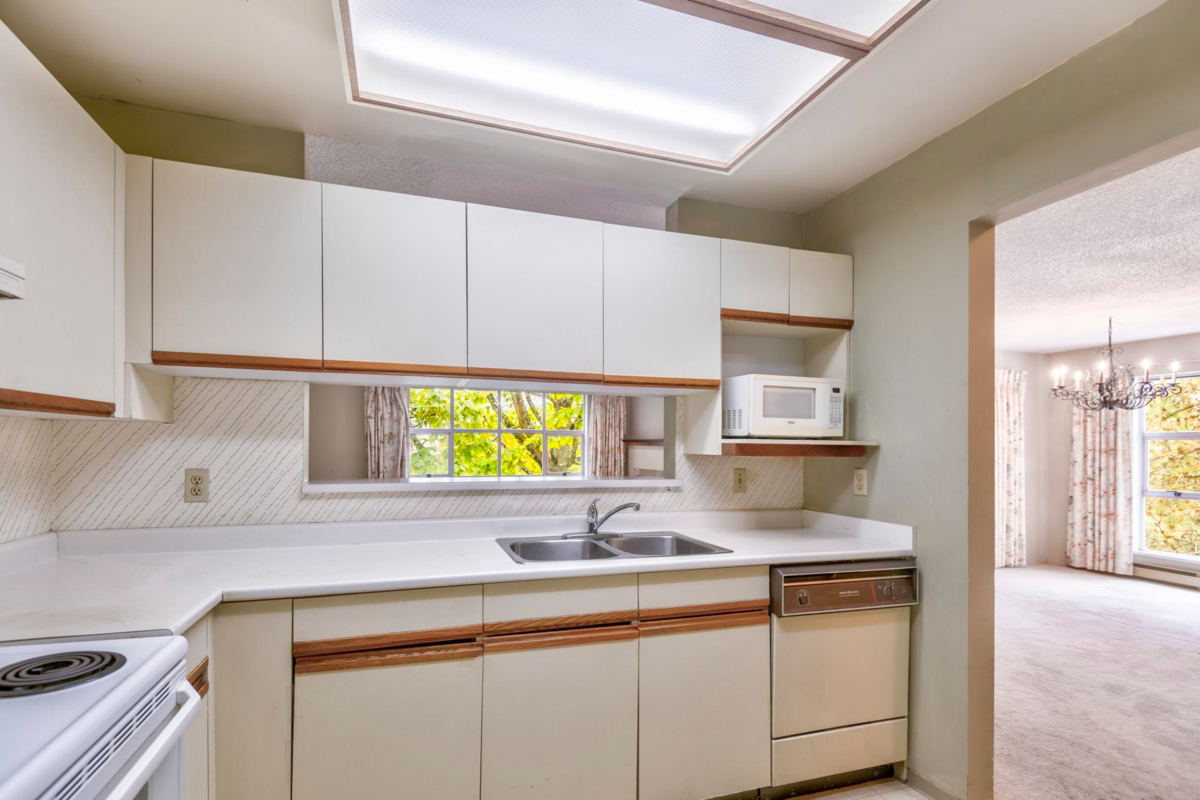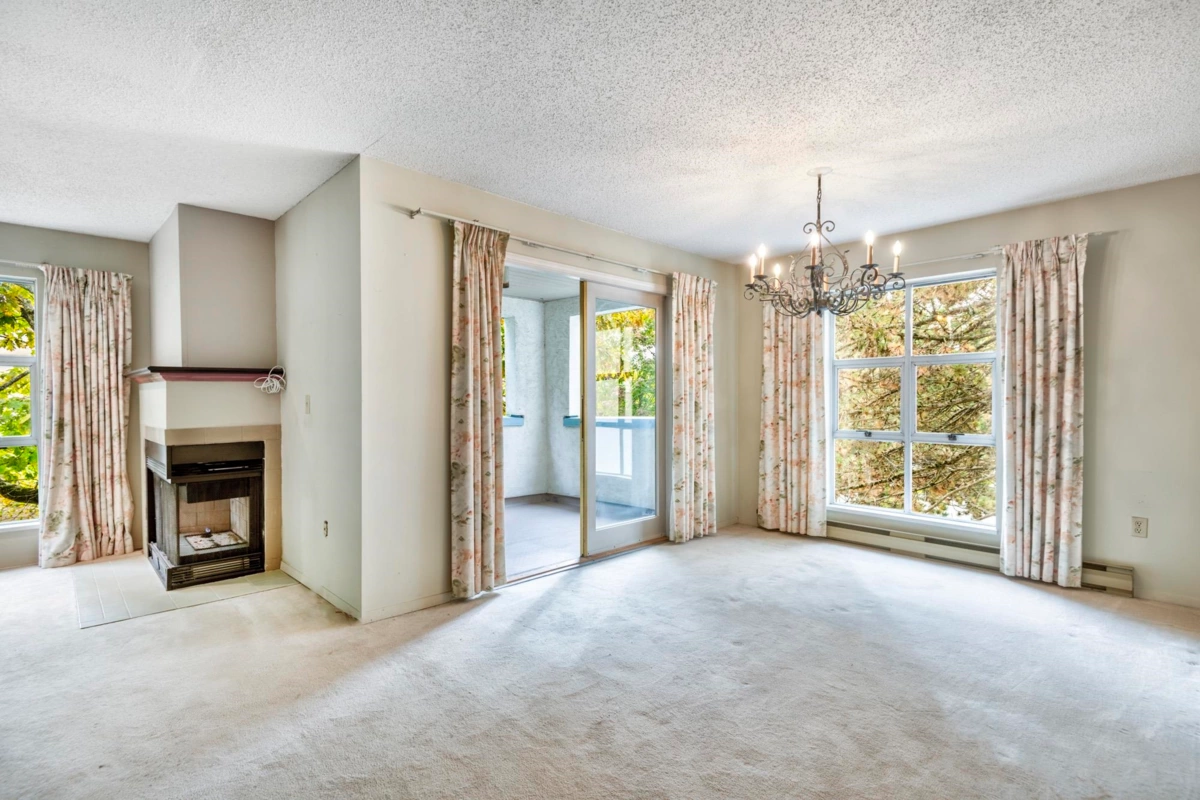 Spacious 2 bed, 2 bath corner suite in the heart of Richmond! Nearly 1,200 sq.ft. of bright, comfortable living with generous room sizes rarely found today. Features a large living area with cozy fireplace, open dining space, and functional kitchen with ample storage. Both bedrooms are well-sized, including a primary with walk-through closet and ensuite. In mostly original condition, an excellent opportunity to update and make it your own. Enjoy a private covered balcony overlooking mature greenery, in-suite laundry, and plenty of storage. Well-managed building with updated roof and re-piping. 1 parking & storage locker. Tremendous value & potential in a central, walkable location. Steps to Richmond Centre, Minoru Park, library, Aquatic Centre & Canada Line. Virtually staged.