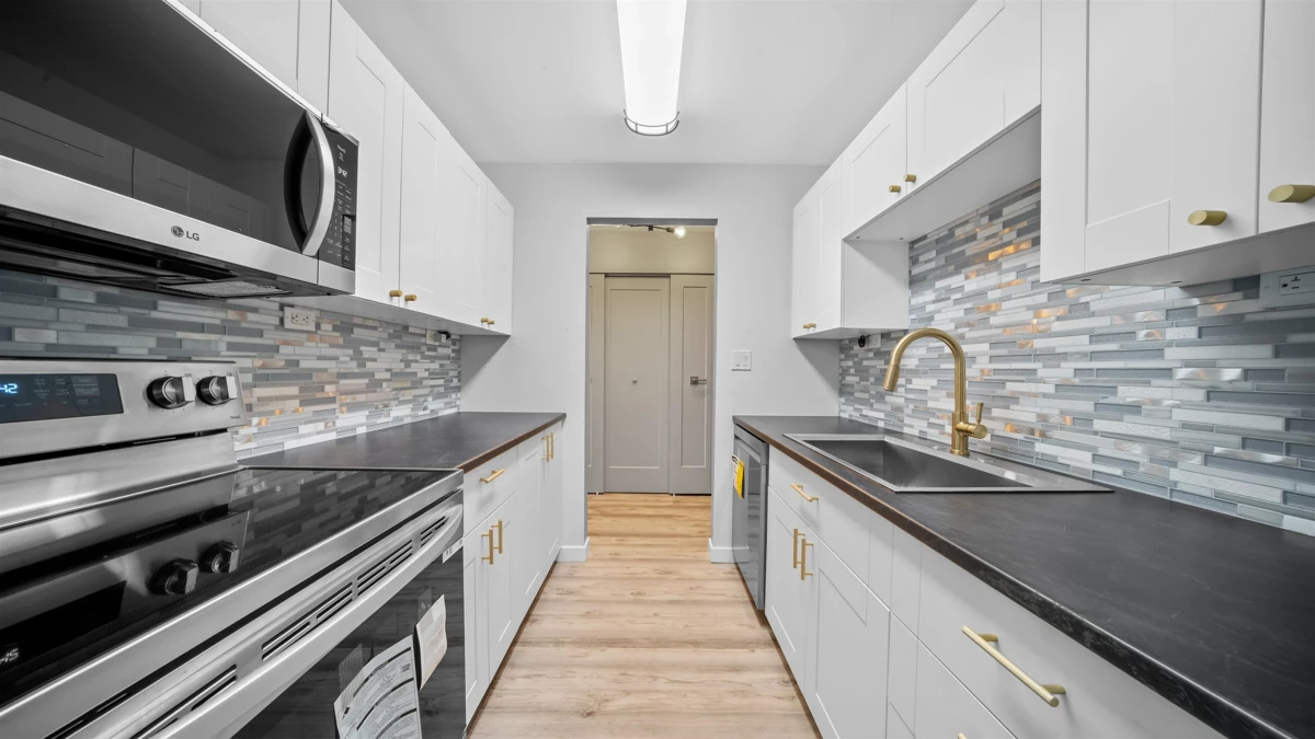 Welcome to this bright and modern northeast-facing home, perfectly situated just a short walk from Gateway SkyTrain Station and local shops. This 2-bedroom, 1-bathroom residence has been thoughtfully updated with sleek tile work, contemporary fixtures, that add style and functionality and new appliances (with a transferable warranty). Enjoy a spacious fully renovated bathroom featuring heated flooring, a fresh modern vanity, elegant backsplash, and a brand-new tub & toilet— all designed with sophistication and the feel of a hotel spa. This well-maintained building has also seen significant upgrades, including plumbing improvements, a new roof (2017), and new boilers (2023) — offering peace of mind and long-term value. This home checks all the boxes for comfort, style, and convenience!