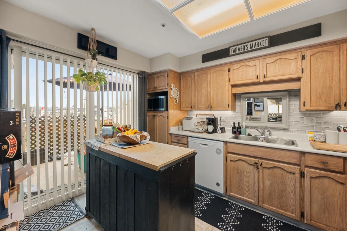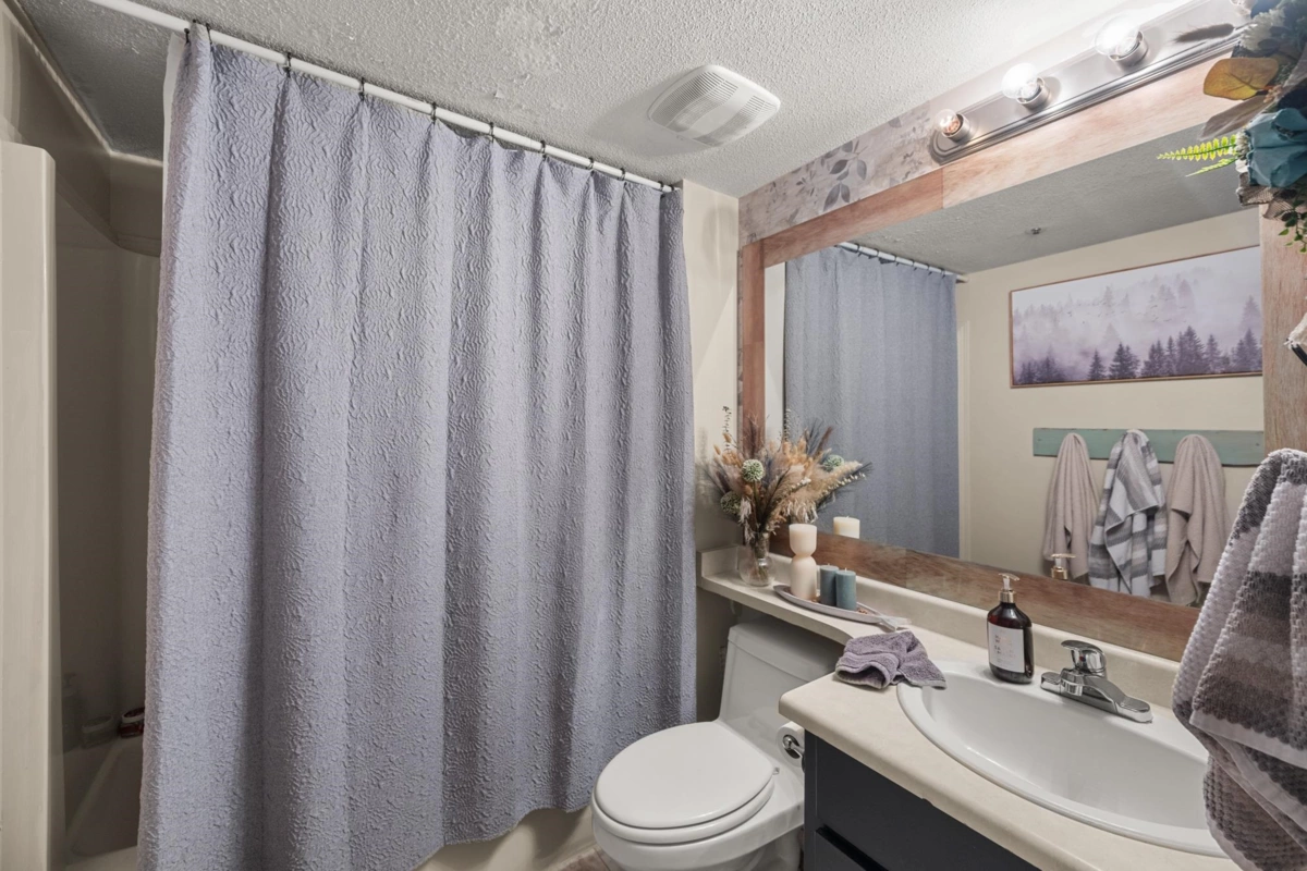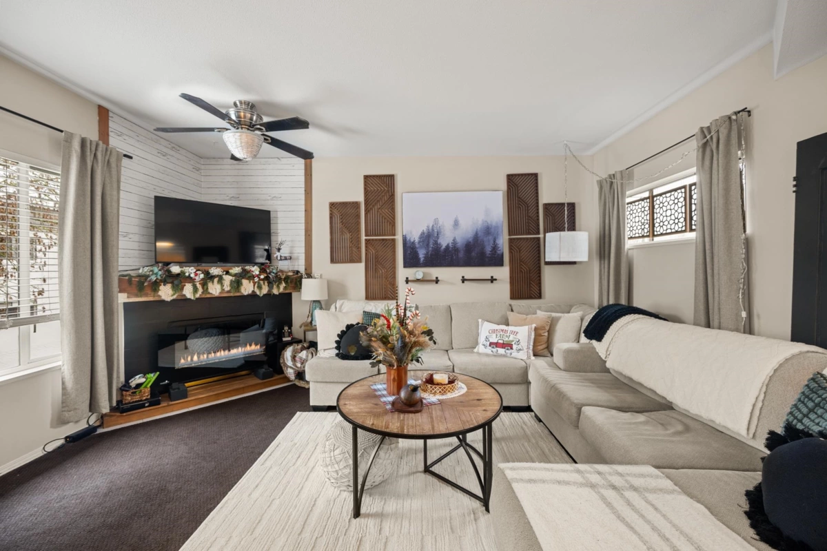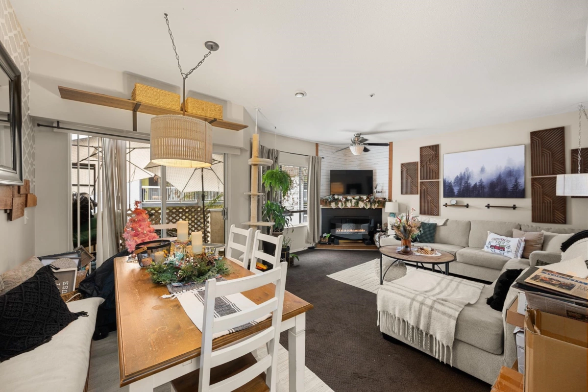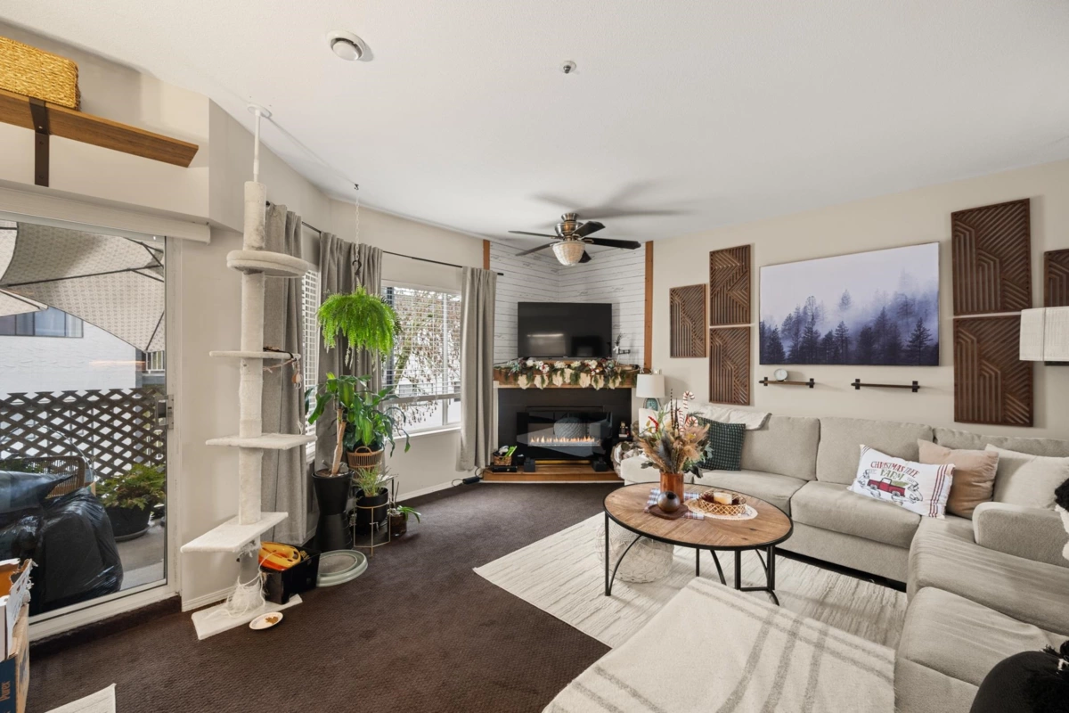 Bright corner-unit 2 bed, 2 bath condo in Langley City with two balconies and abundant natural light. The spacious primary bedroom is currently partitioned with a temporary curtain for an extra sleeping space. Features an open layout with large windows, a modern kitchen with a stainless steel fridge, in-suite laundry, and a cozy gas fireplace. Includes one secure underground parking stall and a storage locker. Close to shops, parks, restaurants, and future SkyTrain access—an ideal home or investment.