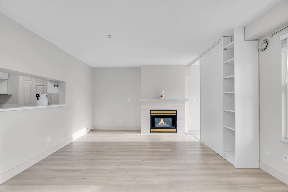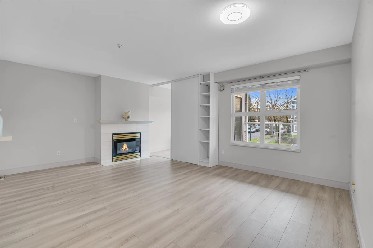 PERFECT QUITE LOCATION CHERRY HILL, Newly renovated suite, Bright 2nd floor with large covered balcony for a year round use, 1 bedroom plus den (can be 2nd bedroom with window) very kept gas fireplace and new floor and new appliances. Excellent well kept and well maintained building in a convenient location within walking distance to skytrain, bus, shops, restaurants and Kingsway. The storage locker room, bike room and underground secured car parking, Visitor parking and street parking. Radiant heat, in suit laundry. pass through kitchen. Well positioned fire place heat and water and gas including in strata fees. OPEN HOUSE Nov. 29-30 2025 (Sat. & Sun) 2pm-5pm