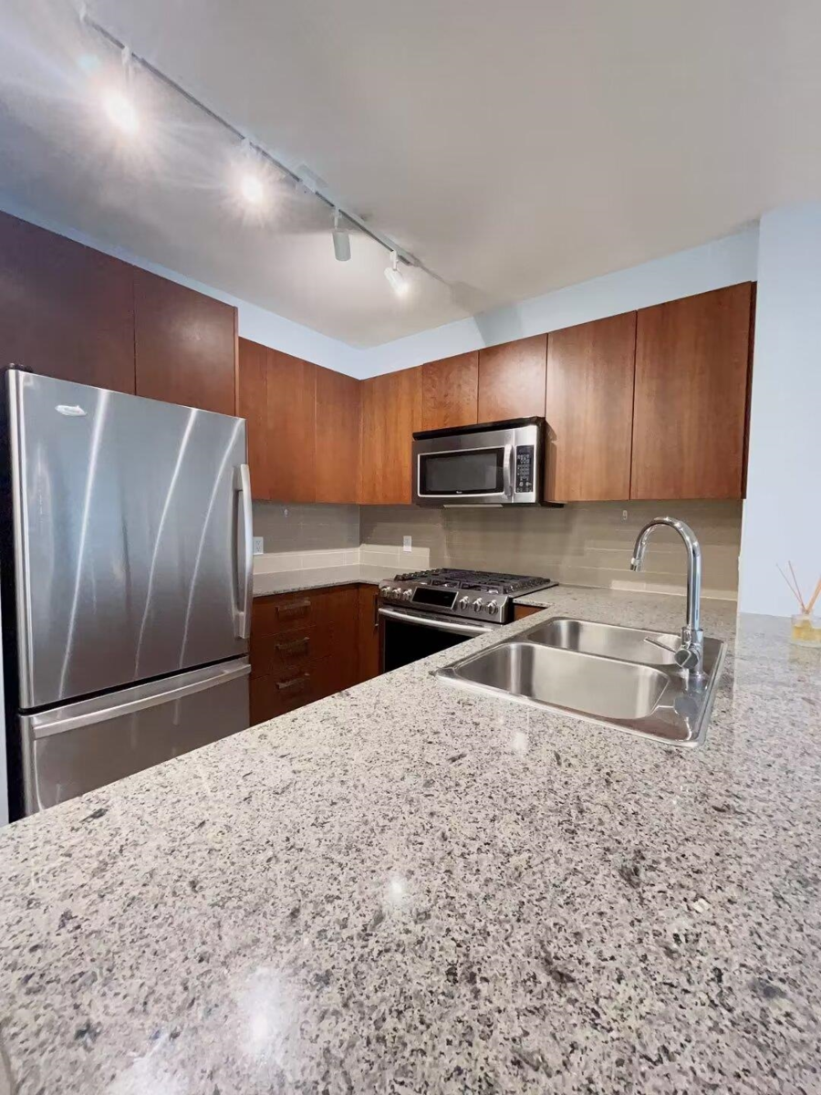 Situated in the heart of Burnaby, this thoughtfully designed one-bedroom plus nook home offers a bright and open layout with peaceful garden views from the living and dining areas. The modern kitchen is equipped with full-sized stainless steel appliances, a gas stove, granite countertops, a breakfast bar, and generous cabinetry for storage. Enjoy access to a variety of building amenities, including a guest suite, bike room, car wash station, landscaped gardens, and a social lounge. Just a short walk to the SkyTrain, schools, dining options, and Studio Brewing—everything you need is right at your doorstep.