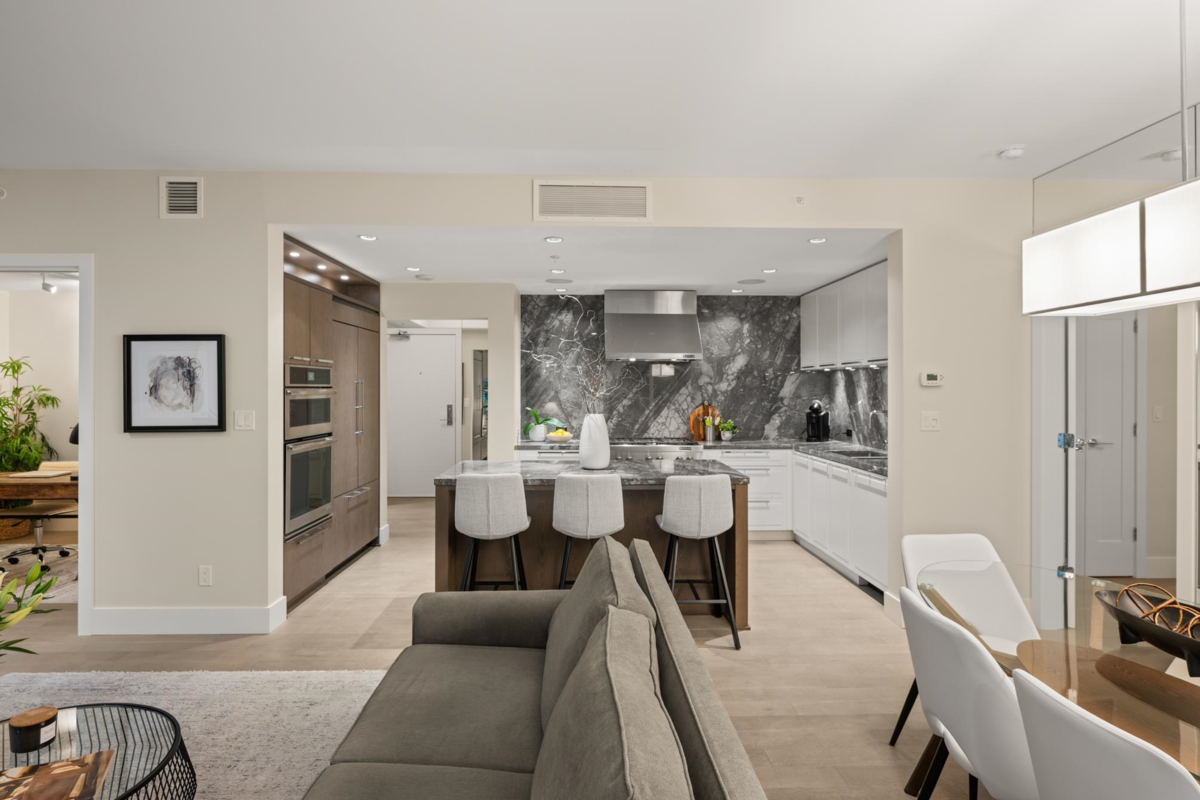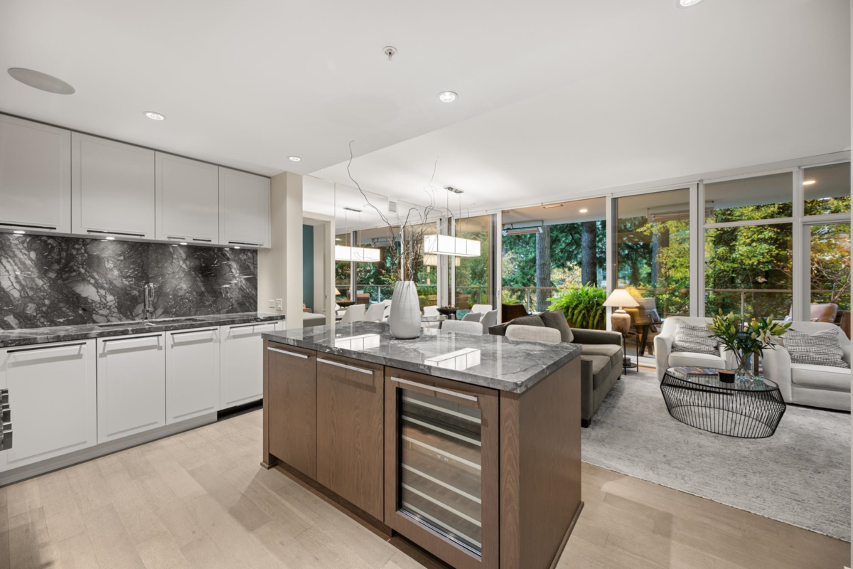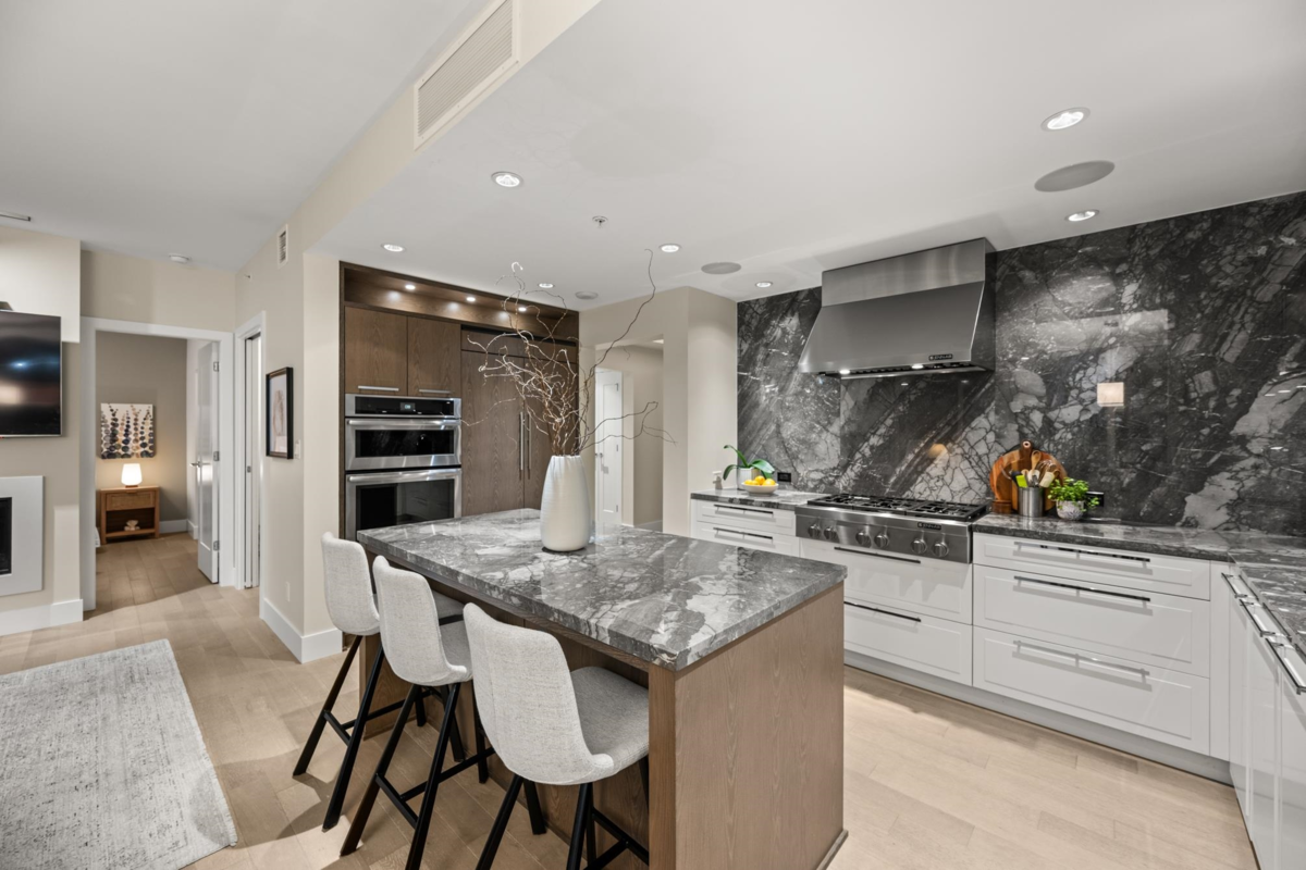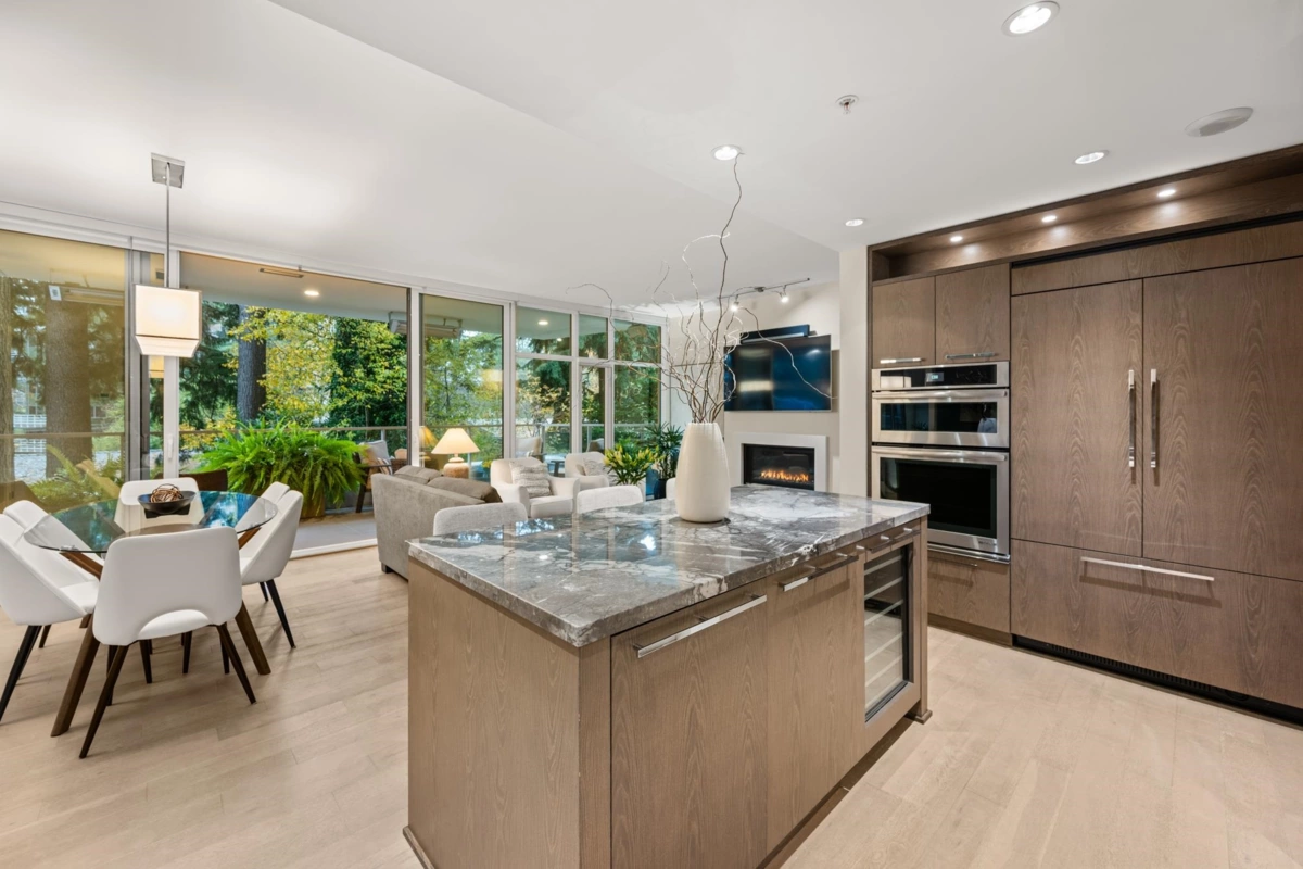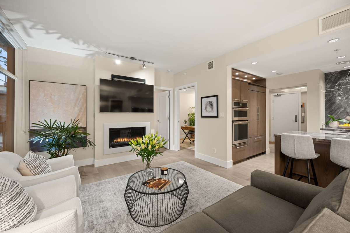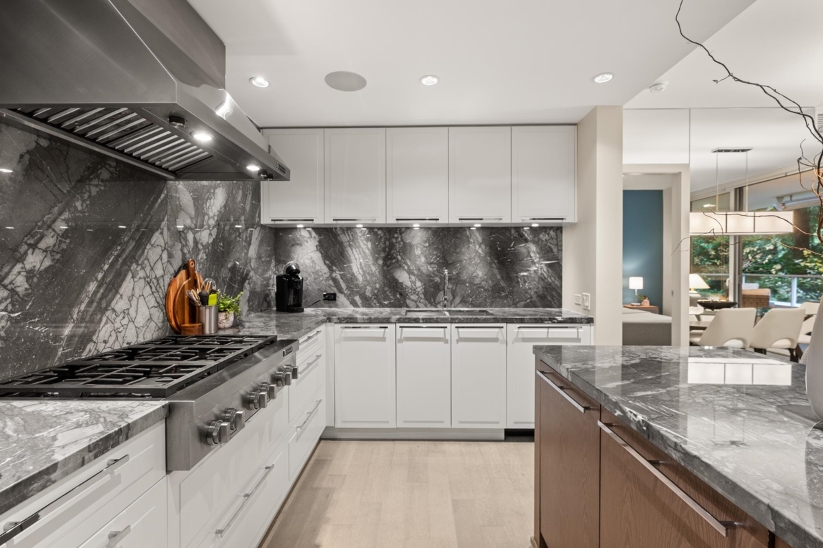THE BEVERLEY! This home exudes grace & class. Luxury 2-bedroom plus den condo with attention to detail that will impress the most discerning Buyer. Spacious gourmet kitchen features dramatic marble backsplash, large island, deluxe cabinets & top of the line professional-grade integrated appliances (6 burner gas cooktop & wine fridge). Sleek updated fireplace. The generous primary fits a king-sized bed & joins a spa-inspired ensuite. The second bedroom also has its own ensuite. Expansive 228 sq ft balcony, outdoor heaters & full laundry room complete this home. Two side/side parking stalls with EV charger. Beautifully maintained unit in a desirable concrete building with amenities galore. Indoor pool, hot tub, steam, sauna, gym, guest suite & concierge. Live close to everything!