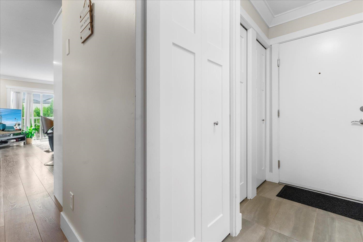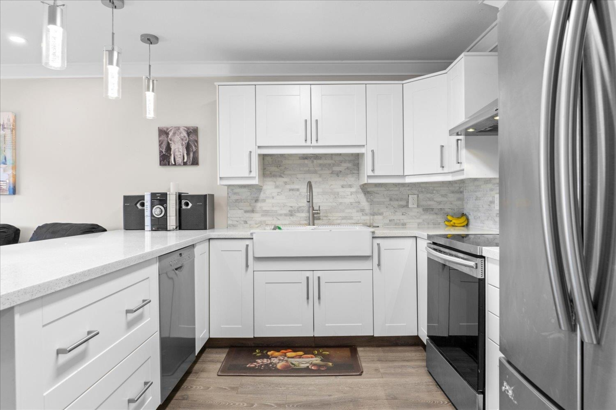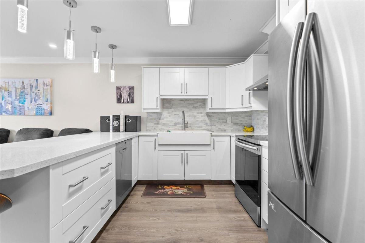 Be impressed by this large THREE BEDROOM corner condo at McIntosh Village! You'll love the floor to ceiling renovations and an abundance of living space. This suite features trendy laminate floors, updated LED lighting, crown molding, and in-suite laundry. A gorgeous white kitchen with quartz counters and an eating bar is the focal point of the open living area and offers plenty of cabinetry. From the living area, step out onto the private balcony with mature landscaping all around. The bathroom is also beautifully updated with slate tile and white cabinetry. Extra perks include an in-condo storage room, affordable strata fees, and top-floor living. Conveniently located between Sardis and Chilliwack's rejuvenated downtown, this condo is the ideal home for a first time buyer. SHOWS A TEN!