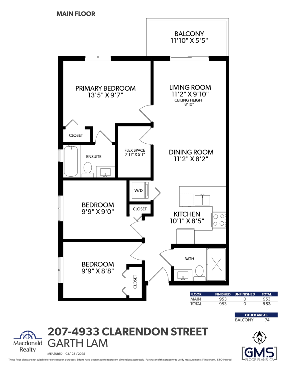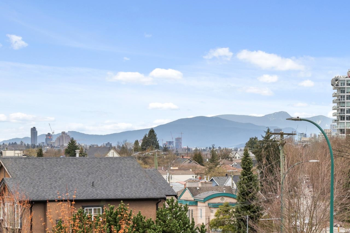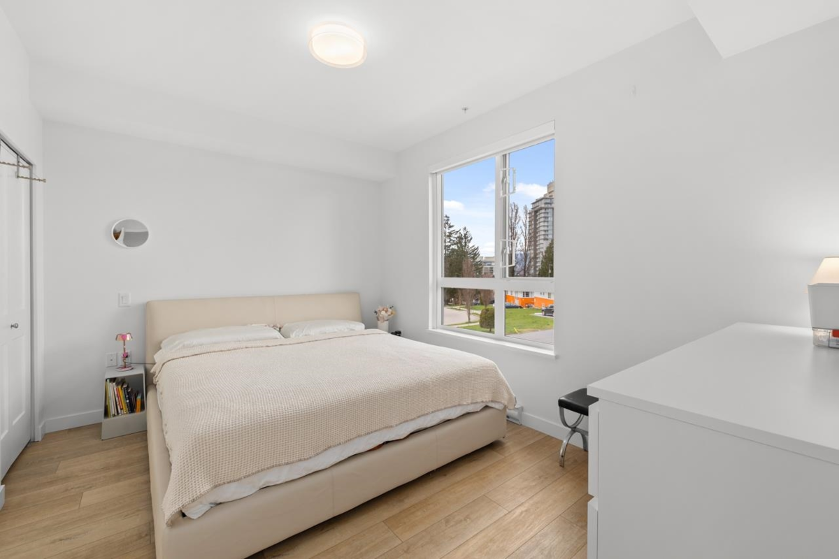 CLARENDON HEIGHTS – Bright 3 bed, 2 bath + flex corner home with stunning North Shore mountain & city views! Scandinavian-inspired kitchen features quartz counters with lots of space, double sink & full-size SS appliances. Open living/dining flows to a north-facing balcony perfect for relaxing or entertaining. All 3 bedrooms enjoy natural light & lots of privacy. Bonus flex space can be used as a Den or extra storage along with 2 storage lockers & 1 parking included. Building offers rooftop patio space, playground & amazing views. This home is move in ready and meticulously cared for like brand new all without the GST!