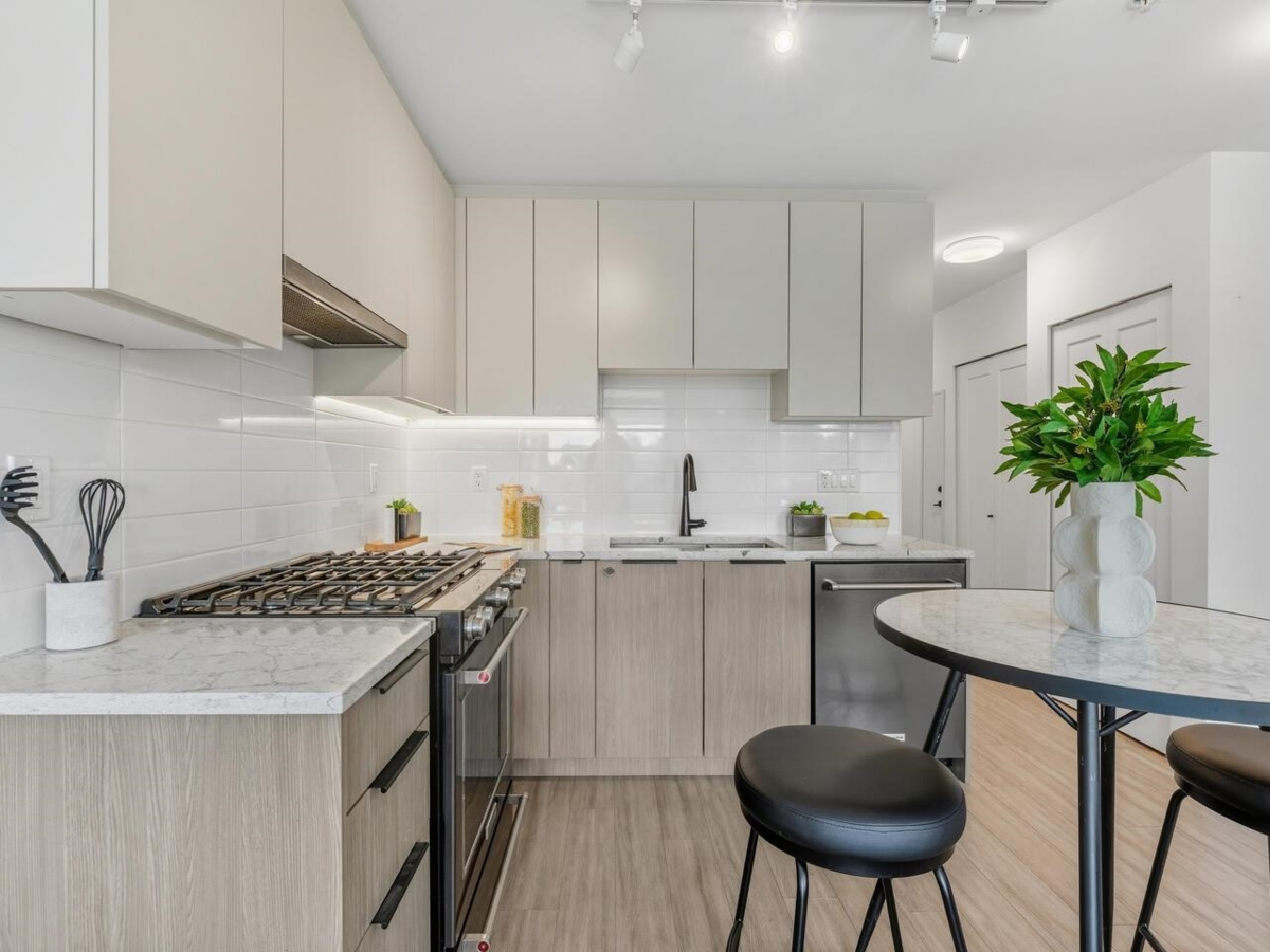ELLA by TRILLIUM. Like new studio (but with no GST!) in an ideal location a short walk to the best parts of Commercial Drive and Hastings for bakeries, coffee, dining - Everything! Beautifully designed with an efficient layout, high ceilings and contemporary finishes throughout and an open treed outlook. Wide plank hard surface flooring, quartz countertops, two tone cabinetry, matte black hardware, gas range, and juliet balcony. Built by a reputable developer, it's a smart choice for a first time buyer or cash-flow investor with low strata fee and great value. Pets and rentals okay, includes a storage locker. Open House Saturday November 29th from 2:30pm - 3:30pm.