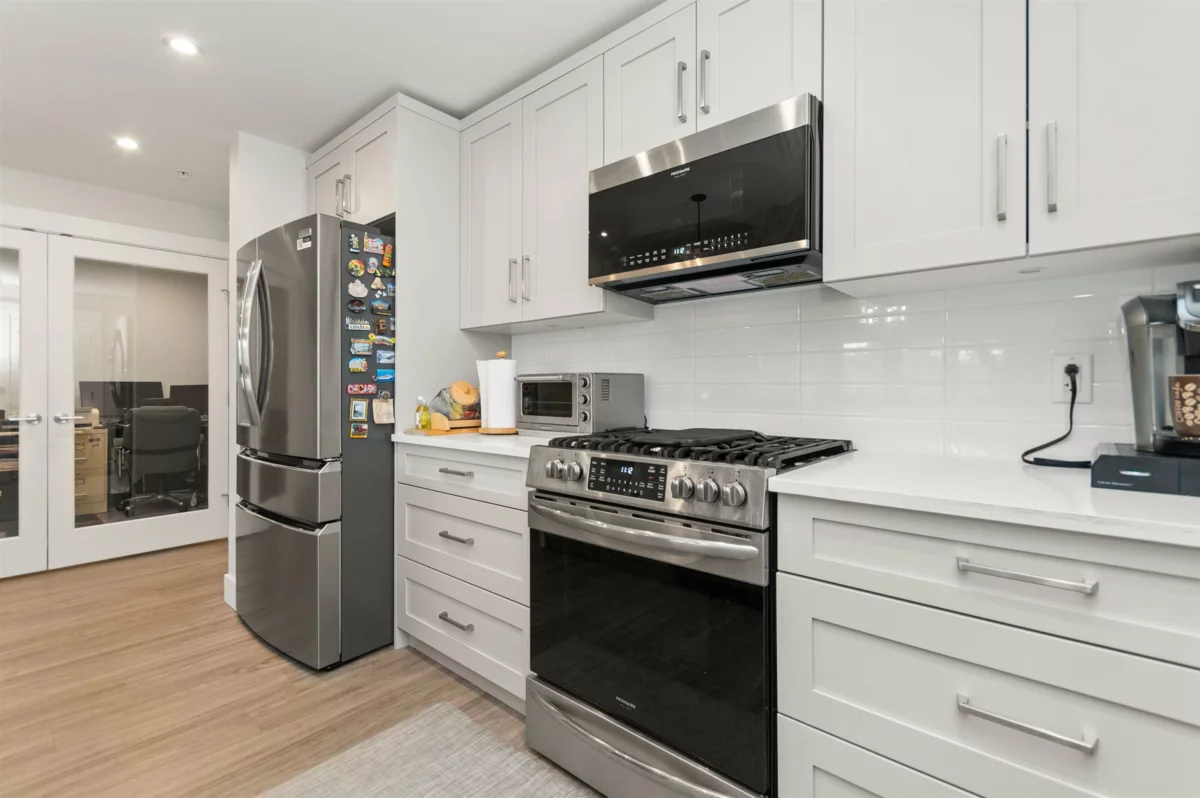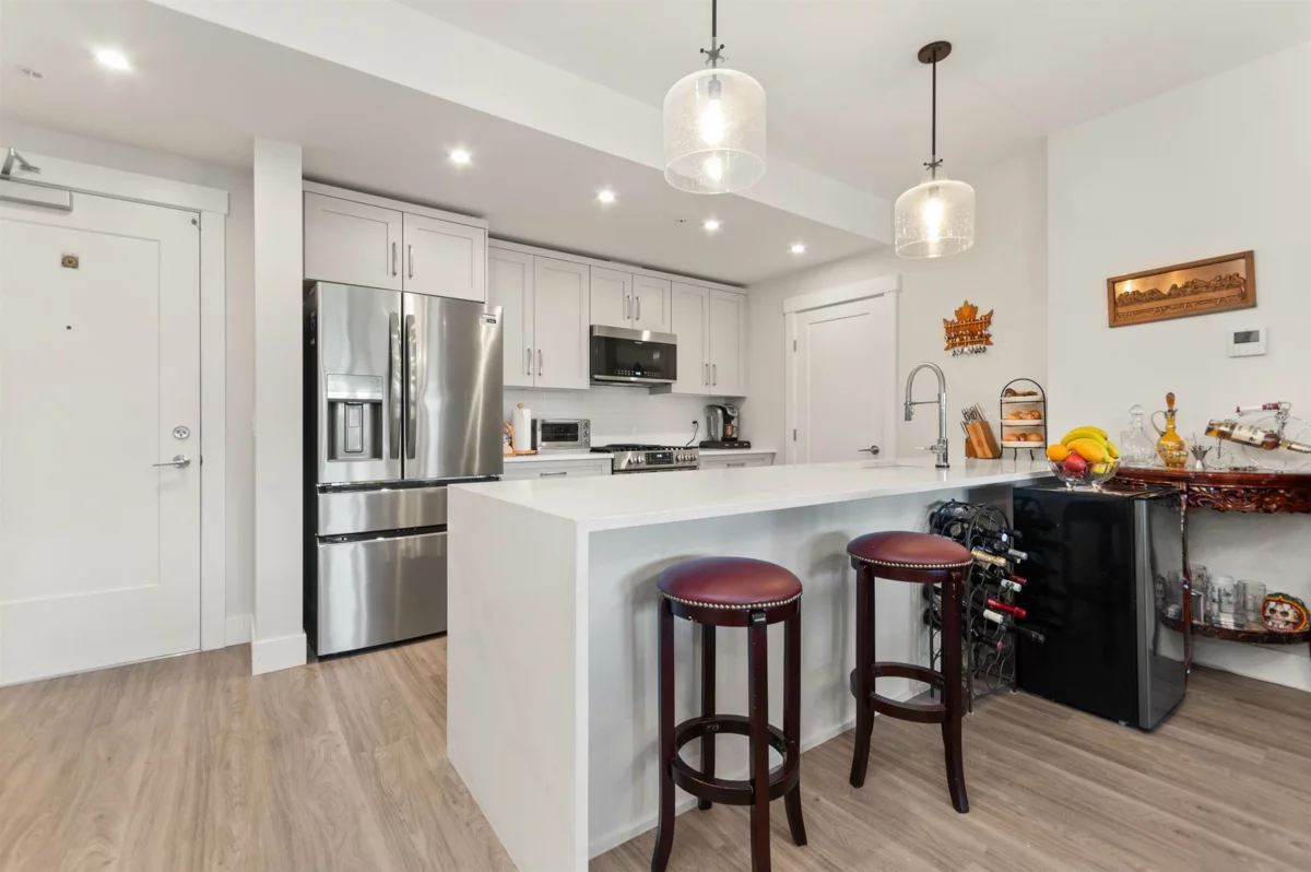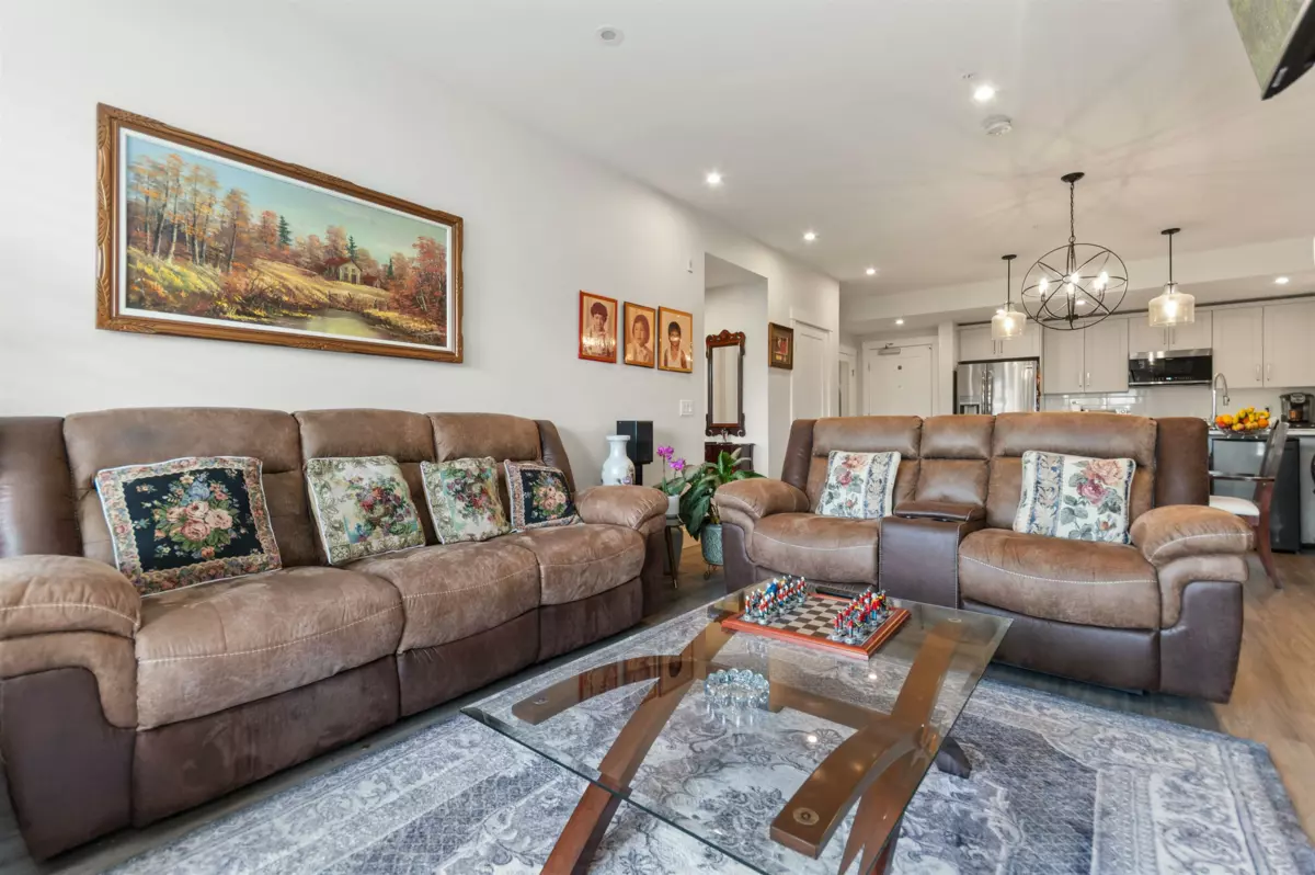 Just like new and no GST! Welcome to luxury adult living (45+) in SKYNEST 2. This immaculate 2 bedroom, 2 bathroom & den features 9 foot ceilings, a bright open floor plan with spacious kitchen and room to entertain. This unit was fully upgraded with wide plank vinyl flooring, Silestone quartz counter tops with soft close drawers, elegant lighting, quality white cabinetry, air condtioning, modern electric fireplace, and high end appliance package with a gas range. Enjoy your morning coffee on the oversized deck complete with BBQ gas hook up. This pet friendly complex has many amenities including guest suites, a clubhouse with roof top patio, fire tables and outdoor kitche, parking stall, and storage locker. Conveniently located within walking distance to banks, shopping, and recreation.