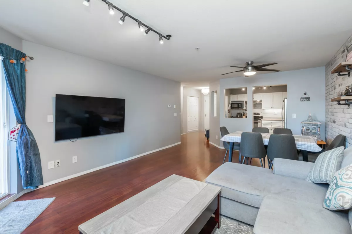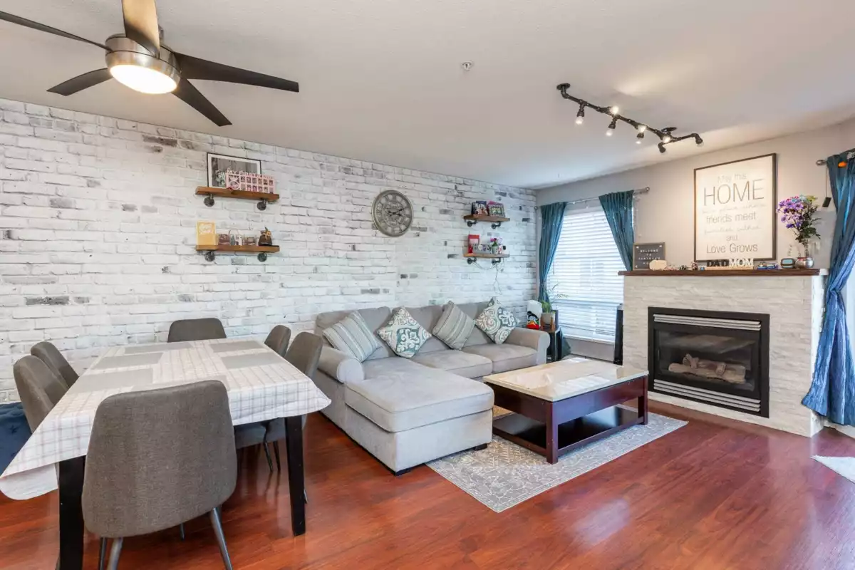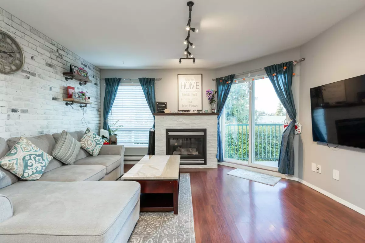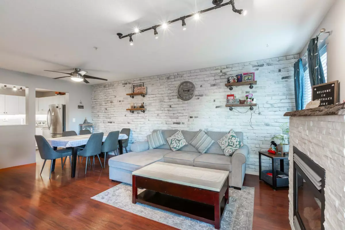 This updated 2-bedroom, 2-bathroom condo is perfect for first-time buyers or down sizers. Modern upgrades include sleek laminate flooring, fresh paint, stylish light fixtures, and a charming rock fireplace with a wood mantle. Located at the quiet rear of the building, it offers privacy and stunning sunset views from the deck. The spacious kitchen, living, and dining areas are ideal for entertaining, and the cozy gas fireplace adds warmth. Includes 1 secured underground parking spot (fits a full-size pickup), storage locker, bike cage, and guest suite. Centrally located within walking distance to amenities.