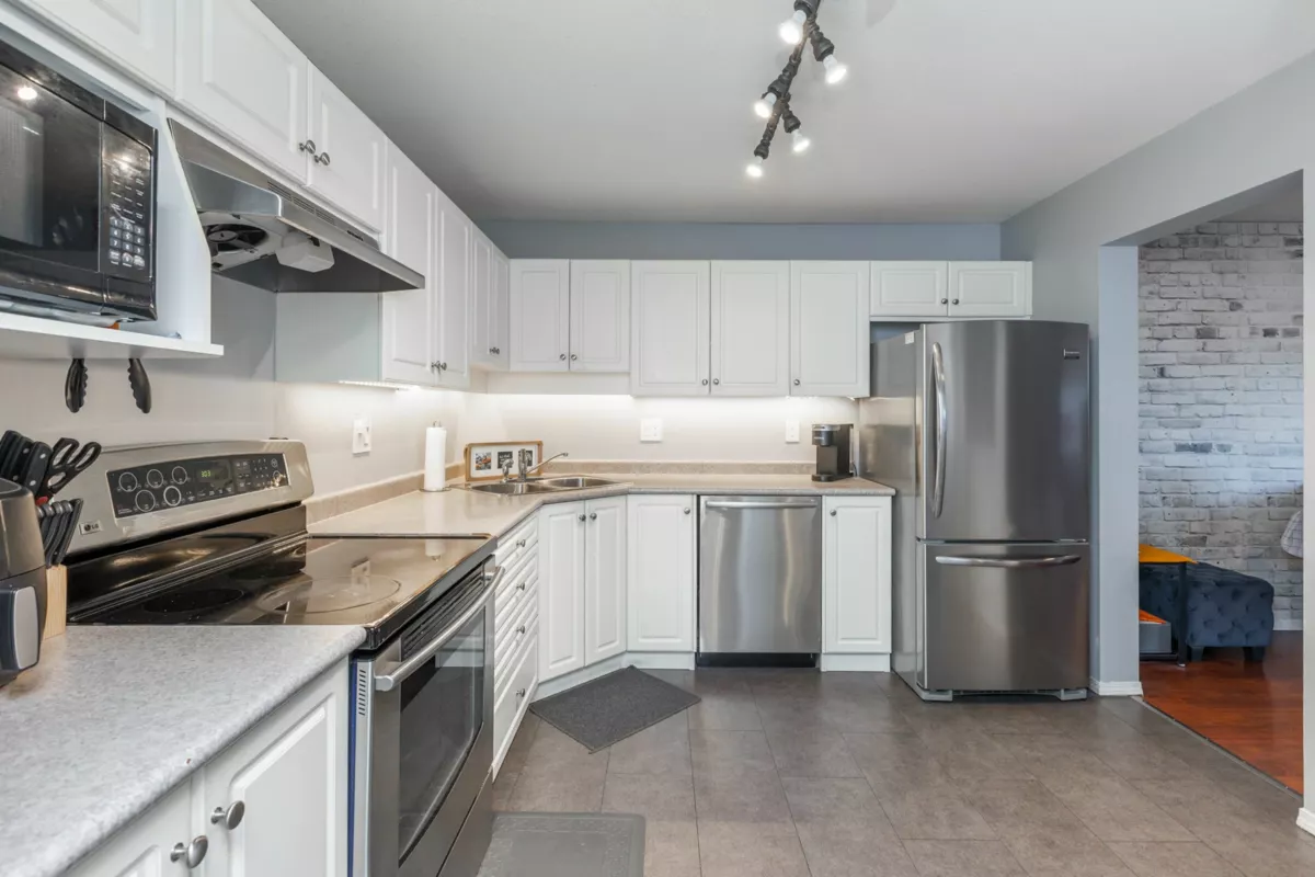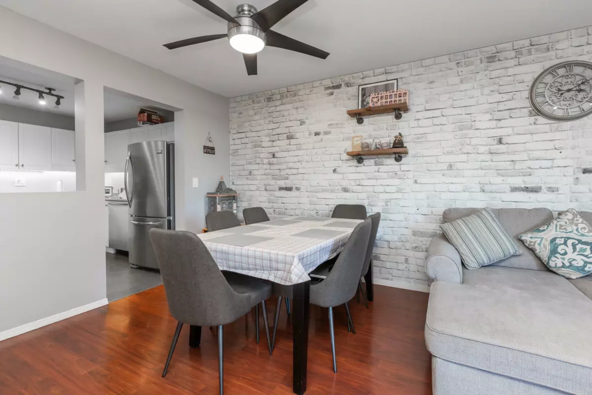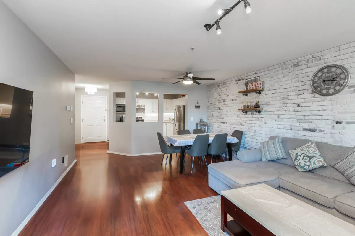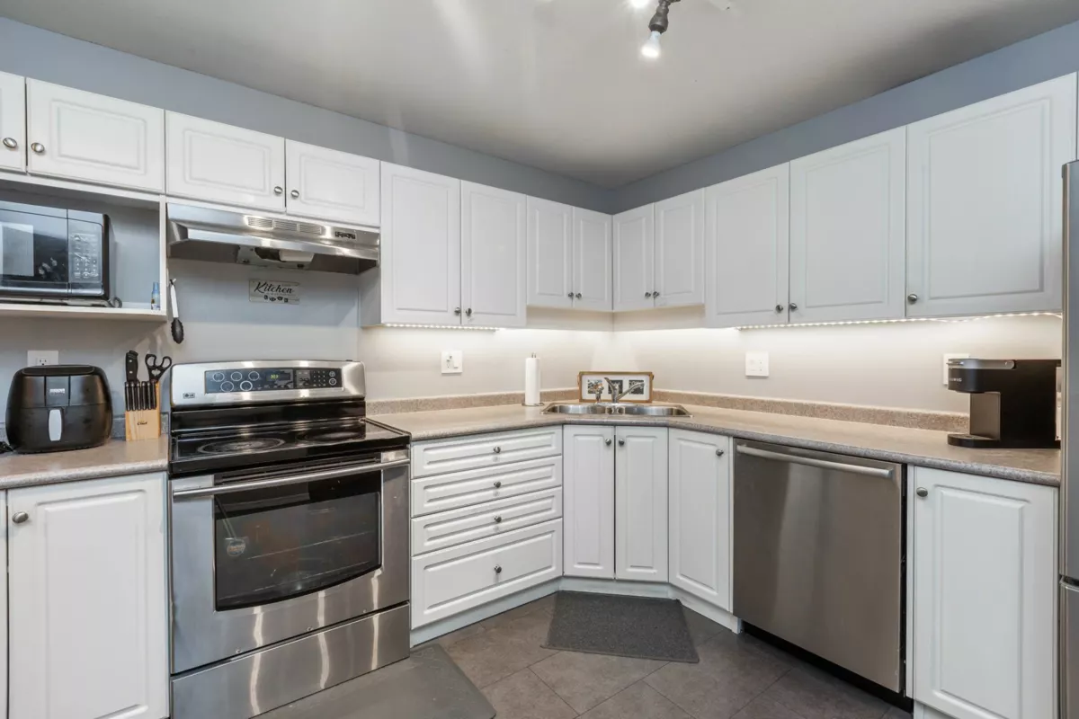 This updated 2-bedroom, 2-bathroom condo is perfect for first-time buyers or down sizers. Modern upgrades include sleek laminate flooring, fresh paint, stylish light fixtures, and a charming rock fireplace with a wood mantle. Located at the quiet rear of the building, it offers privacy and stunning sunset views from the deck. The spacious kitchen, living, and dining areas are ideal for entertaining, and the cozy gas fireplace adds warmth. Includes 1 secured underground parking spot (fits a full-size pickup), storage locker, bike cage, and guest suite. Centrally located within walking distance to amenities.