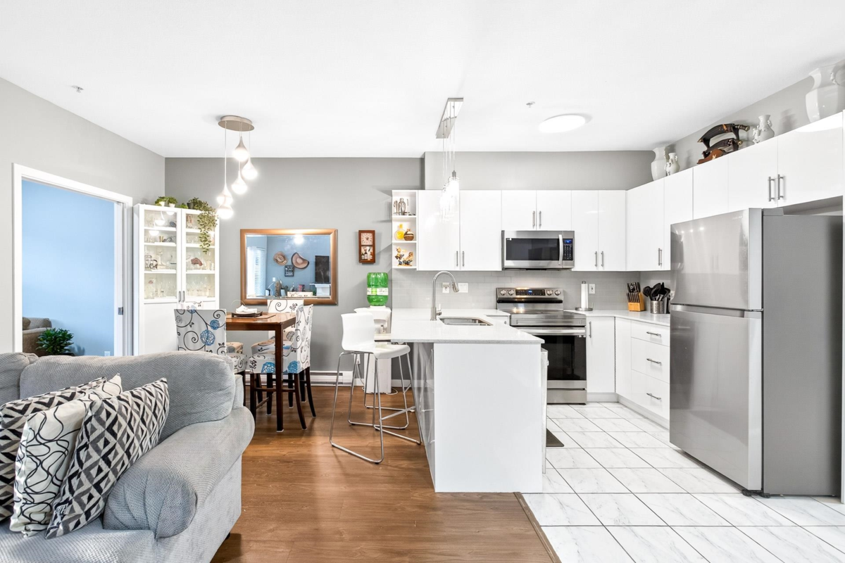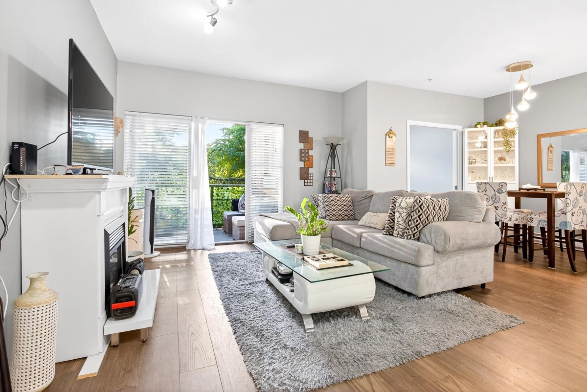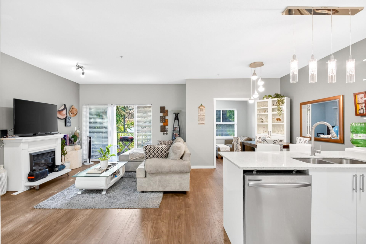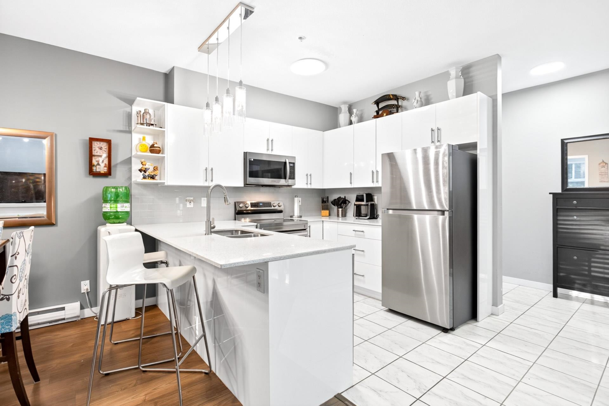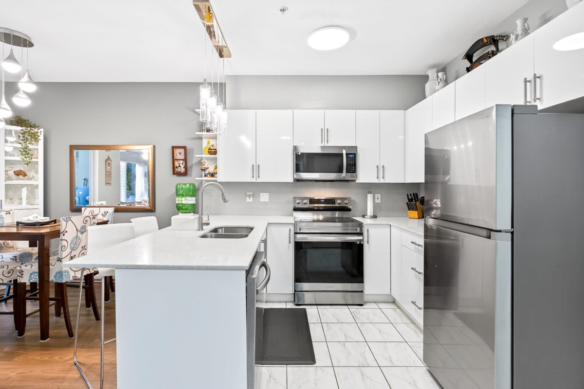 Rare CORNER UNIT alert! This stunning 1,143 sqft home offers 2 bedrooms, 2 baths + den (large enough for a 3rd bedroom), perfect for downsizers or small families. Located directly across from Gates Park with panoramic views and scenic riverside trails. Features include 2 parking spots with EV charging capacity and a storage locker. The open-concept layout showcases a modern kitchen with stainless steel appliances, quartz counters, and a large island with breakfast bar flowing into the bright dining and living areas—spacious enough for house-size furniture. The primary suite offers deck access, a windowed ensuite with dual sinks, and a soaker tub. Steps to parks, schools, shops, trails & West Coast Express. BONUS: MASSIVE 200+ sqft covered balcony running through majority of the unit!