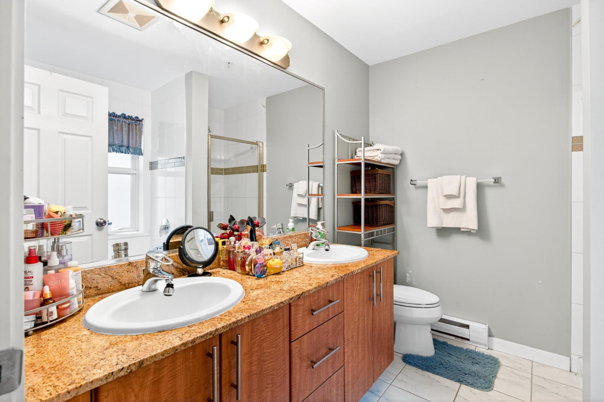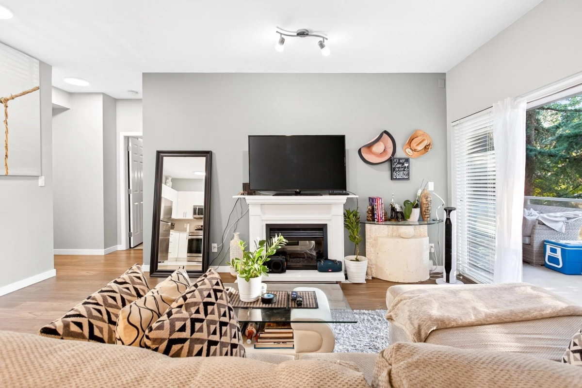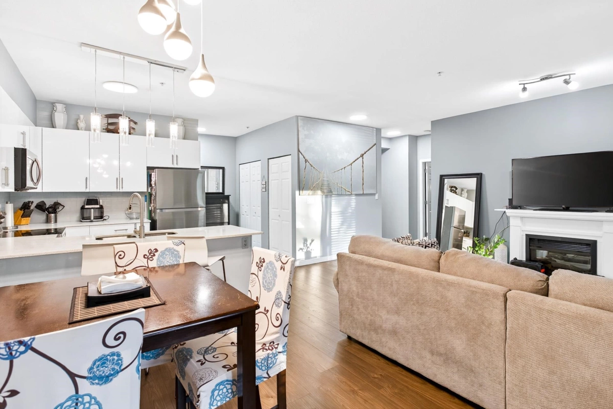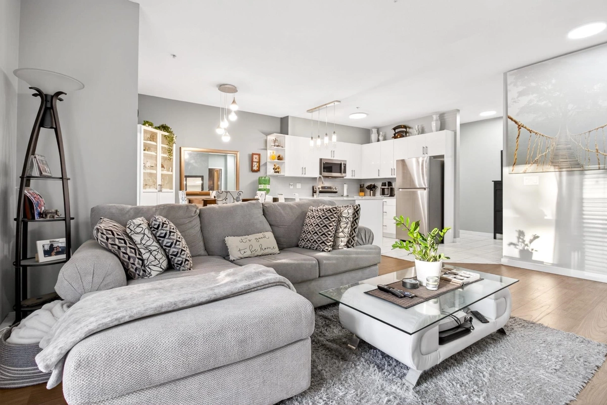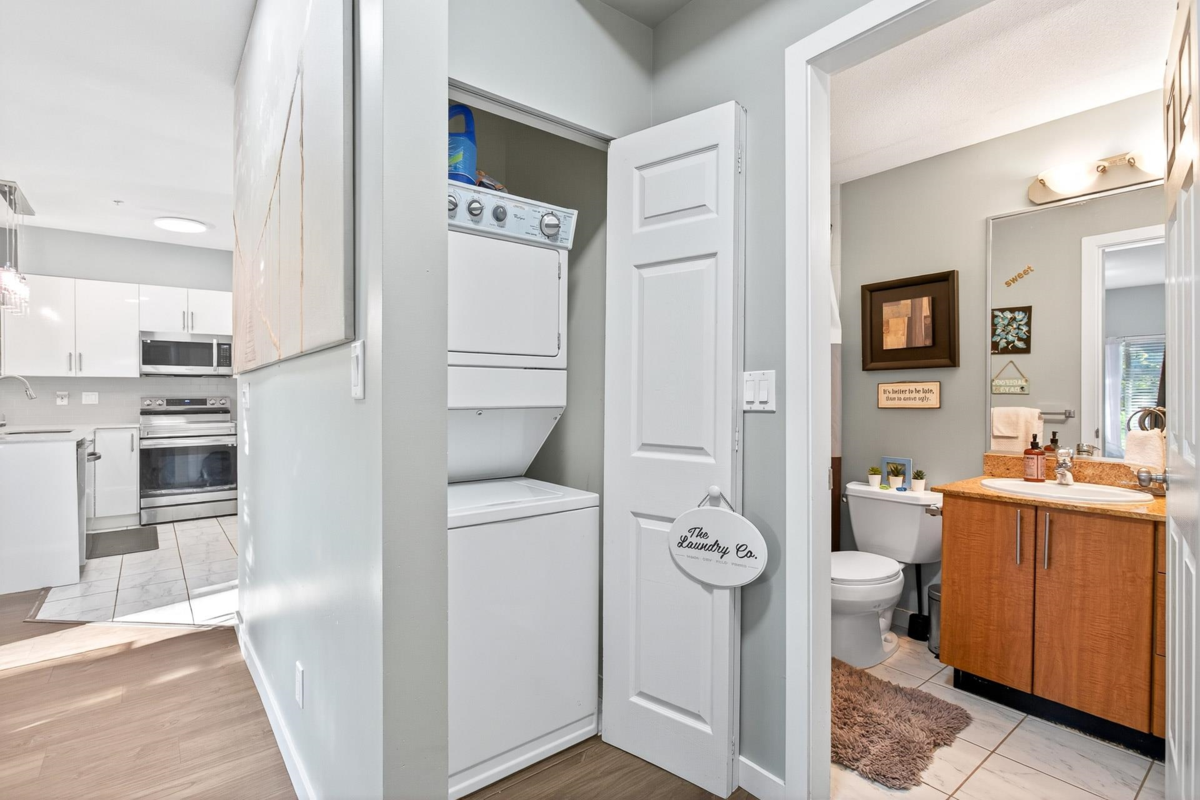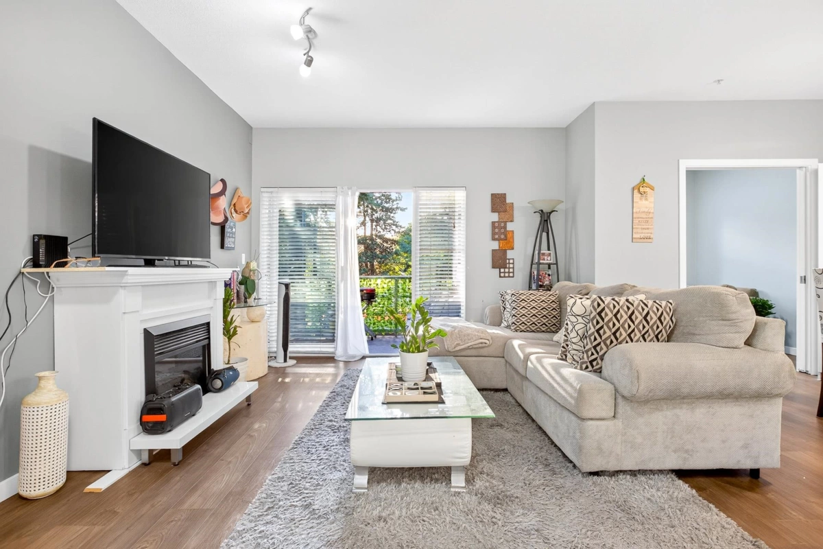 Rare CORNER UNIT alert! This stunning 1,143 sqft home offers 2 bedrooms, 2 baths + den (large enough for a 3rd bedroom), perfect for downsizers or small families. Located directly across from Gates Park with panoramic views and scenic riverside trails. Features include 2 parking spots with EV charging capacity and a storage locker. The open-concept layout showcases a modern kitchen with stainless steel appliances, quartz counters, and a large island with breakfast bar flowing into the bright dining and living areas—spacious enough for house-size furniture. The primary suite offers deck access, a windowed ensuite with dual sinks, and a soaker tub. Steps to parks, schools, shops, trails & West Coast Express. BONUS: MASSIVE 200+ sqft covered balcony running through majority of the unit!