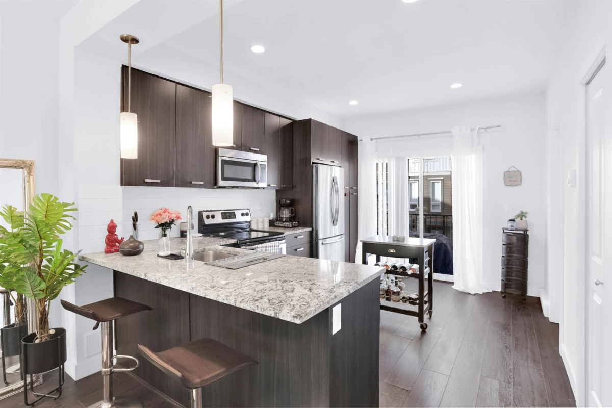 Welcome to ONE44 in sought after Sullivan Station! Nearly new 3 bed+large den townhome by Vesta Properties, occupied by only one owner and shows like brand new. Bright open layout with 9 ft ceilings, modern finishes, and elegant design. Gourmet kitchen with granite counters, stainless appliances & large island flows to spacious living and dining areas. Den is full-sized ideal as 4th bedroom or office. Enjoy a private deck with custom screens on all windows & doors for fresh air year round. Well kept complex with clubhouse, gym & meeting room in a prime location close to schools, parks, YMCA, shops & transit. Bright, stylish & move-in ready this home combines space, upgrades & location for the perfect lifestyle! Book your showing now for a chance to view this exceptional unit it won’t last!