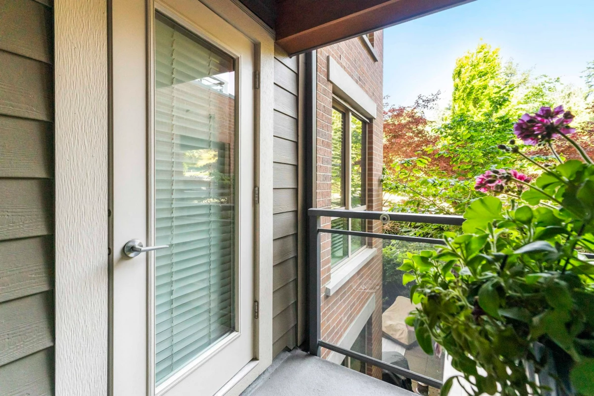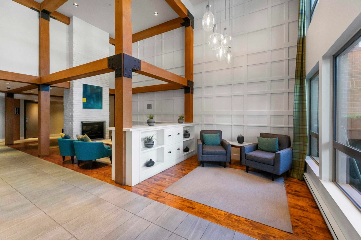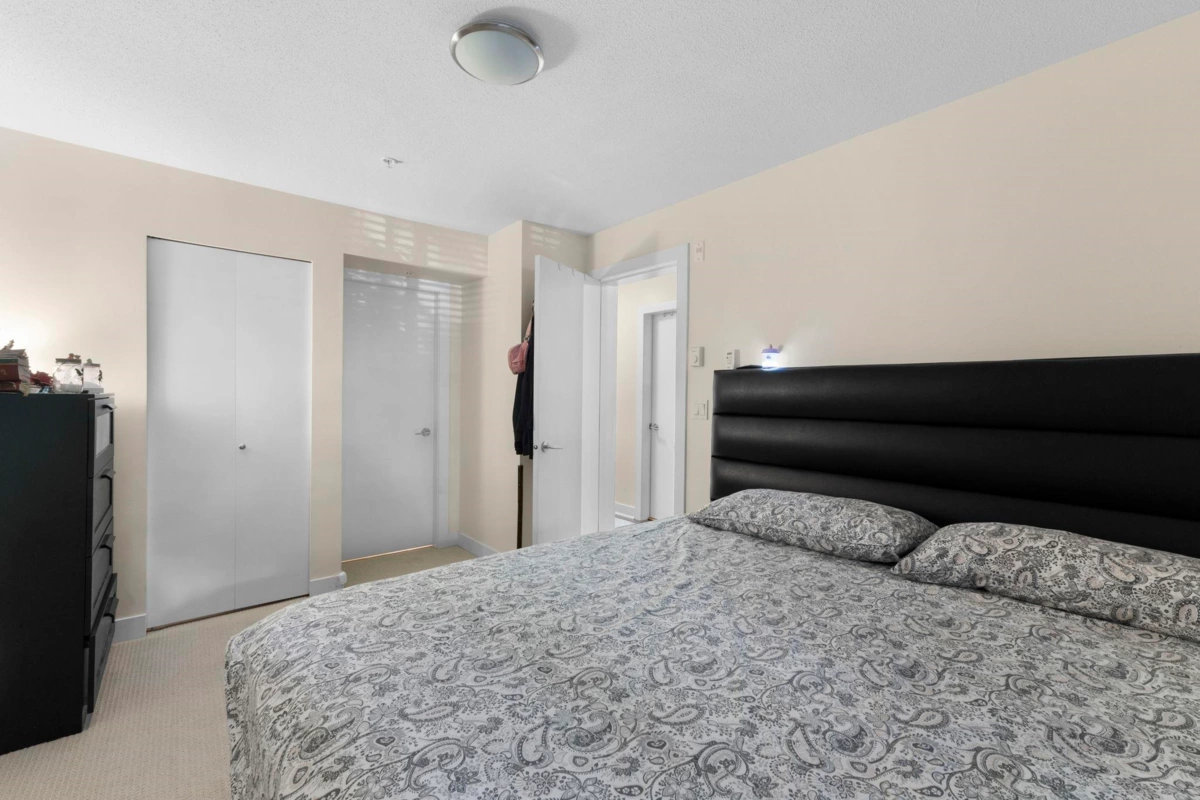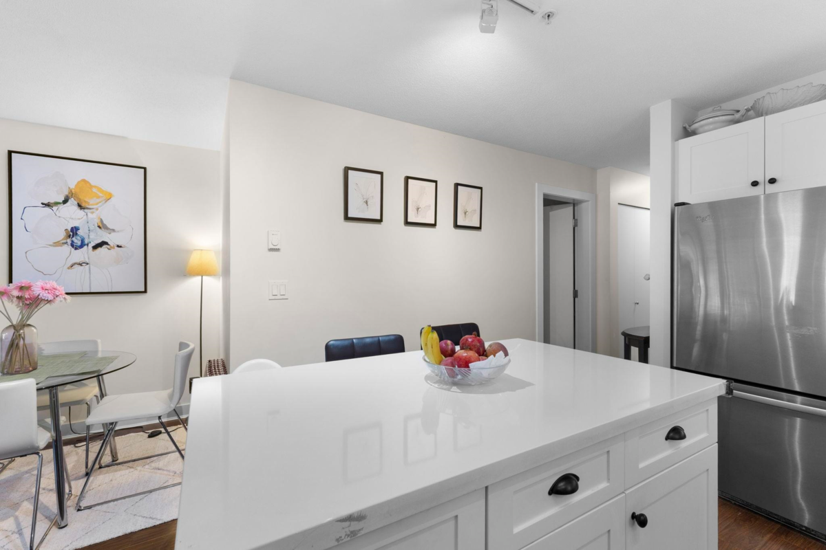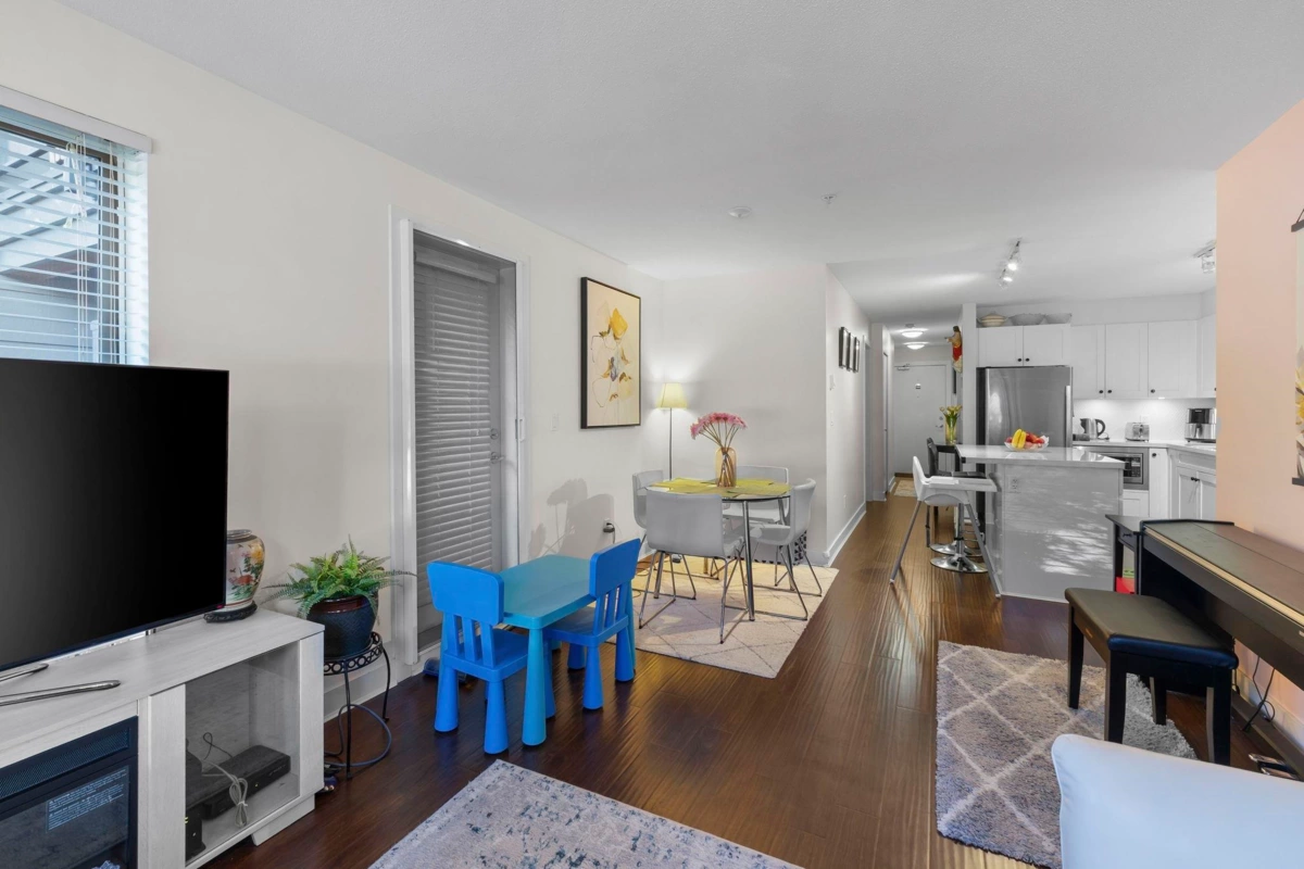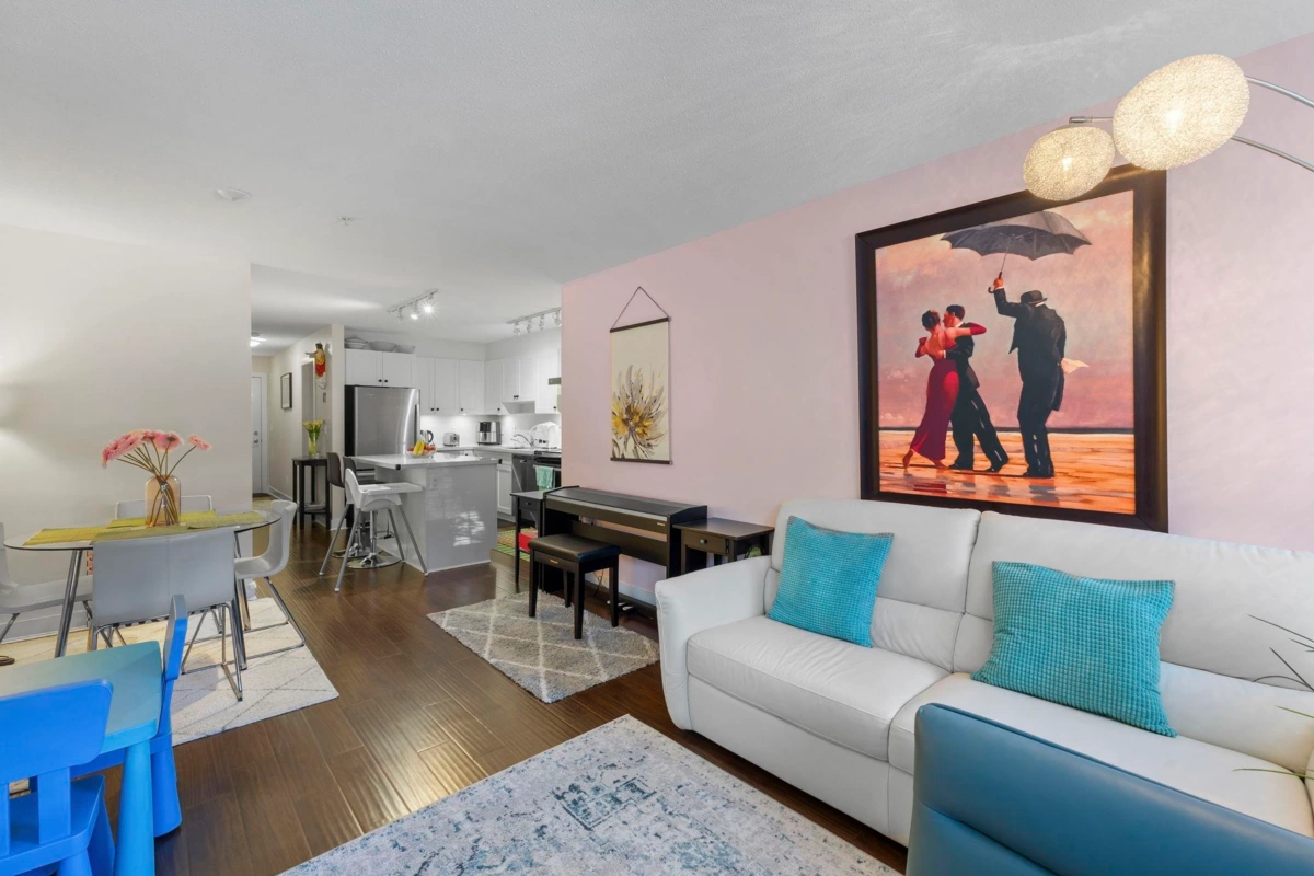 Welcome to Dominion by Ledingham McAllister in the heart of New Westminster. This bright and spacious 1 bed plus large den home offers flexible living, with a den big enough for a second bedroom or office. Enjoy a modern kitchen with quartz counters, stainless steel appliances, soft-close cabinetry, and a floating breakfast bar. The open layout flows to a covered patio perfect for relaxing. The primary bedroom features a walk-in closet, cheater ensuite, and views of the Royal Gardens. Includes parking, storage, and access to a secure bike room. Steps to SkyTrain, Douglas College, shops, and cafes. A beautiful home in an unbeatable location!
