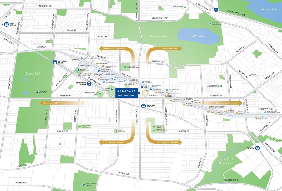 JUST REDUCED! Welcome to ETERNITY! This stylish and meticulously kept 2 bed, 2 bath corner unit with 2 balconies offers nearly 800 SF of functional living in the heart of Burnaby. Designed for comfort and privacy, the smart layout places bedrooms on opposite sides. The modern, spacious kitchen opens seamlessly to the dining and living areas—perfect for entertaining. The second bedroom features access to its own private balcony, while the generous primary suite includes a private ensuite and large walk-in closet. Enjoy 9’ ceilings, two private balconies for outdoor relaxation, plus 1 parking and 1 storage locker. Quiet inside location, just steps from Metrotown, Royal Oak SkyTrain, shops, and more. Call today for private viewing! Open House Sat. Nov.29th, 2-4 P.M!