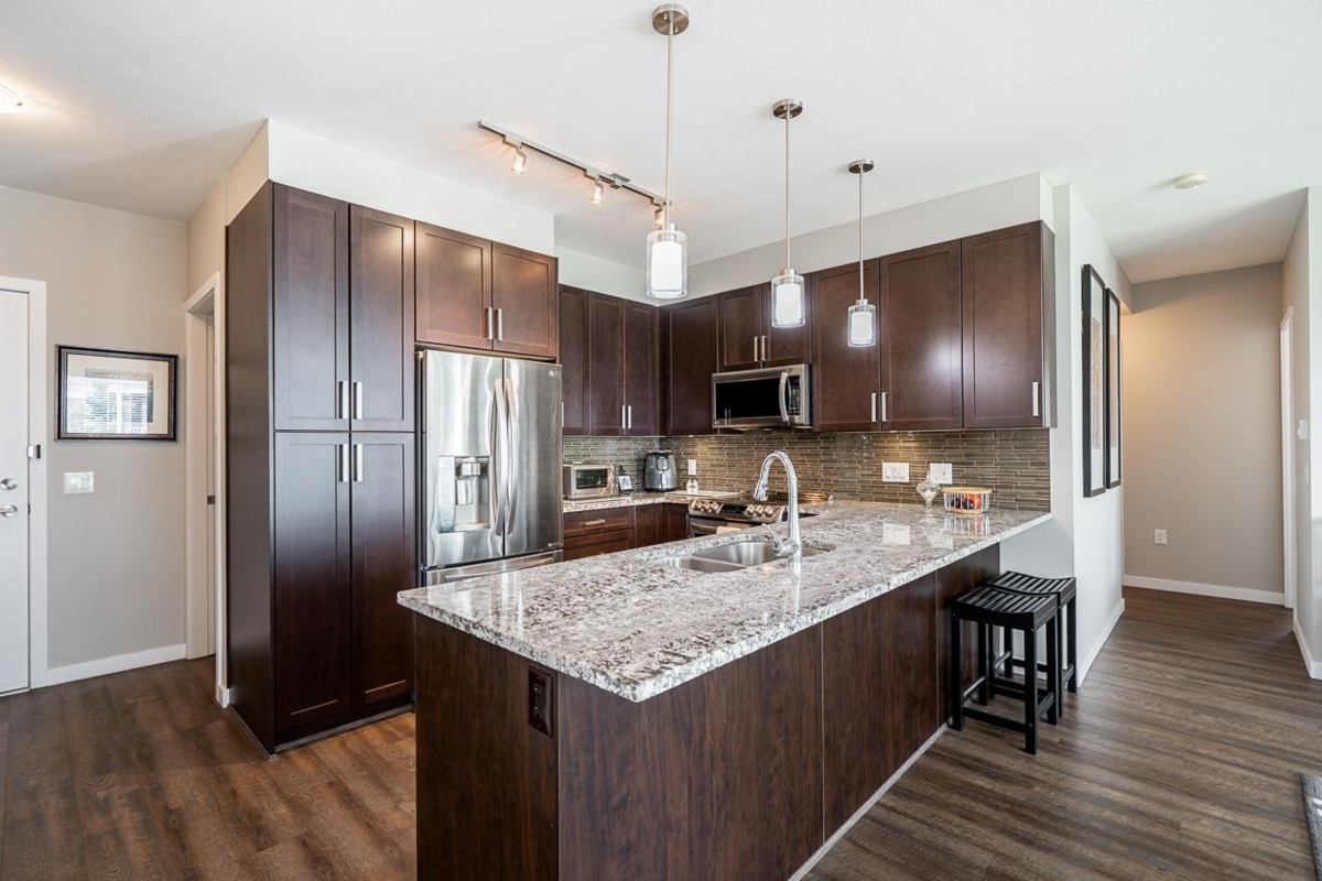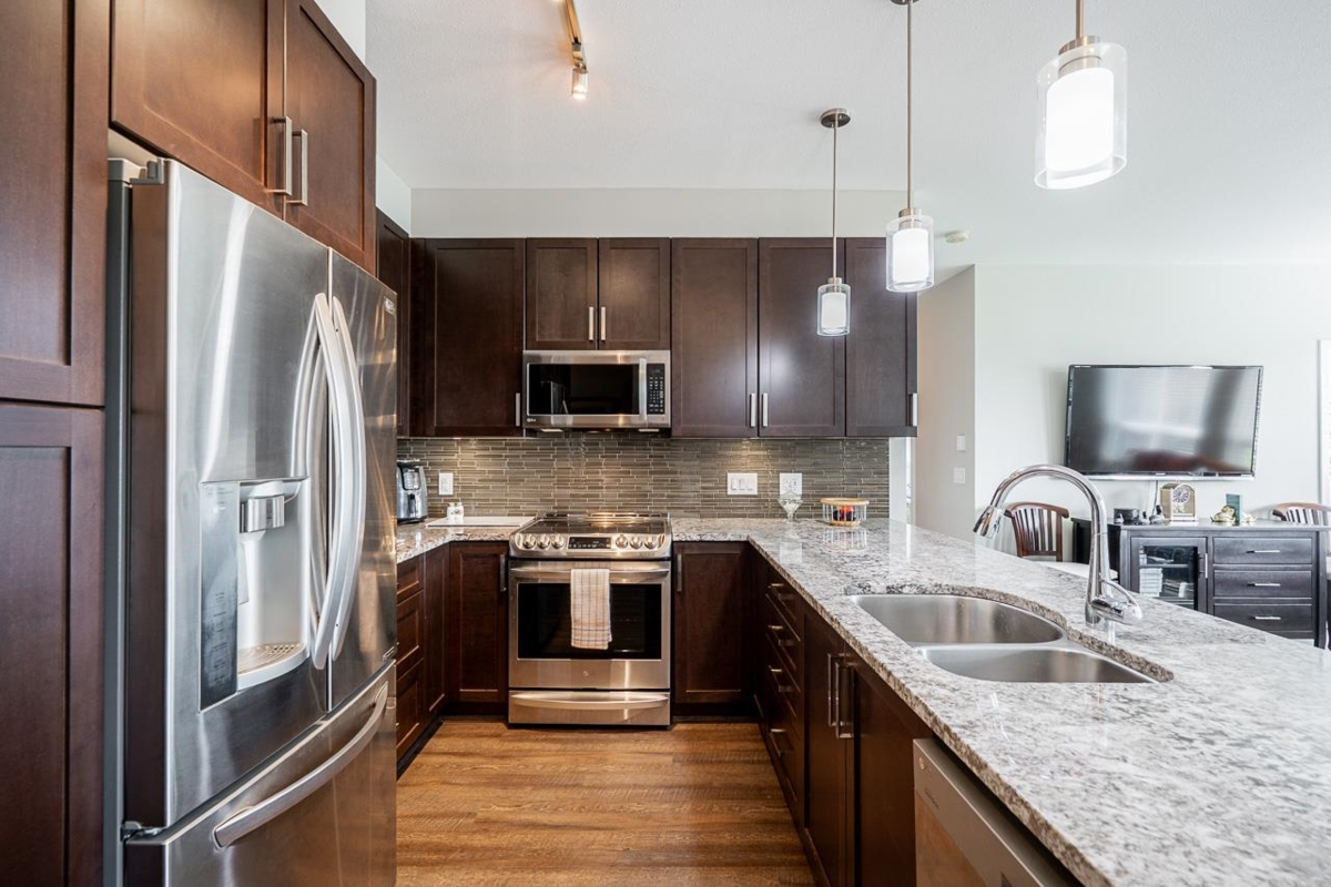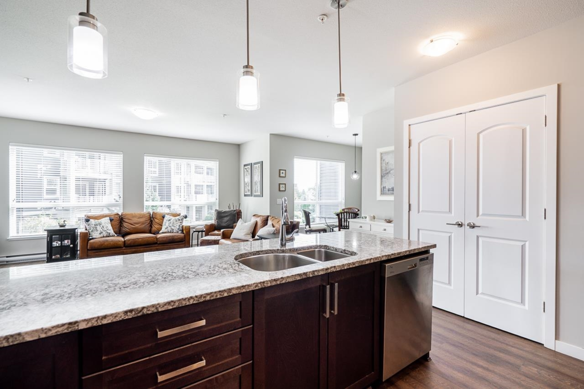 Award winning 'WATERSTONE' with deluxe facilities including pool & full gym! CORNER UNIT, 2 bedrooms + den, 2 bathrooms with wrap around deck facing greenspace! Oversized windows, high end kitchen featuring granite counters, S/S appliances and kitchen island with eating bar. Primary bedroom w/huge walk-in closet, 2nd 'corner' bedroom w/windows on 2 walls, huge wrap around deck, 2 underground secured parking spots & storage locker. 15,000 sq. ft. clubhouse, 60' indoor swimming pool, hot tub and saunas as well as pool table, 17 seat movie theater room, full gym! Great location close to future skytrain, Langley shopping, schools, and more. This is the one!