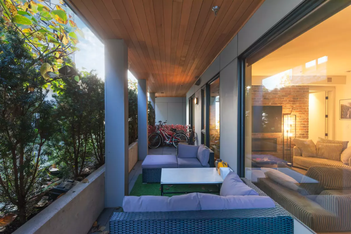 Prime Platform Building Central Port Moody; steps away from Rocky Point Pier, transit, shops, restaurants, breweries. Enjoy a waterfront lifestyle in this spacious end unit that offers 810 sq ft of open concept luxury living together w/ 206 sq ft private covered outdoor terrace. Home conveniently located on second floor inside a secure Courtyard w/ easy come and go access. One King Size bedroom w/ walk in closet plus 2 full bathrooms. Brick feature wall w/ fireplace in living area; hardwood floors; stainless appliances; kitchen island ; breakfast bar.; great area for entertaining both inside and outside on the Terrace w/ gas BBQ outlet / hose bib. Laundry room has extra storage space. Exercise center Bike room; one parking plus large storage locker included. Open House Sun Nov 30 1pm - 2pm