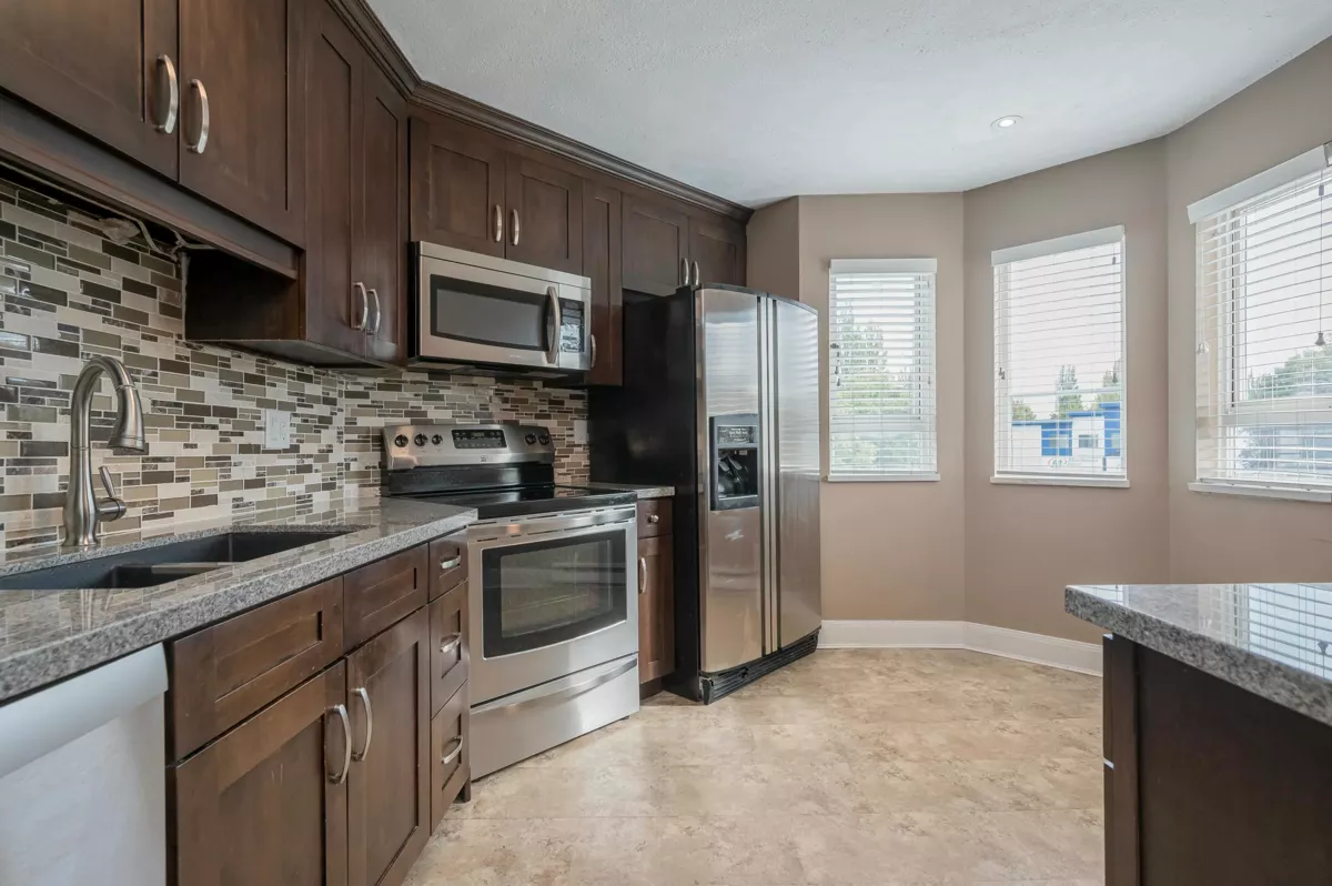 College Court! A great pet friendly complex, presents this 1005 sq ft END UNIT with 2 large bedrooms on opposite ends for privacy. Primary has 4 pc updated ensuite and the 2nd bedroom has a cheater ensuite as well! Newer kitchen with granite & S/S appliances ~ bright, spacious, with southern exposure providing tons of light. This unit comes with 2 secure underground parking spots and there is a bike storage area. In suite laundry, lots of storage & hot water is included in strata fee. Great rental for investors with Kwantlen Polytechnic steps away and near the upcoming new skytrain. Walk to shopping, transit & all amenities.
