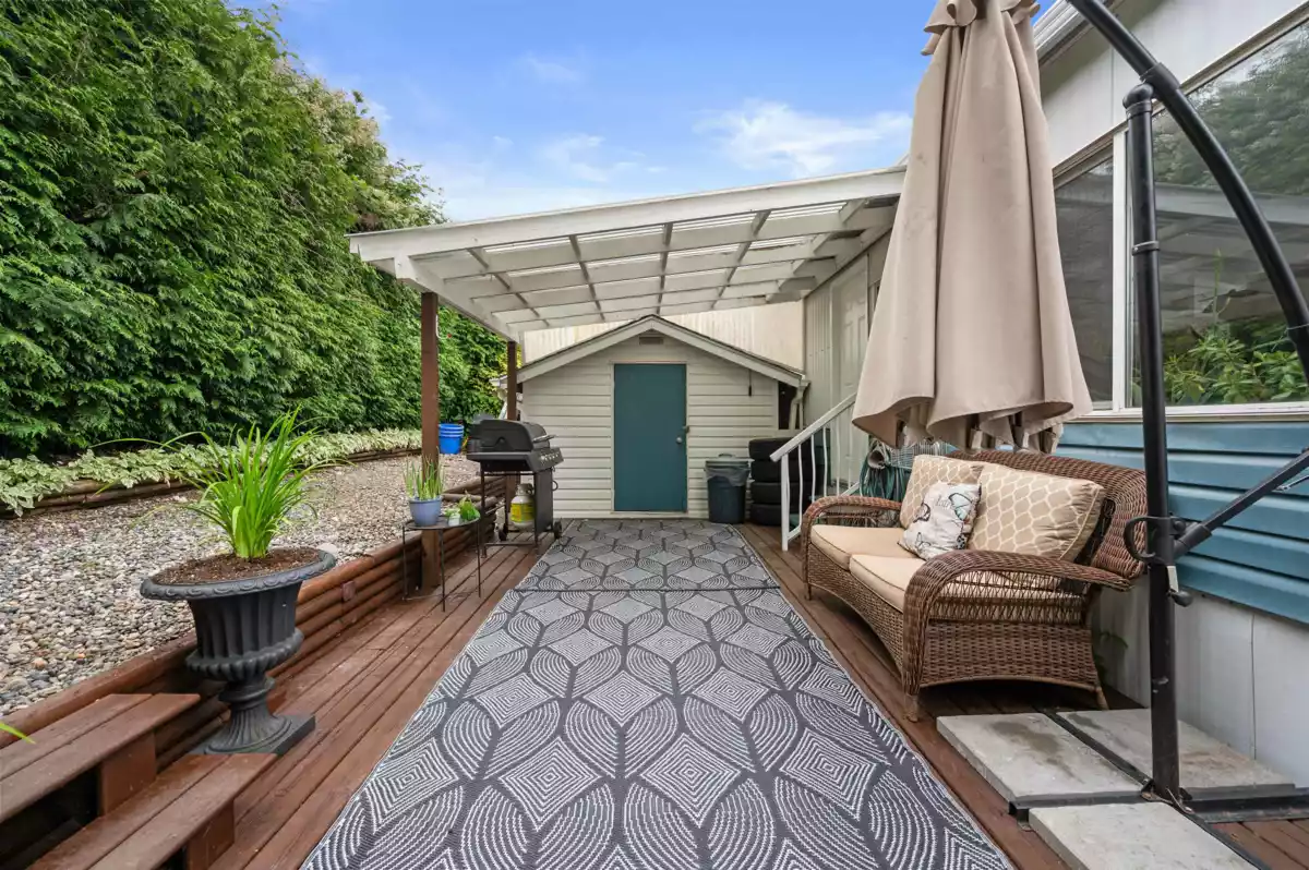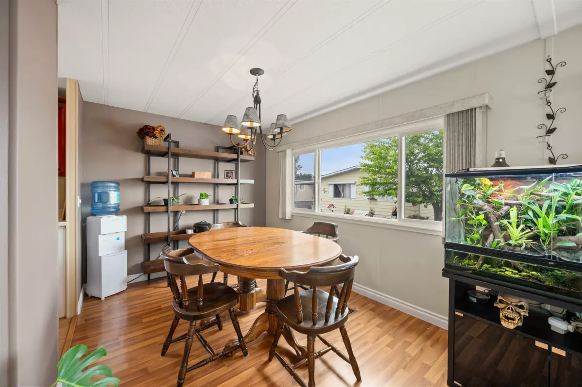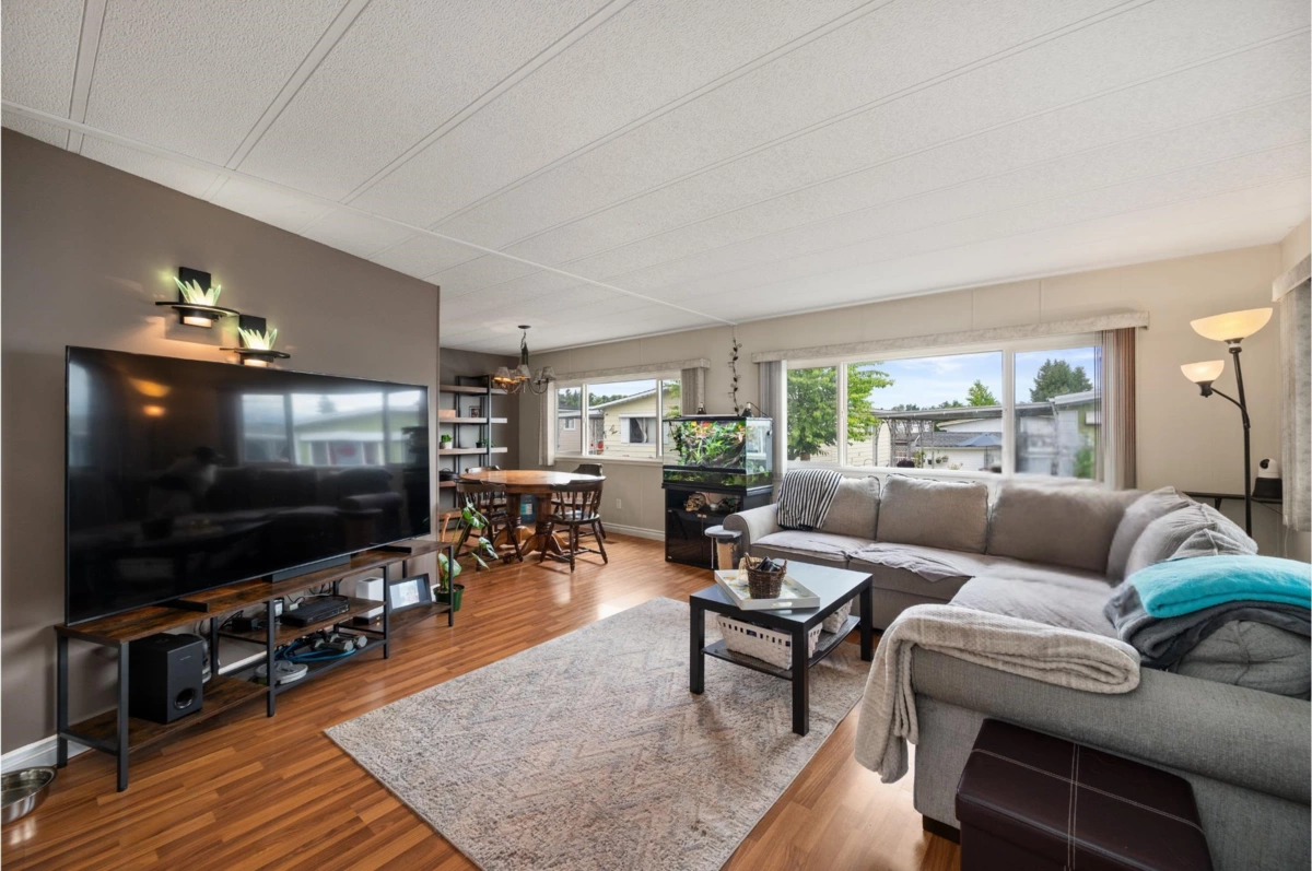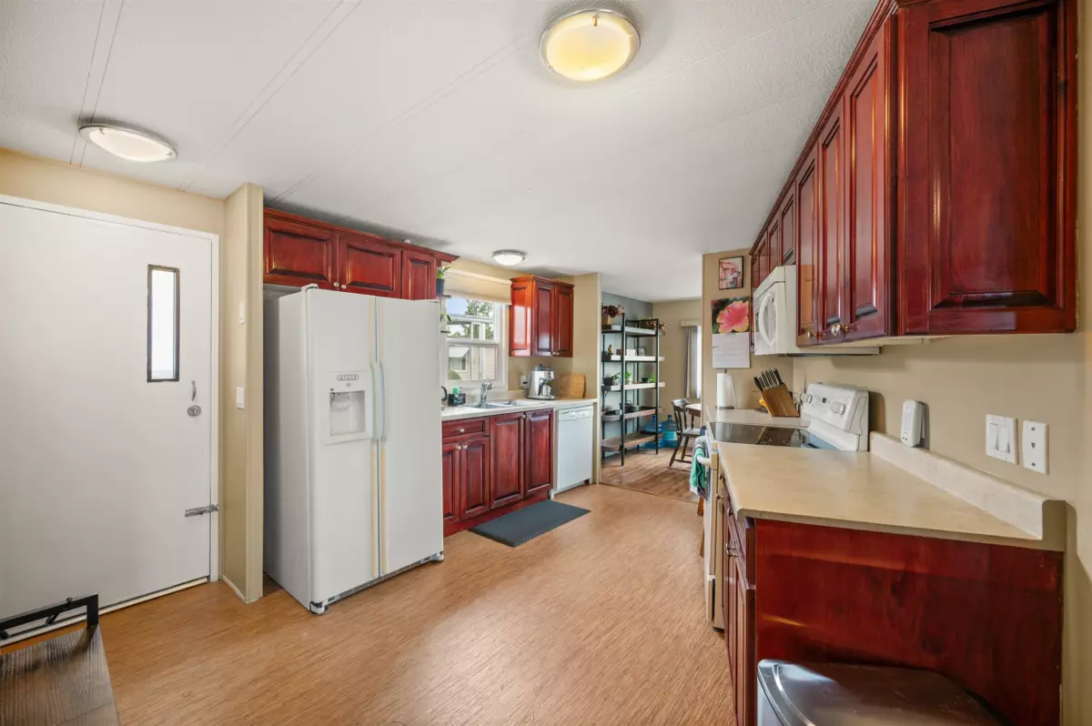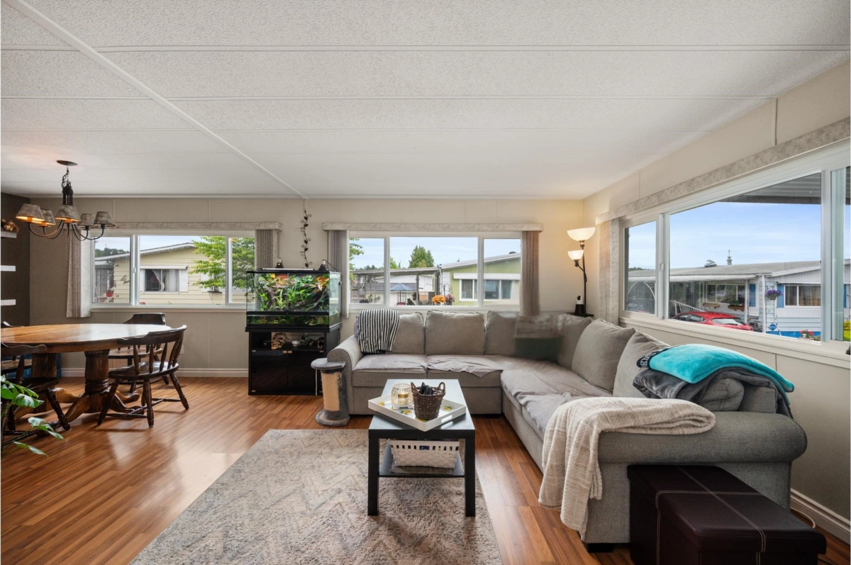 Enjoy a VERY PRIVATE, SOUTH FACING backyard lined with tall hedges, plus a WORKSHOP. This 2-bed, 2-bath double-wide offers a large living space, an updated kitchen, and a large sunroom. The primary bedroom includes a 4-piece ensuite, with the secondary bedroom having Jack-and-Jill access to the second bath. Features include a new torch-on roof (2025), windows (2019), A/C, and fresh updates. Pad rent only $911 includes water, sewer, garbage, and land taxes. Highly sought-after Westwood Estates is a quiet 55+ community where large dogs are welcome with manager approval. This is a must see!
