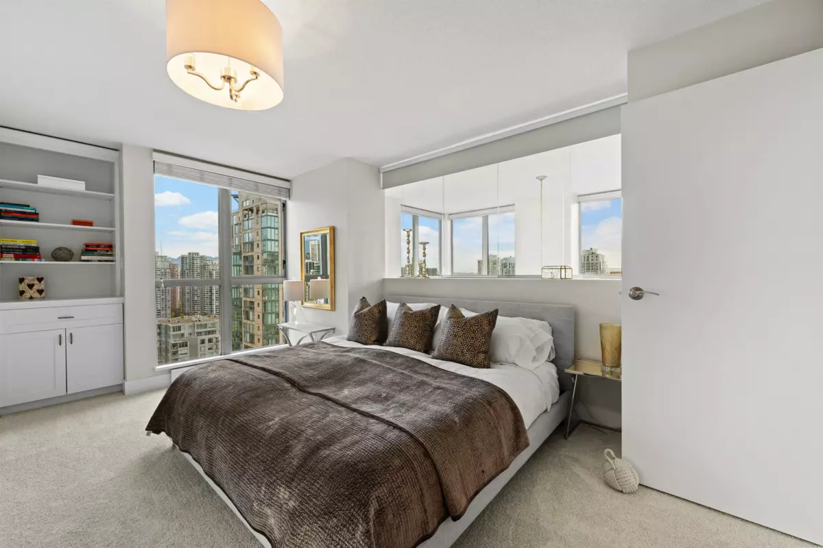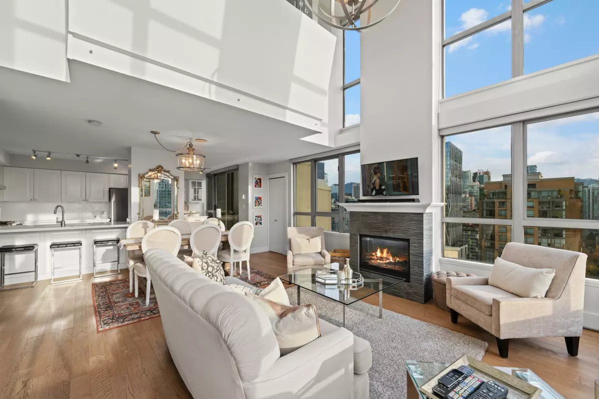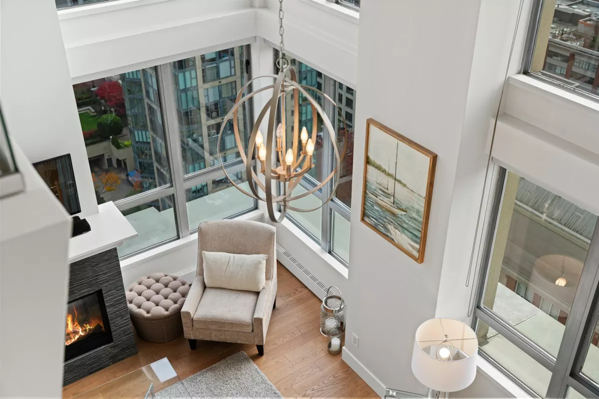 A true Yaletown icon. With 1,542 sq ft of living space, 16-foot ceilings, and panoramic city-to-mountain views, this bright two-level corner loft at The Metropolis delivers both style and comfort. The fluid layout merges a granite-clad kitchen and open dining area with a dramatic double-height living room wrapped in glass and filled with natural light. Upstairs, the mezzanine reveals the primary suite with dual closets, ensuite, and a versatile den. A second bedroom on the main level provides ideal separation for guests. Set within a well-managed concrete building all just steps from the Seawall, parks, cafés, and Yaletown shopping. Open House: Saturday, Nov 22nd, 1-3 PM