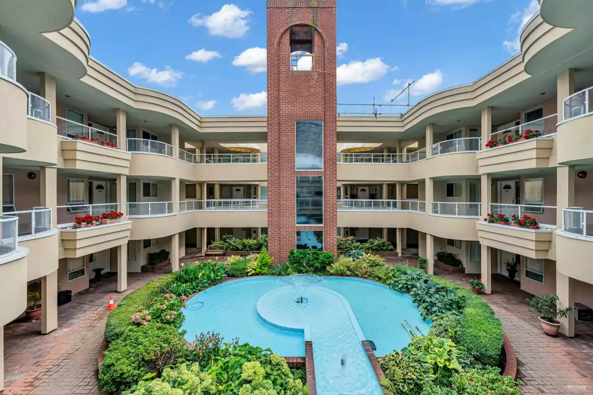 Prestigious “Renaissance” in the heart of Richmond, next to Richmond High (has IB program). Walk to Minoru Park & Pool, Richmond Centre Mall, City’s Centre for Active Living, Library, Senior Centre, Canada Line, etc. Quiet inside south facing 2-bdrm + den 1,285 sf spacious & bright unit. 80sf covered balcony looking onto greenbelt. Den is big enough to be the 3rd bedroom. Kitchen has eating area, entertainment sized living & dining area. Gas F/P. Wood flooring except tiled kitchen & bath. Efficient hot water heating. Unit has been lovingly cared for & shows very well. Complex has beautiful water fountain feature, exercise pool/hot tub, sauna & party/meeting room. One secured parking. In-suite laundry & storage.