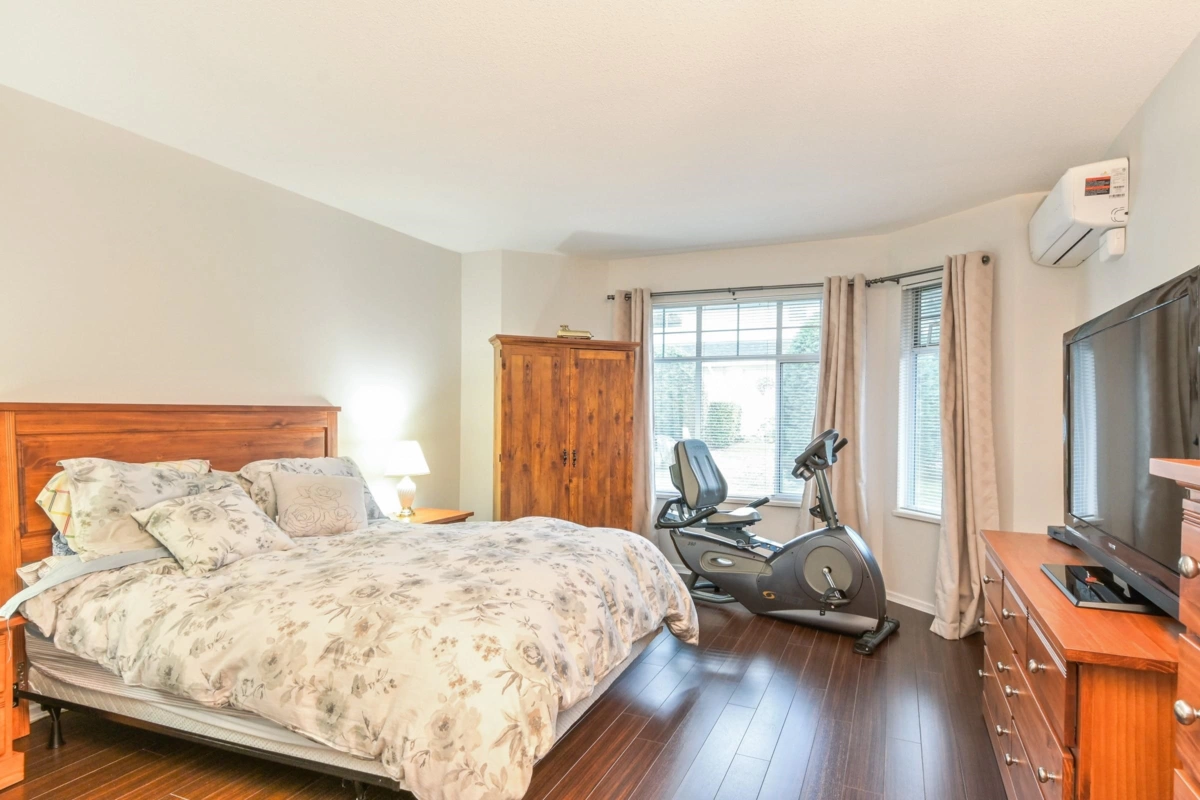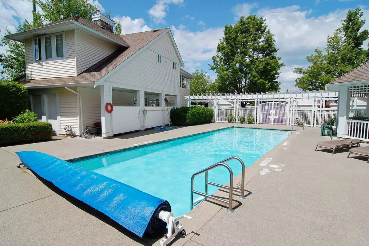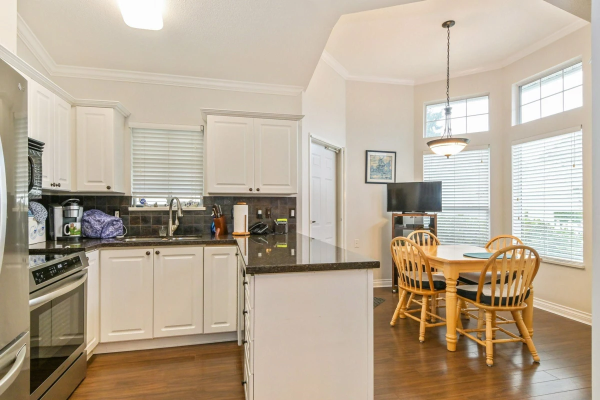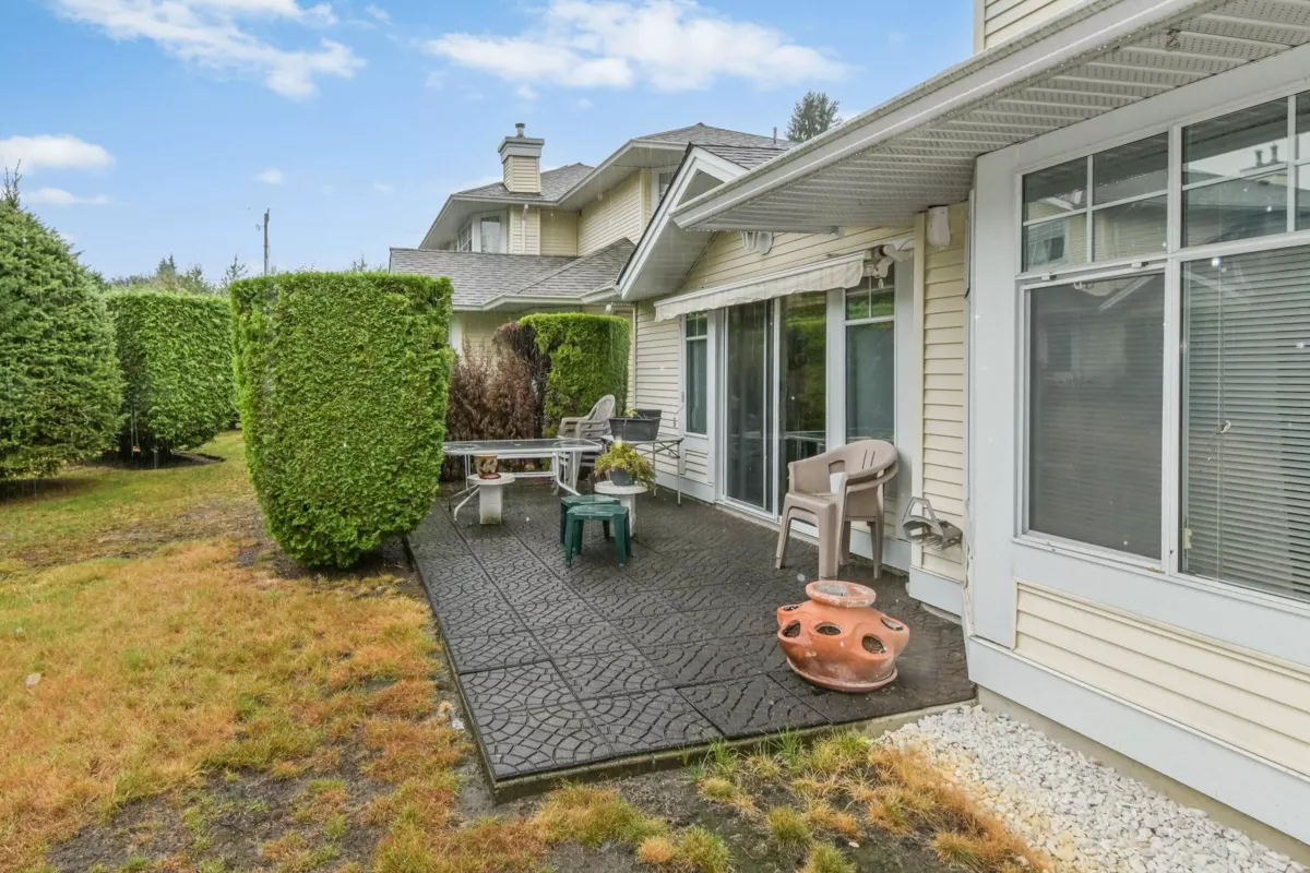 Churchill Park: sought after complex in Walnut Grove, featuring the primary bedroom on the main level with spacious ensuite with separate tub and shower. Interior upgrades include air conditioning, hot water on demand, counter tops with undermount sink, updated fridge and induction stove. The bright and sunny eating area is surrounded by windows with small patio. Laminate flooring on both levels. Spacious and sunny south facing patio off the living room. Located in a quiet area of the complex with privacy screens and trees. This friendly complex offers extensive amenities and is located close to parks and walking trails.