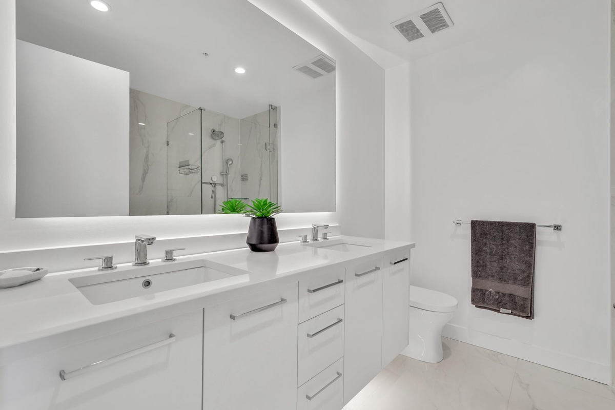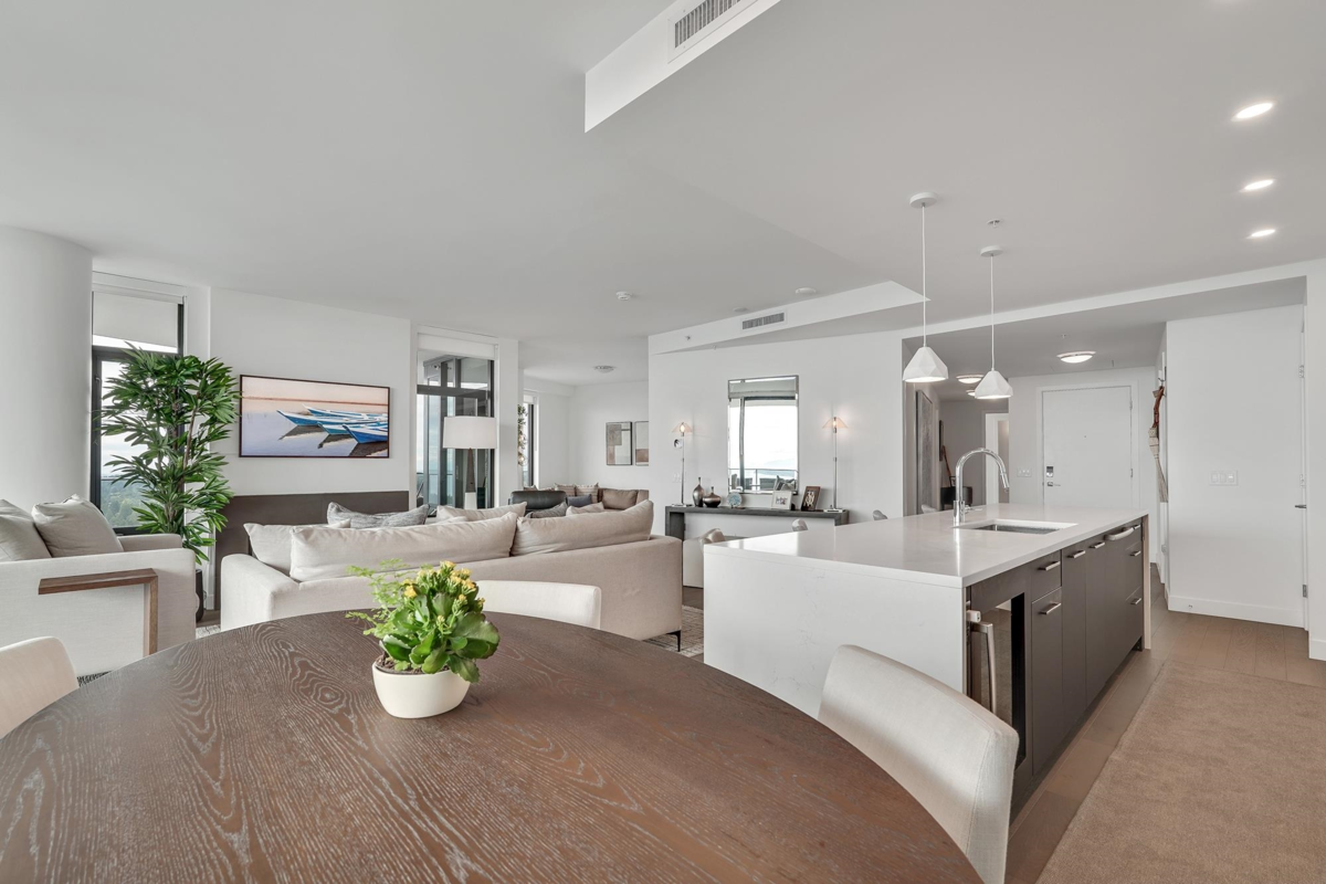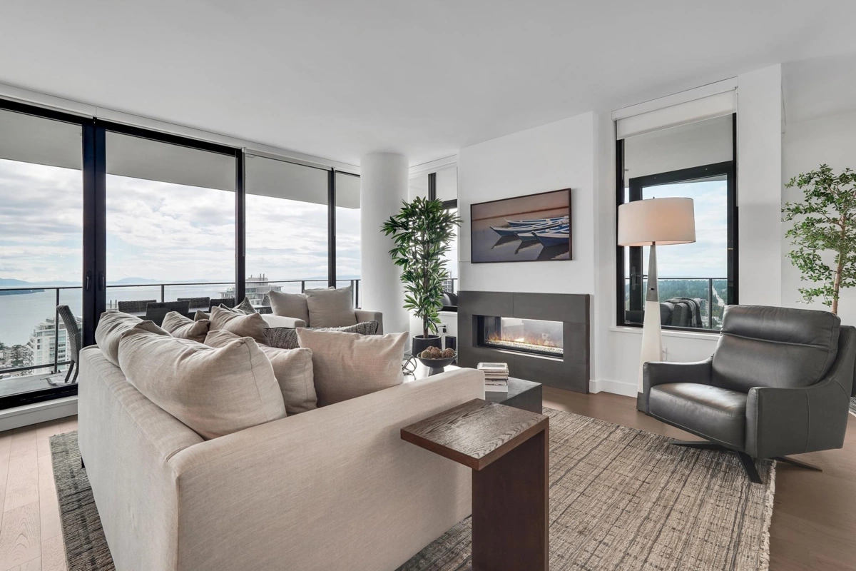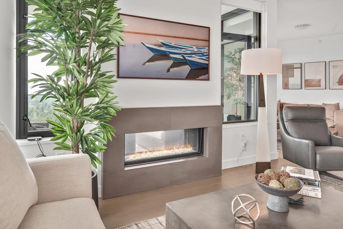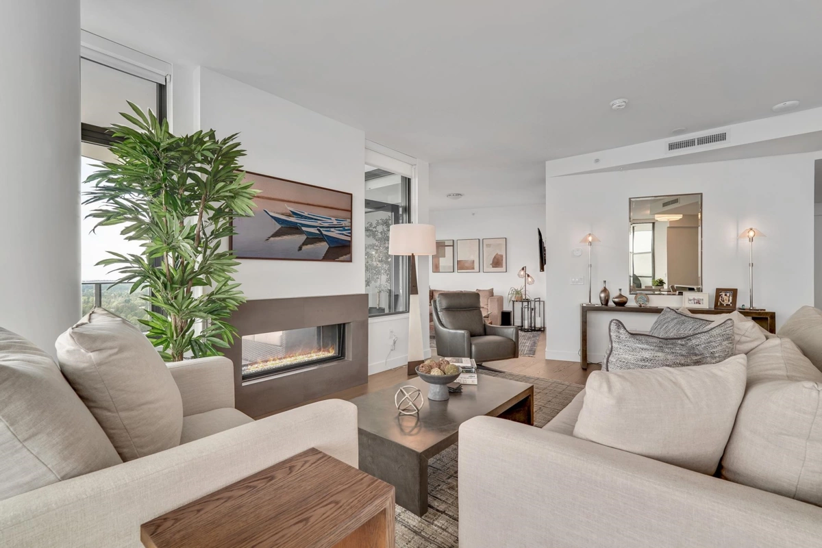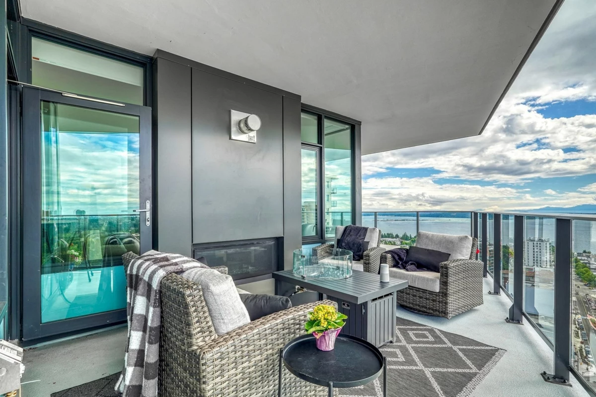 Exquisite Southwest - facing residence with panoramic ocean & mountain vistas. The Gourmet kitchen features quartz surfaces & premium Bosch appliances. 1428 Sq ft of sophisticated living with 2 generously sized bedrooms, each with ensuites, plus elegant powder room. Indoor-outdoor fireplace enhances seamless entertaining from the 549 Sq ft wrap around deck with stunning views. Comfort is elevated with climate-controlled air throughout, 3 rare side-by-side parking stalls with EV charging and resort-style amenities complete this premier White Rock offering. Walk to beaches, pier, groceries, restaurants and cafes - only 40 minutes to Vancouver. Experience unparalleled coastal luxury at its finest.